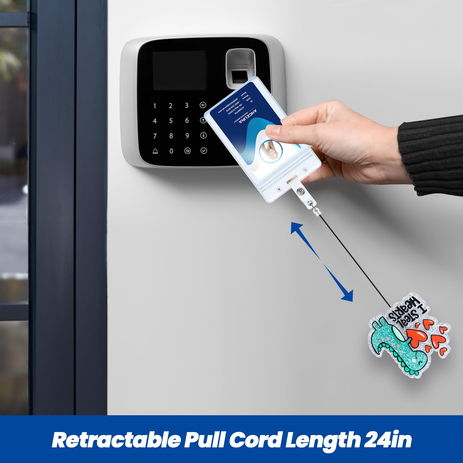 Retractable Cord: The retractable reel cord extends a maximum of 24 inches, more than enough to reach comfortably as far as your arm can reach. The flexible retractable feature enables you to effortlessly display your badge without removing it, enhancing your efficiency at work.