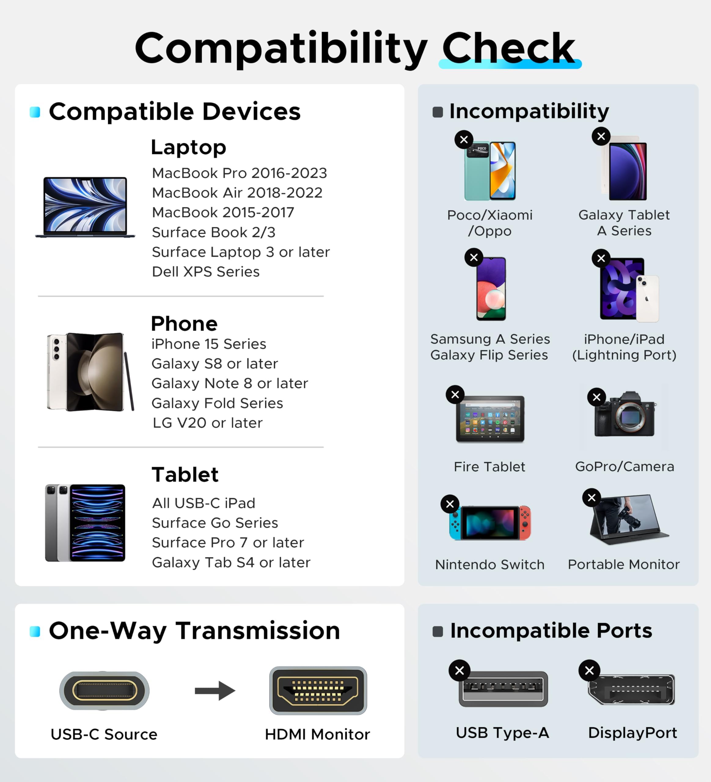 [Extensive Compatibility] Designed for Type C ports with video output capability (DP Alt Mode) and Thunderbolt 3 & 4. Enjoy compatibility with a wide range of devices, including iPhone 15 Series, Apple MacBook Pro (2016 and later), iMac (2017 and later), MacBook Air (2018 and later), iPad Pro (2021 and later), Mac Studio, Mac Pro, Surface Book 2/3, Surface Laptop 3, Dell XPS 15/13, HP Chromebook x360, Samsung Galaxy S23/S22/S21/S20/S10/S9/S8, Note 20/10/9/8, LG V42, Steam Deck, and more.