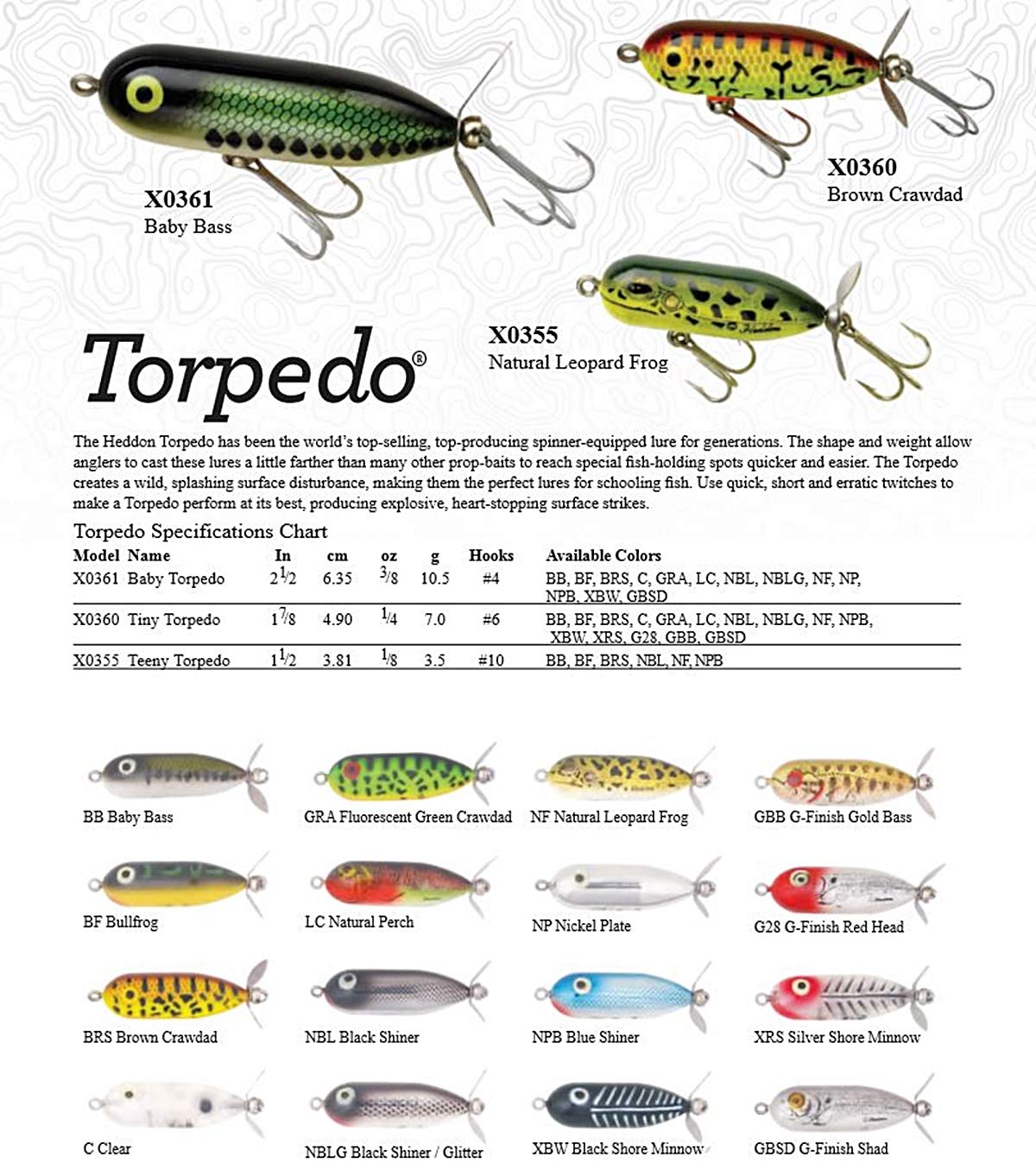 The Heddon Torpedo has been the world’s top-selling, top-producing spinner-equipped lure for generations. The shape and weight allow anglers to cast these lures a little farther than many other prop-baits to reach special fish-holding spots quicker and easier. The Torpedo creates a wild, splashing surface disturbance, making them the perfect lures for schooling fish. Use quick, short and erratic twitches to make a Torpedo perform at its best, producing explosive, heart-stopping surface strikes.