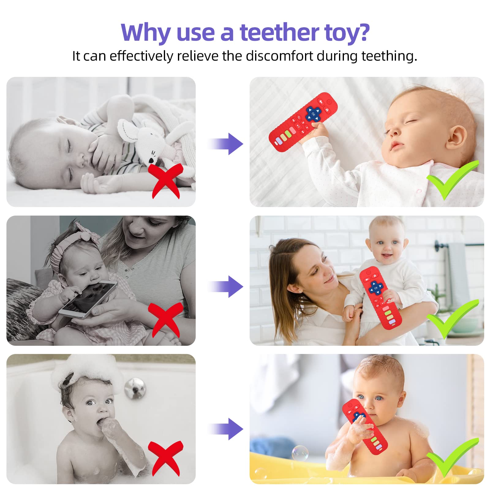 【Baby Teething Relief】Each molar toy has a raised design to soothe and massage baby's swollen gums, and help baby to relieve irritability and discomfort during teething.