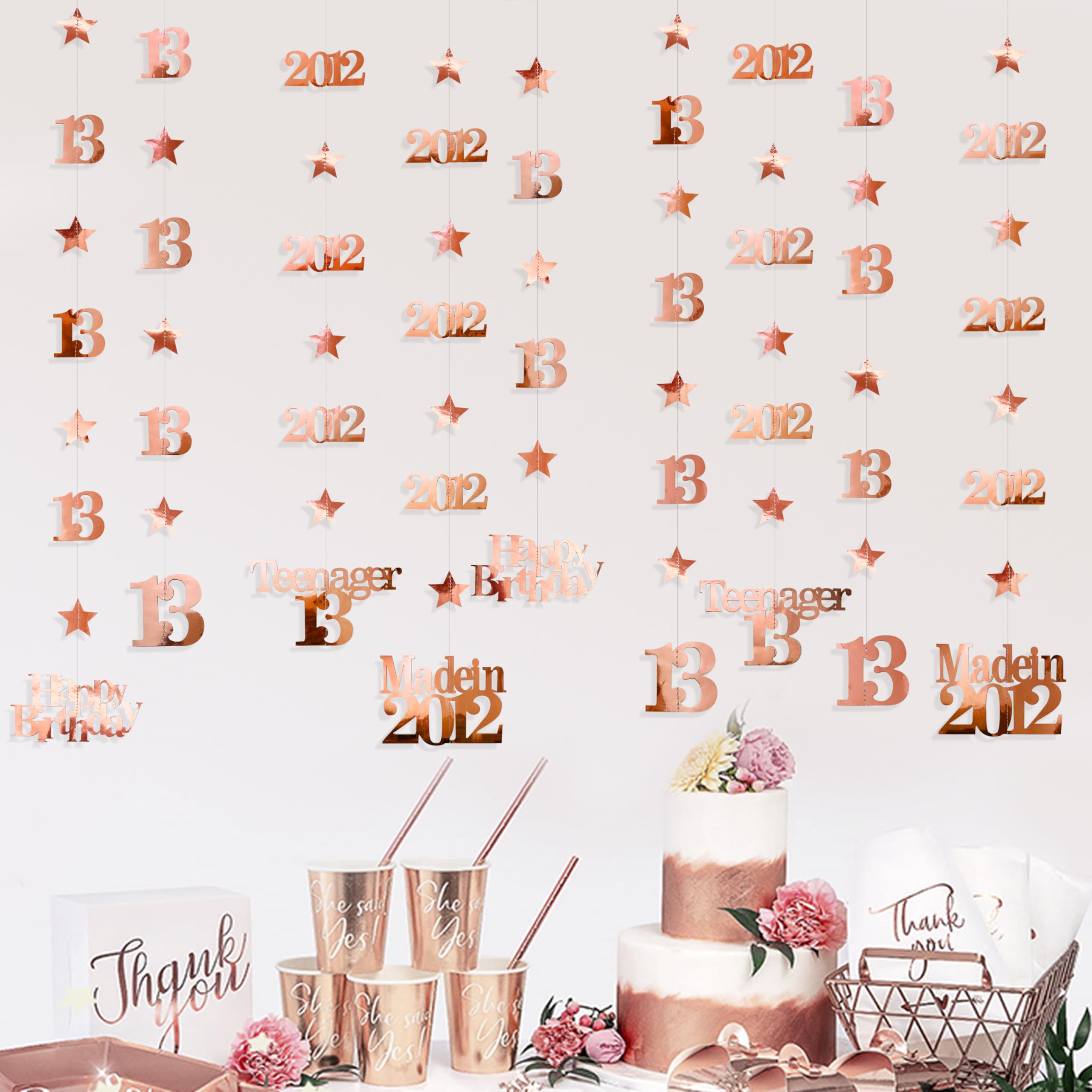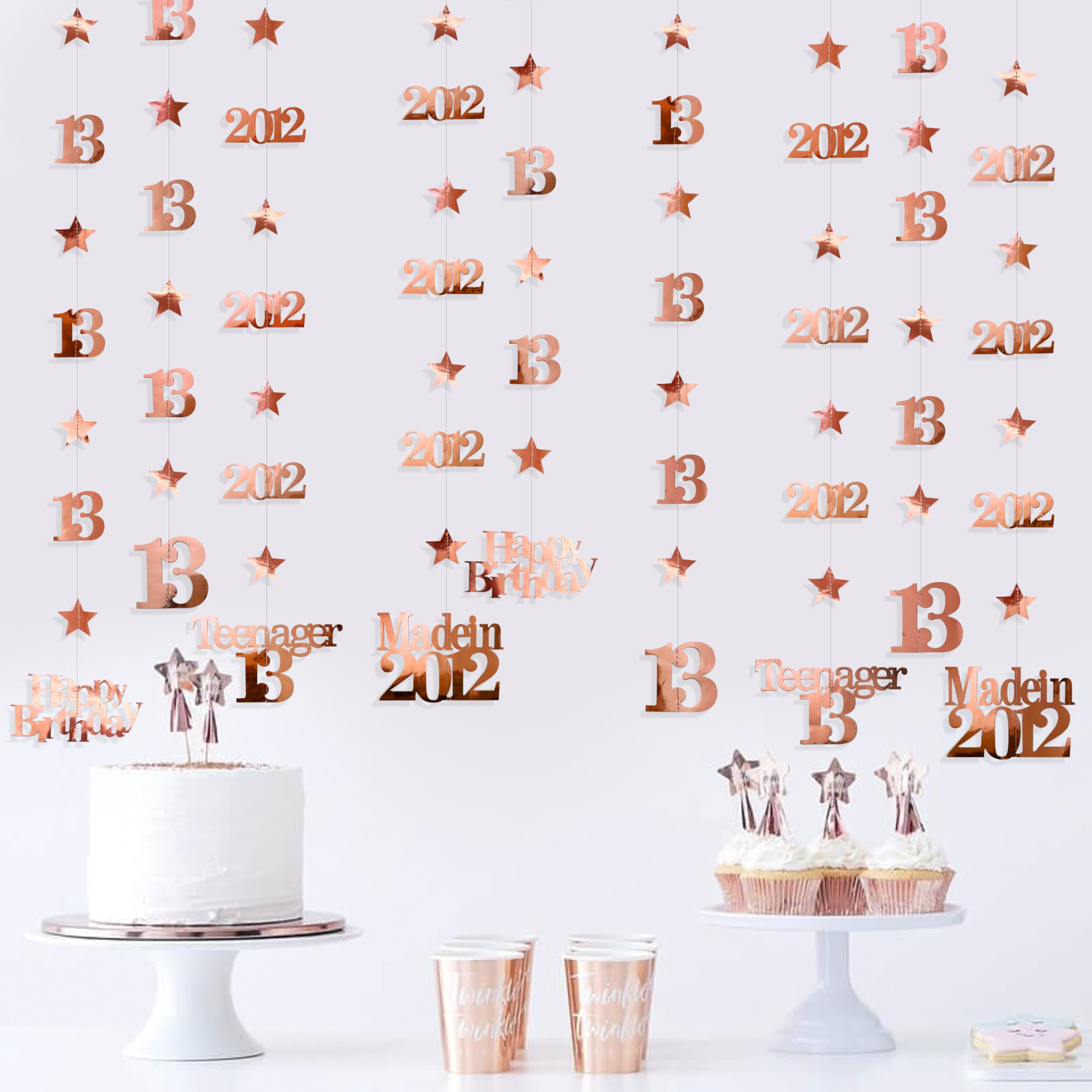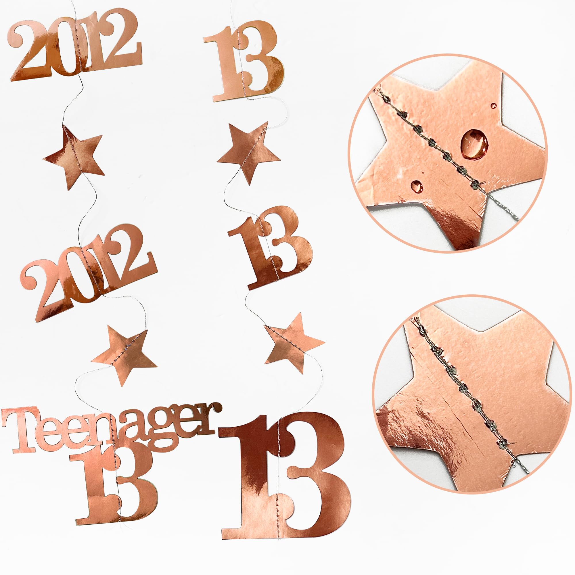 👍 Package includes - 12 strings of metallic rose gold 13th birthday theme sparkling twinkle star garlands with 13, Happy Birthday, Teenager 13 and Made in 2012 cutouts (in 4 styles) , each string is 4.7 feet/1.45 meters, totally is 56.4 feet/17 meters.