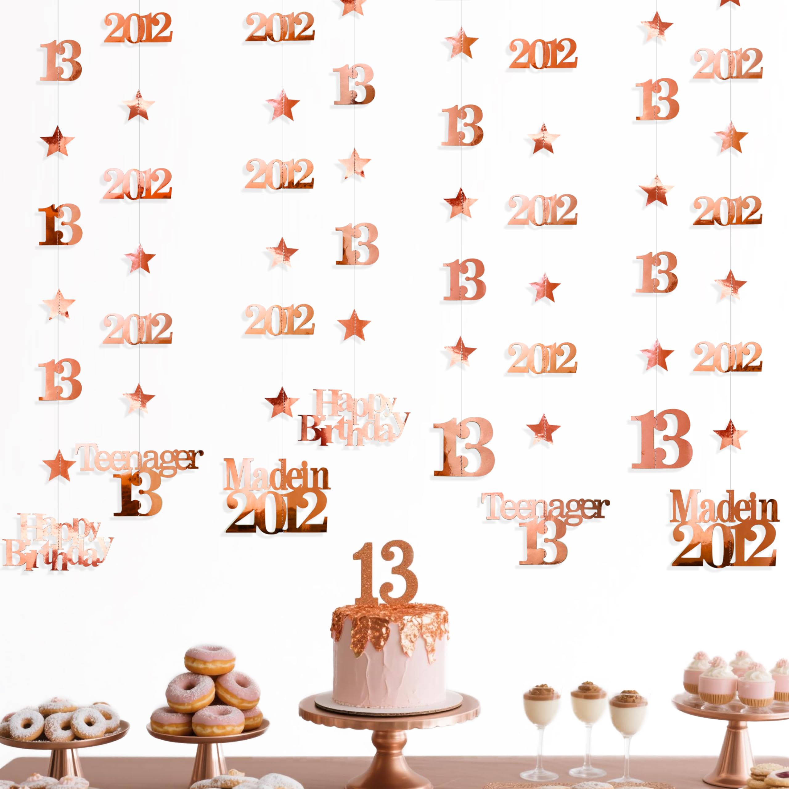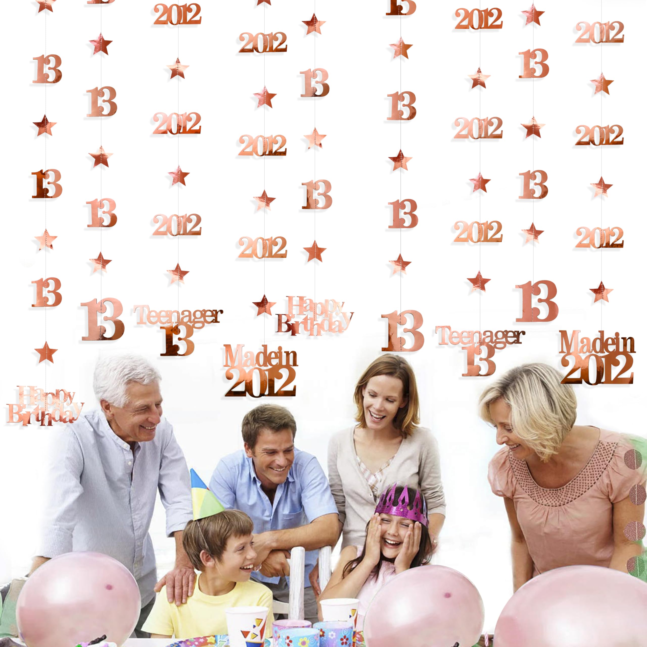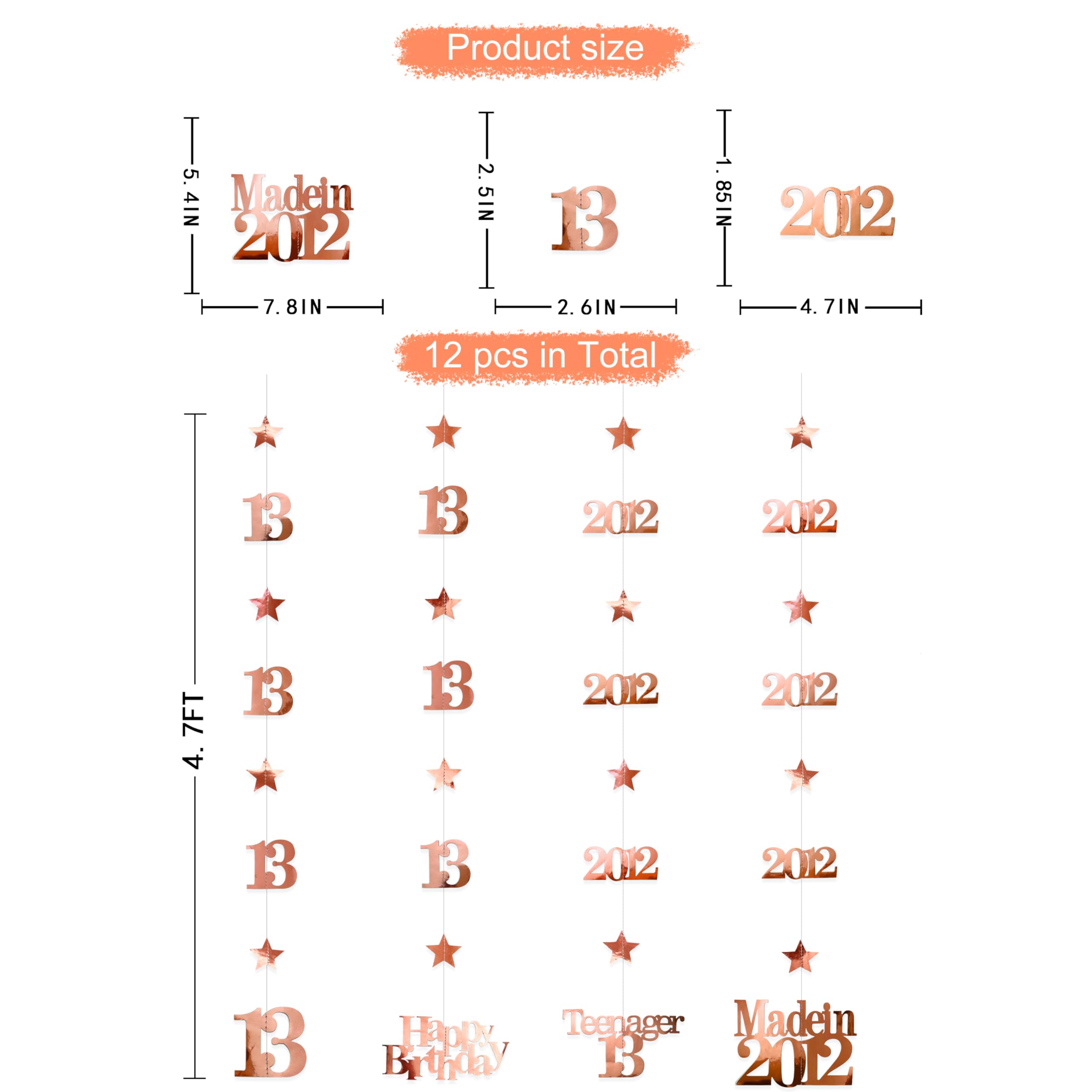👍 Package includes - 12 strings of metallic rose gold 13th birthday theme sparkling twinkle star garlands with 13, Happy Birthday, Teenager 13 and Made in 2012 cutouts (in 4 styles) , each string is 4.7 feet/1.45 meters, totally is 56.4 feet/17 meters.