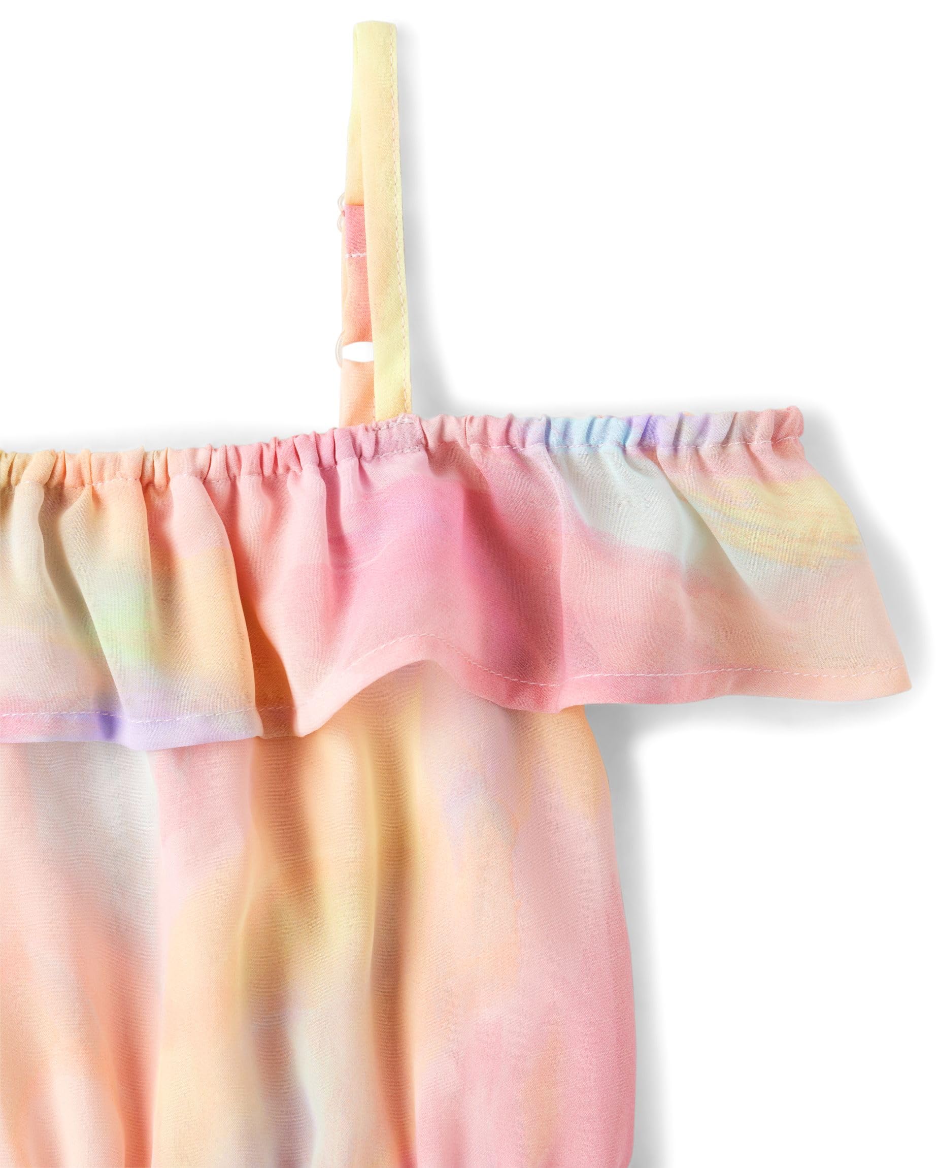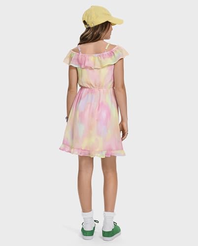 FIT & DESIGN: Elasticized off-shoulder ruffle neck, adjustable straps, ruffle hem, above-knee length