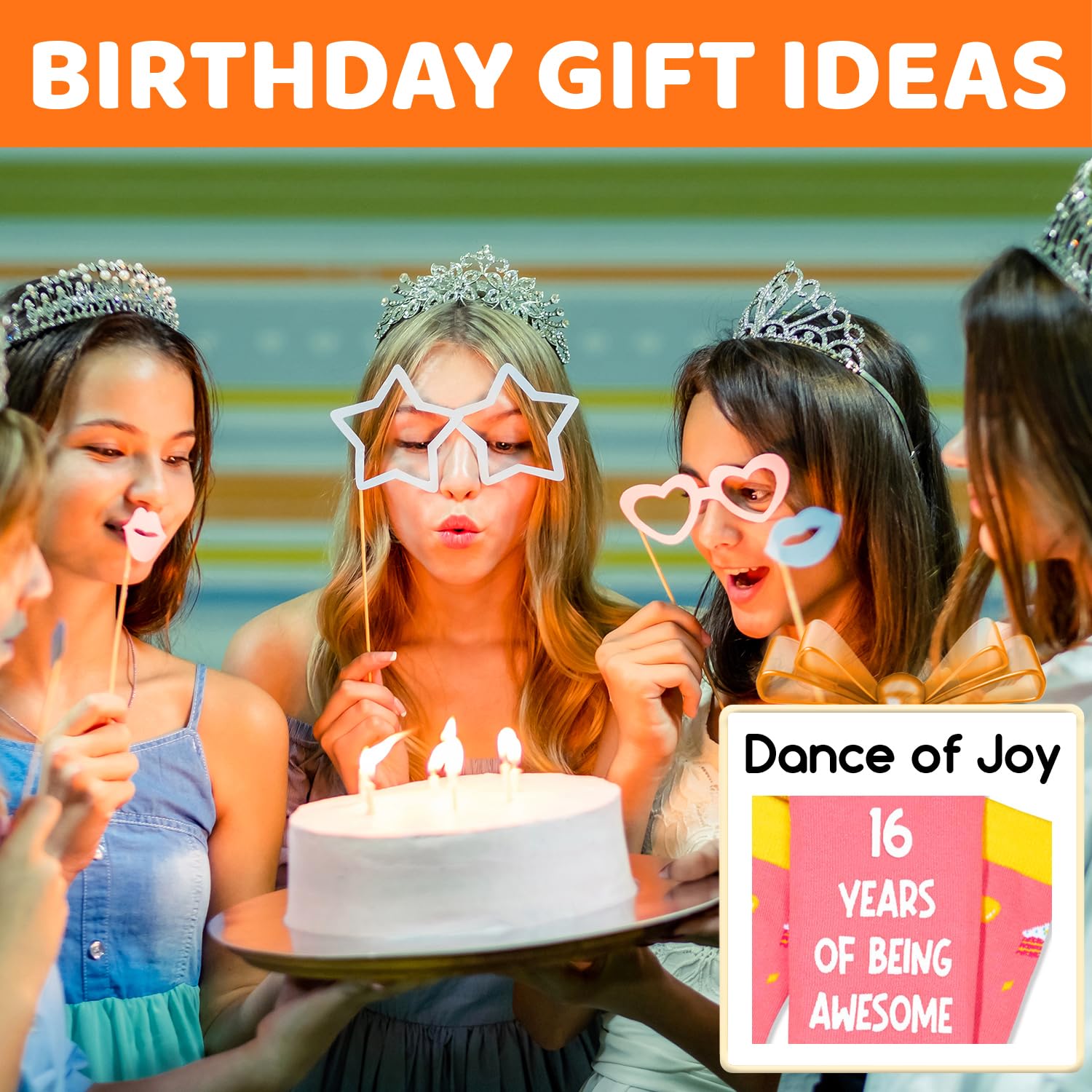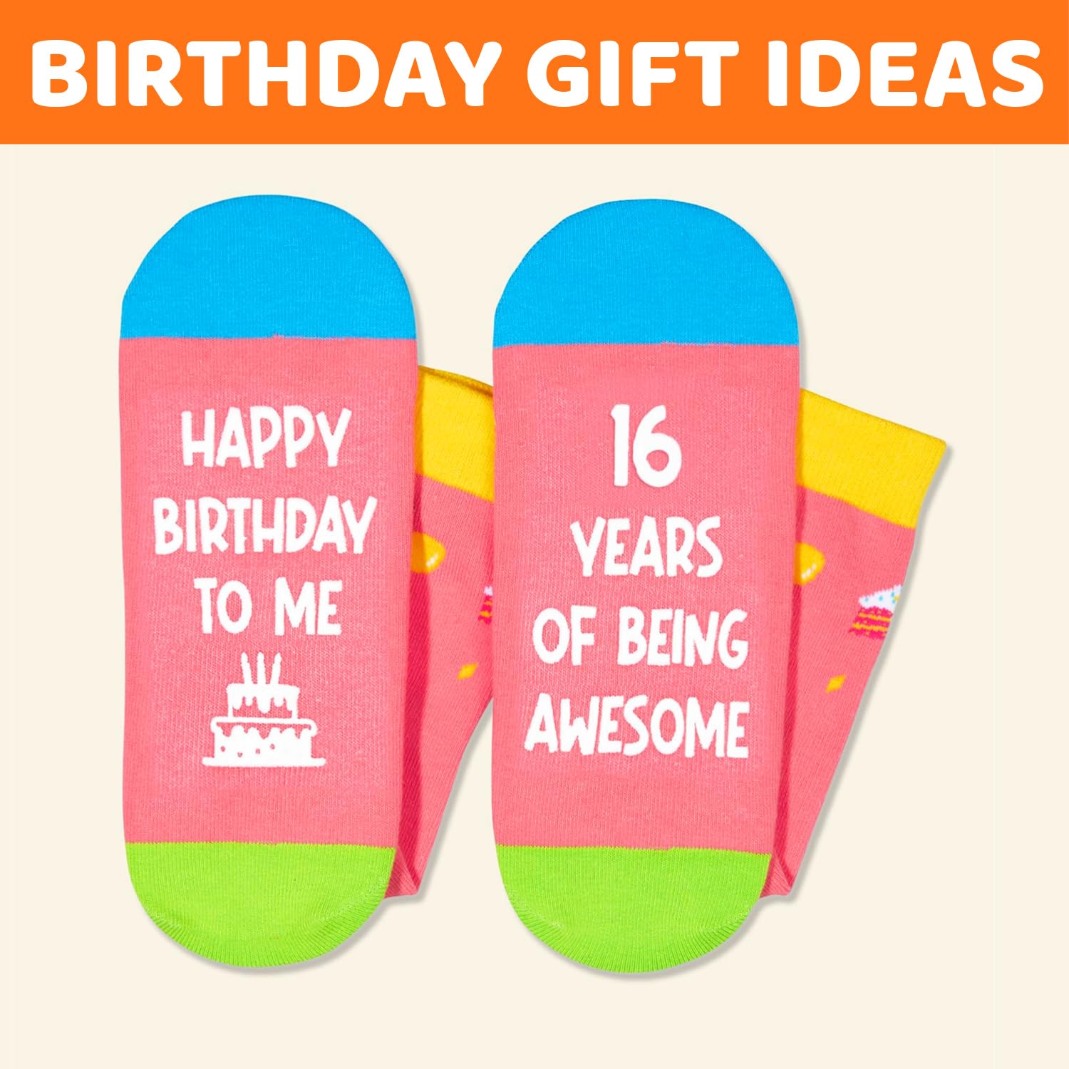 GIFTS FOR 16 YEAR OLD GIRL: These pink "HAPPY BIRTHDAY TO ME, 16 YEARS OF BEING AWESOME" socks are perfect for teen girls.