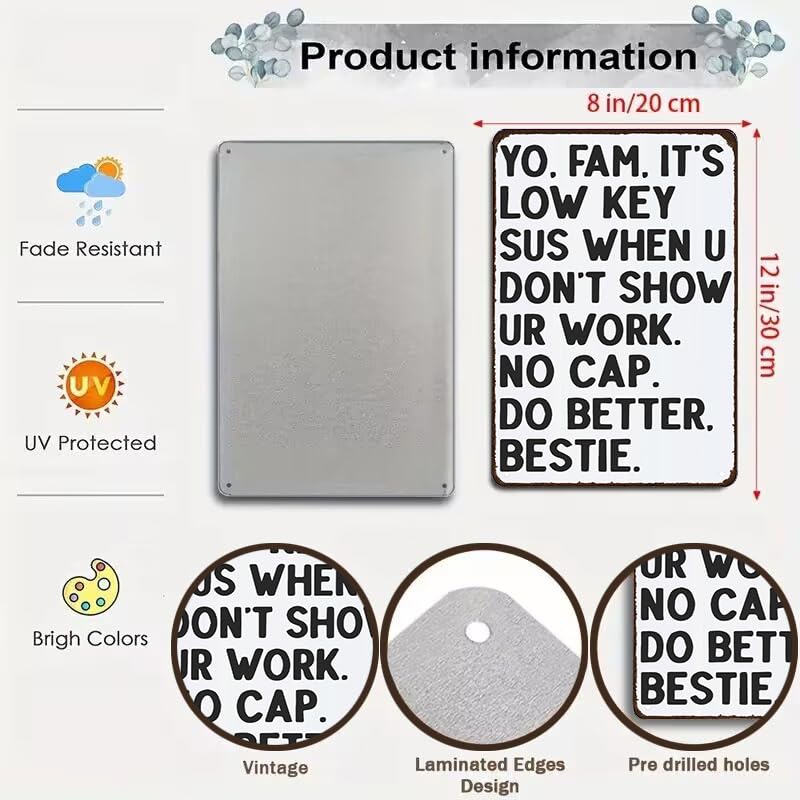 Humorous Classroom Decor: This tin sign features a funny and relatable message, "It's Low Key Sus When U Don't Show Ur Work," making it a perfect addition to any math, English, science, or history classroom