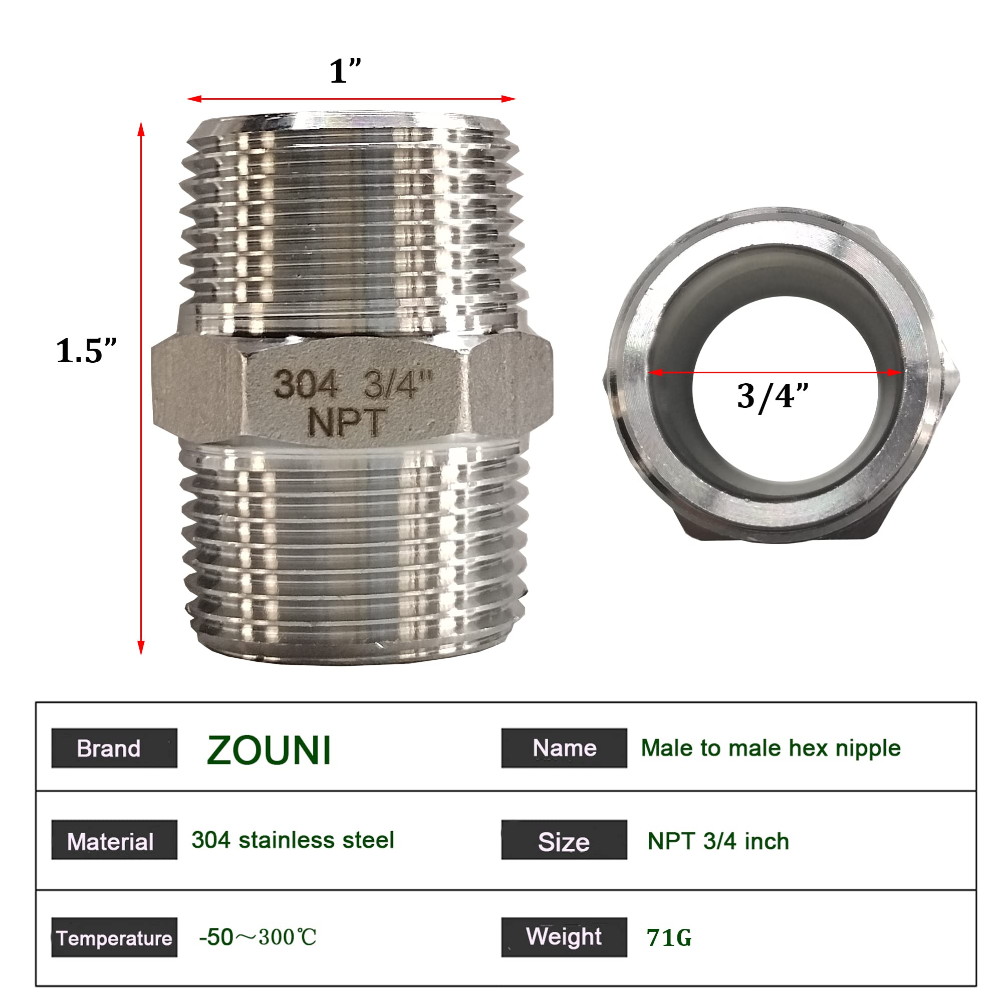 SIZE: 3/4" Male x 3/4" Male NPT Thread Hex Nipple, Pipe fittings adapter for connecting two NPT female threaded pipes.