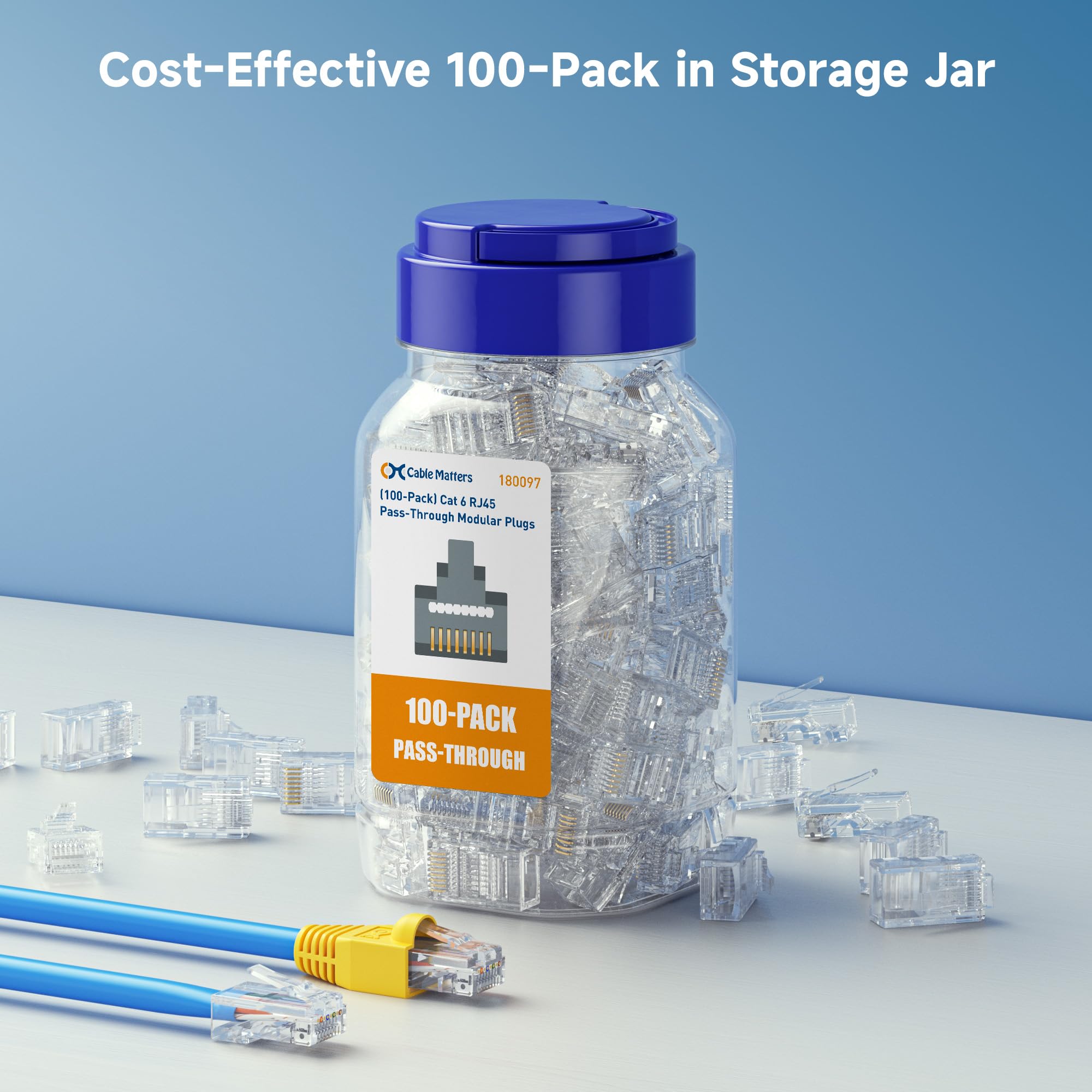 Value Pack of 100 Cat 6 RJ45 Connectors: This 100-pack of Cat6 pass through connectors is perfect for large projects or multiple installations. Ideal for routers, patch panels, and workstations, these Ethernet connectors (Ethernet ends) work seamlessly with Cable Matters RJ45 Strain Relief Boots for extra durability.