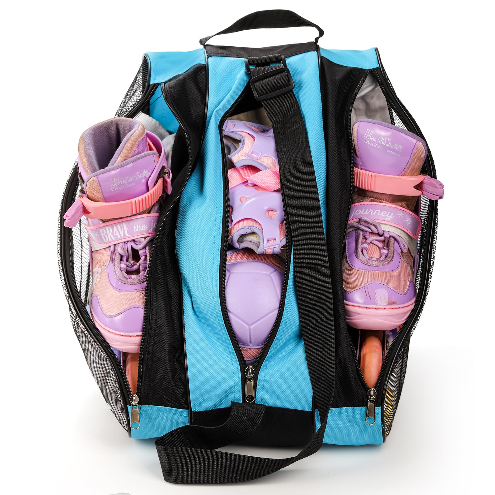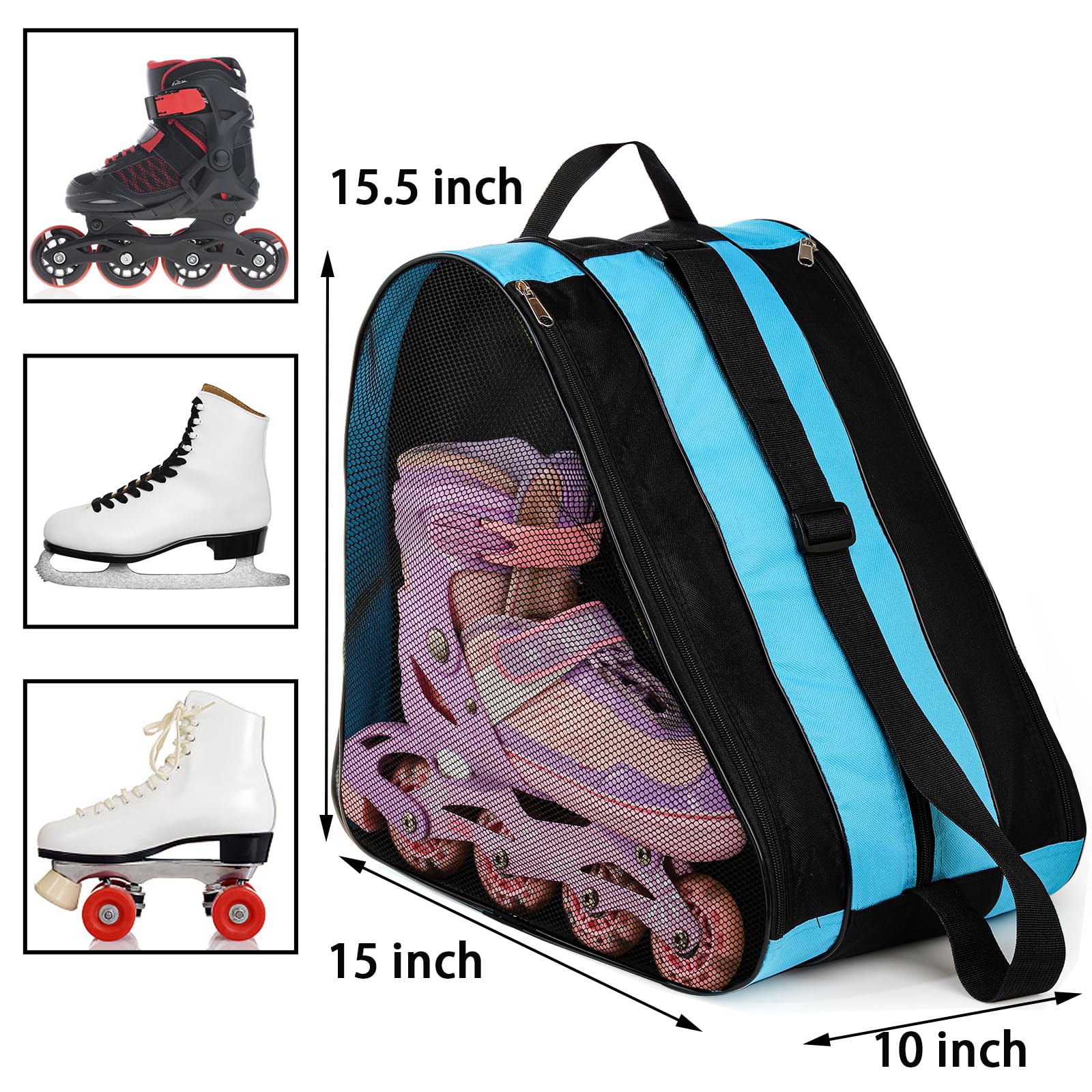 The size of the quad skates bags is 15.5"(H)x 15"(L)x 10"(W), the sport bags are very practical, feature three pockets, the side mesh pockets fit for storing roller skates, ice skate, kids in-line skates, roller blades, figure skate, ice hockey skate, etc., the center large pocket work great for holding all your PPE, wrist guards, elbow pads, socks, knee guards, towel, outfits, etc.