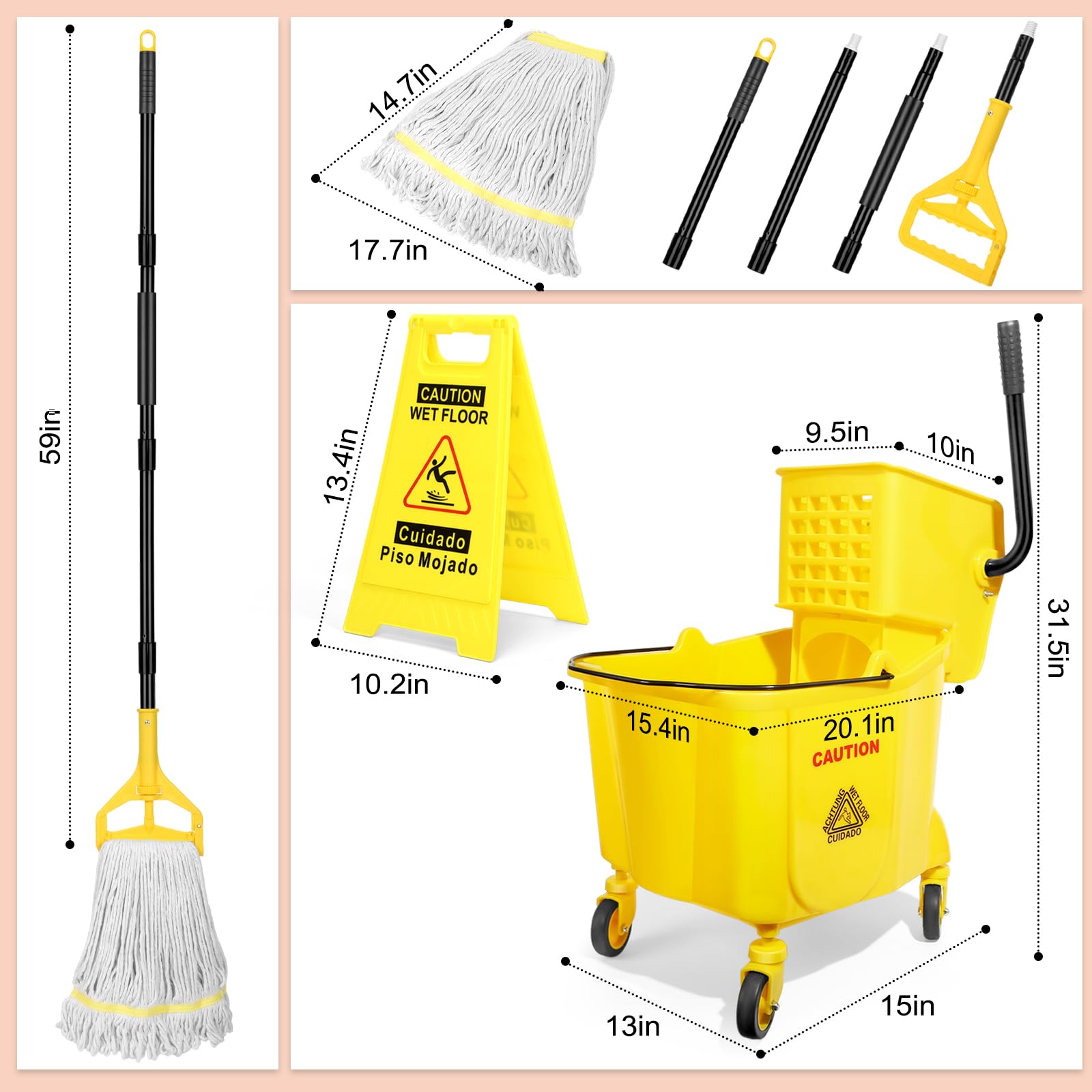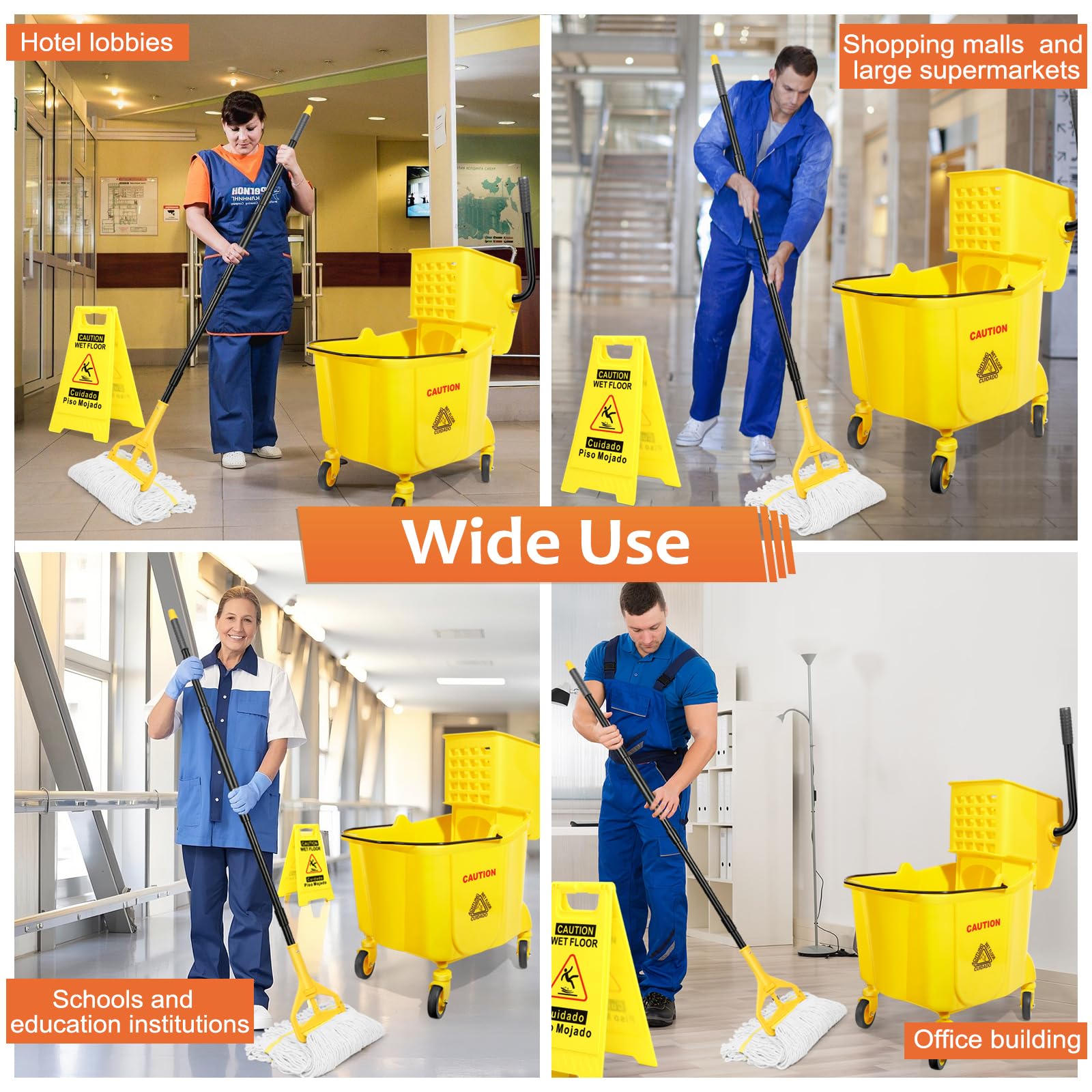 ✨ Industrial Mop and Bucket Combo: Commercial cleaning kit includes an industrial mop bucket with wringer on wheels ,a cotton mop and wet floor caution sign, providing an economical all-in-one solution. Ideal for daily use in homes, courtyard, warehouse,offices, hotels, hospitals, banks, restaurants and commercial places.