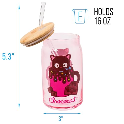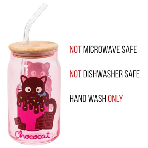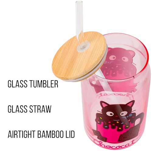 Add a touch of sweetness to your hydration routine with this Chococat glass tumbler! This glass tumbler features the adorable Chococat in a chocolate coated mug. Written beneath the mug, in pink cursive, is “Chococat.” Chocolate bars surround the adorable design. Glass tumbler is pink. This adorable image of Chococat expresses his adorable personality. This Kawaii character is sure to bring a smile to your face. Glass tumbler is complete with a bamboo lid and glass straw, promoting eco-conscious living. Perfect for life on the go, this glass tumbler holds up to 16 ounces of your favorite beverage and comes with a secure bamboo lid to ensure mess-free hydration wherever you wander. Especially ideal for car use, sporting events, and picnics! HAND WASH ONLY, NOT microwave safe. Looking for the perfect gift? This glass tumbler is an adorable addition to any collection. Makes a great Christmas, birthday, or housewarming gift for Chococat fans of all ages! Take a dive into the fictional world with Silver Buffalo! Silver Buffalo provides fans with official merchandise from their favorite characters. Working alongside licensors and brands, we create unique and imaginative products which are designed with great care and detail. Silver Buffalo aims to connect fans to their favorite cartoon characters, superheroes, movies, tv-series, and more. Celebrate your fandom!