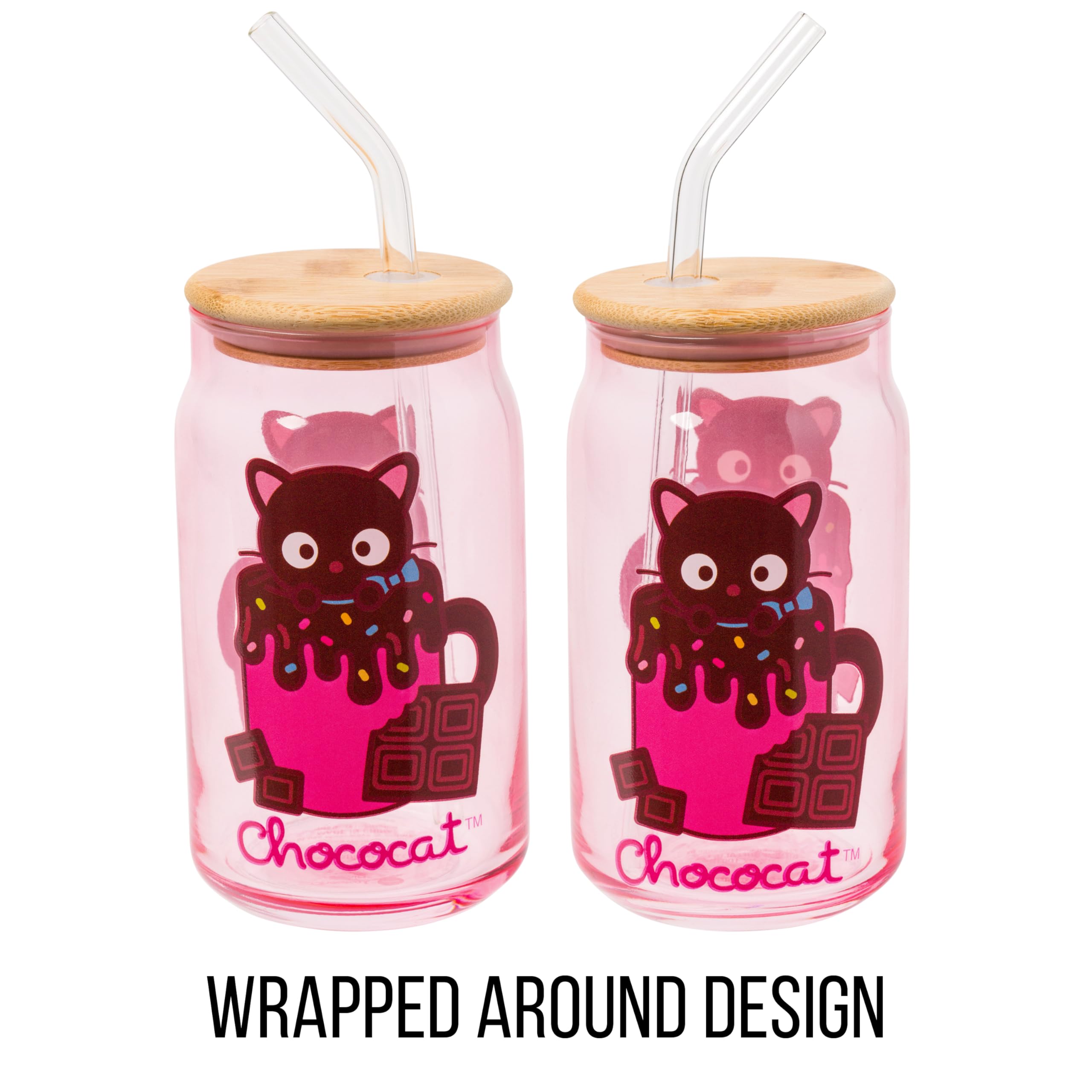 CHOCOCAT TUMBLER: This glass tumbler features the adorable Chococat in a chocolate coated mug. Written beneath the mug, in pink cursive, is “Chococat.” Chocolate bars surround the adorable design. Glass tumbler is pink.