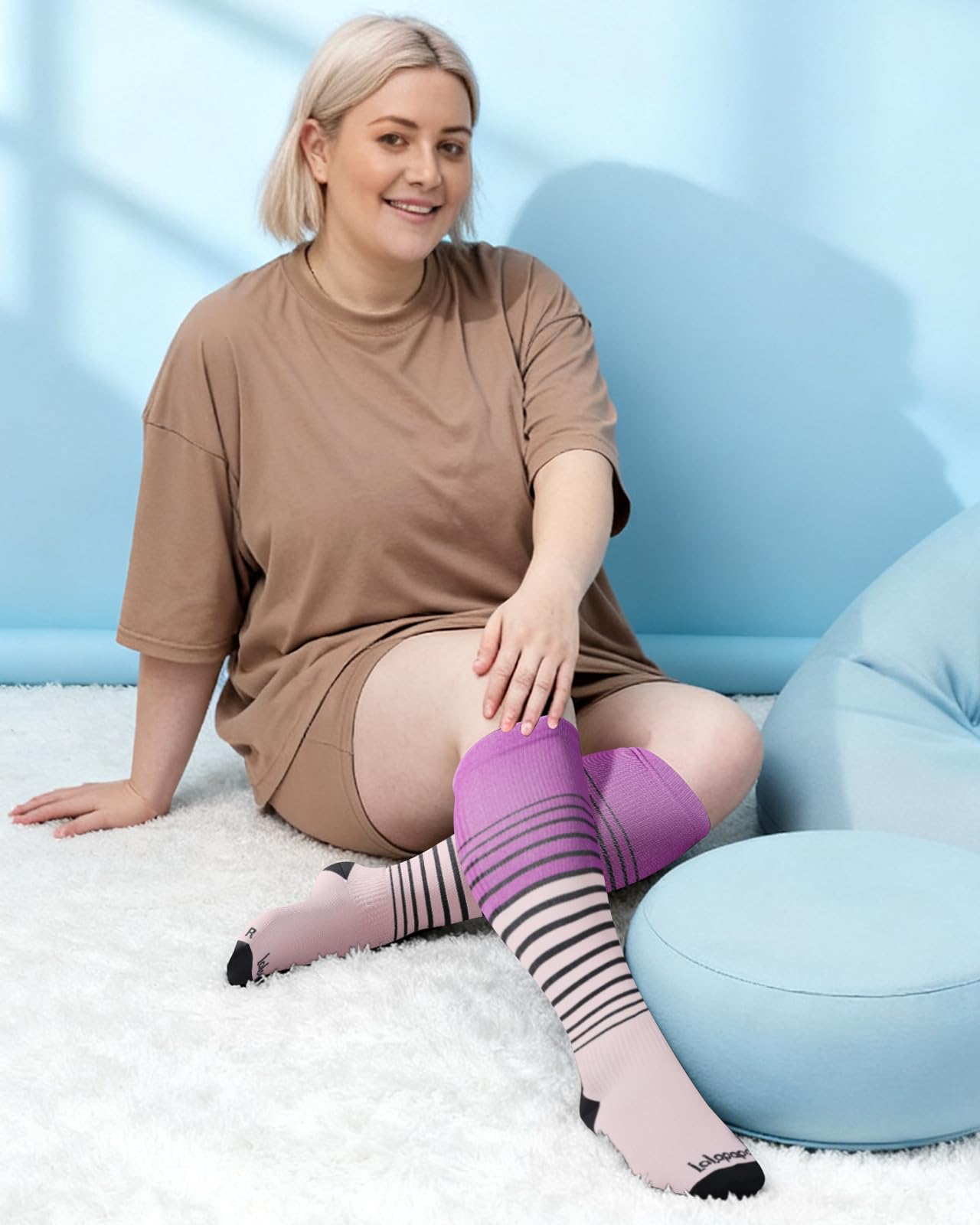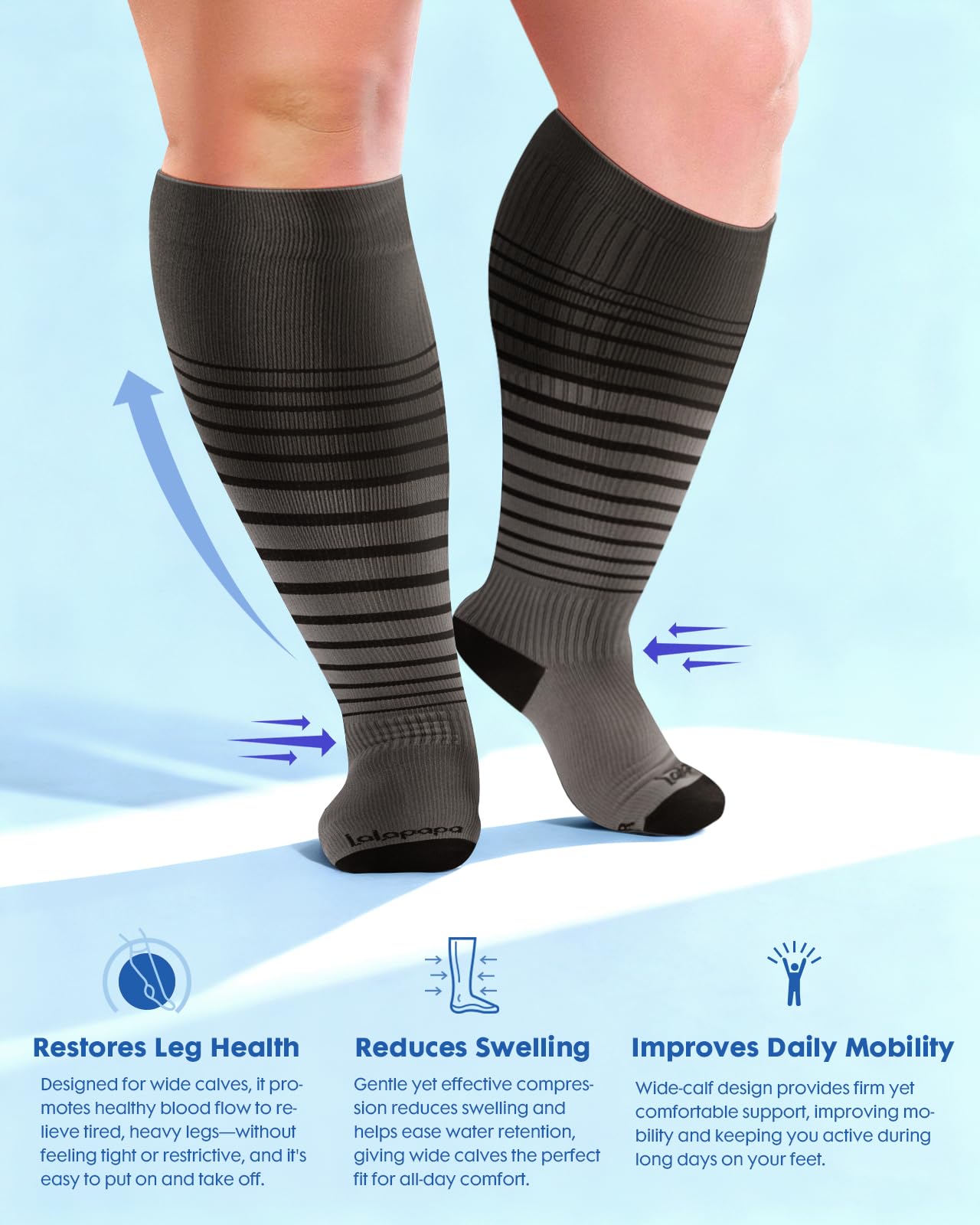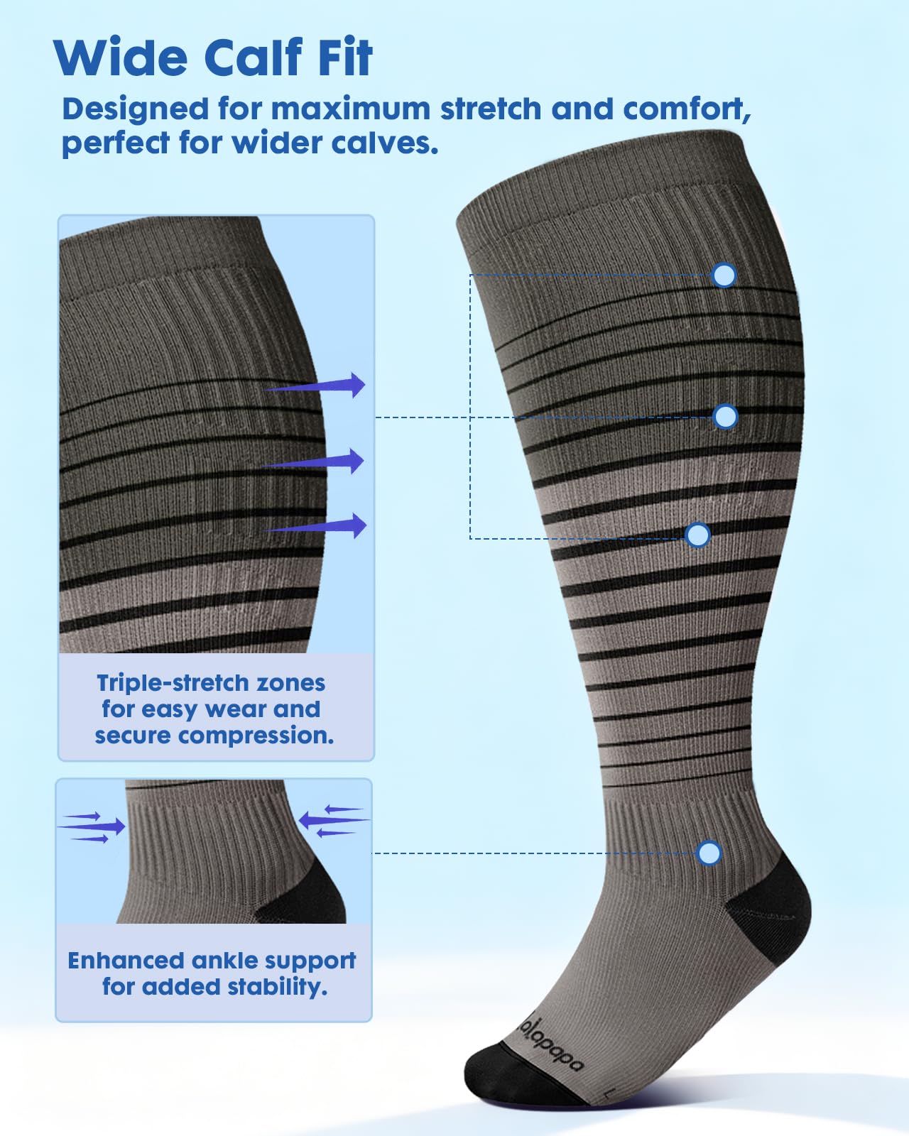 Triple-Stretch Design for Wide Calves: Lalapapa compression socks are specially engineered for wide calves, featuring a unique triple-stretch zone at the widest part of the calf. This innovative design ensures maximum elasticity and comfort, making them easy to put on and take off while maintaining a consistent 20-30 mmHg compression level. Say goodbye to the struggle of tight, restrictive socks and enjoy all-day support tailored for you