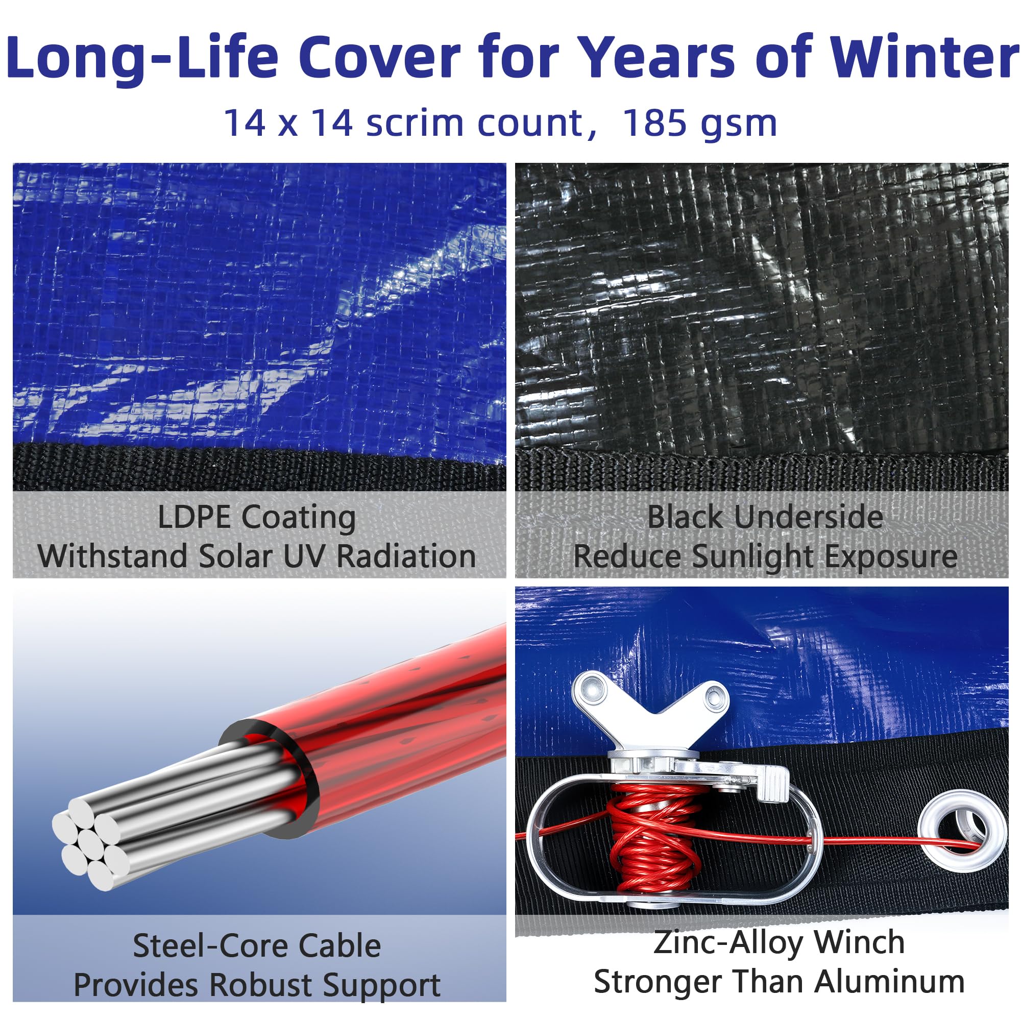 Heavy-Duty Material: Constructed with a robust 185 GSM density and 14×14 scrim matrix, this cover resists punctures and tears. Fully sealed seams keep debris and dirt out all winter