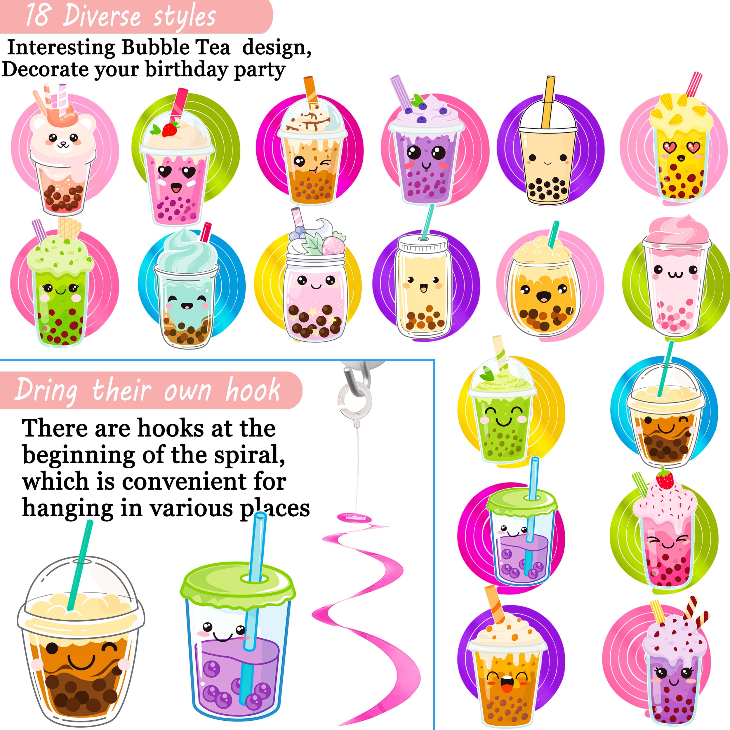 【20pcs bubble tea party hanging swirls】You will receive a total of 20pcs bubble tea party hanging swirls, 18pcs of which are bubble tea cutouts with foil spiral and 2pcs of which are only foil spiral with no patterns.Let you enter the party can immediately feel the muted atmosphere.