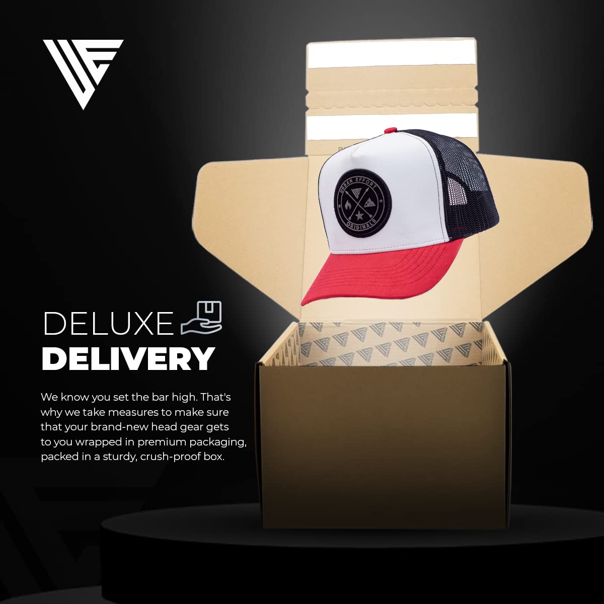 Packed with Care: A premium custom trucker hat that comes packed in an elegant gift box, to make sure it arrives safely at your doorstep, whether as a new addition to your collection or as a gift for your loved one.