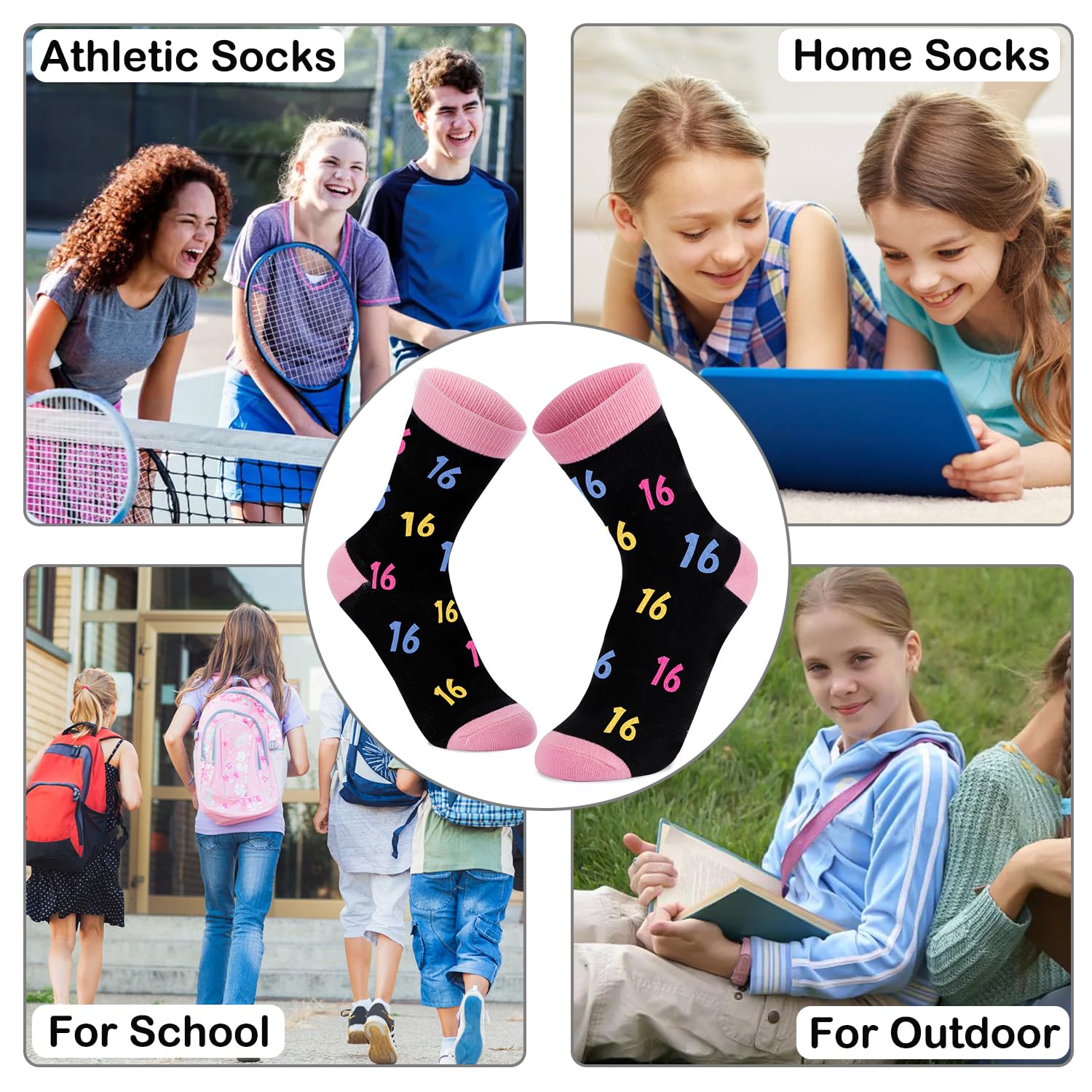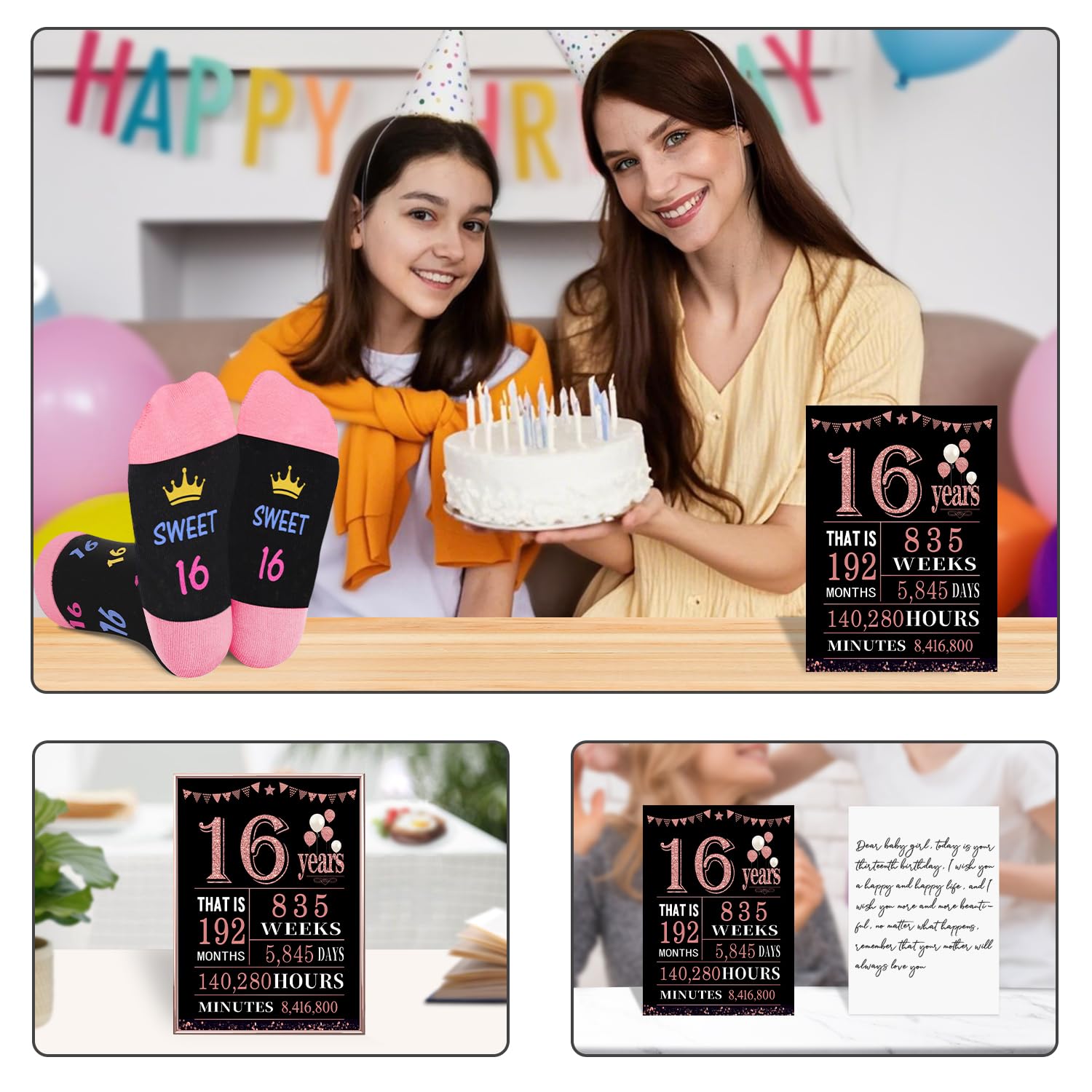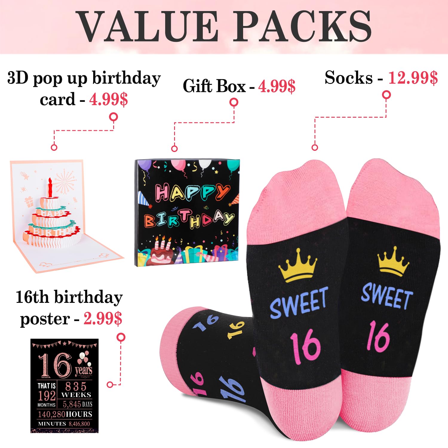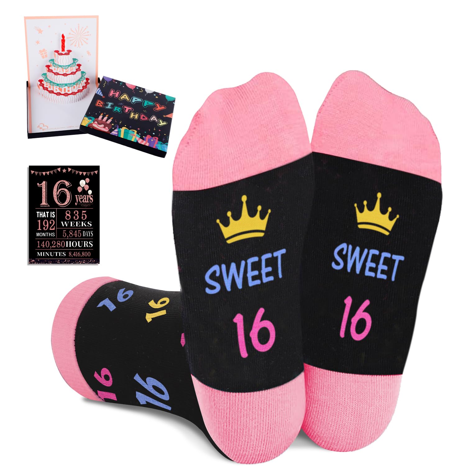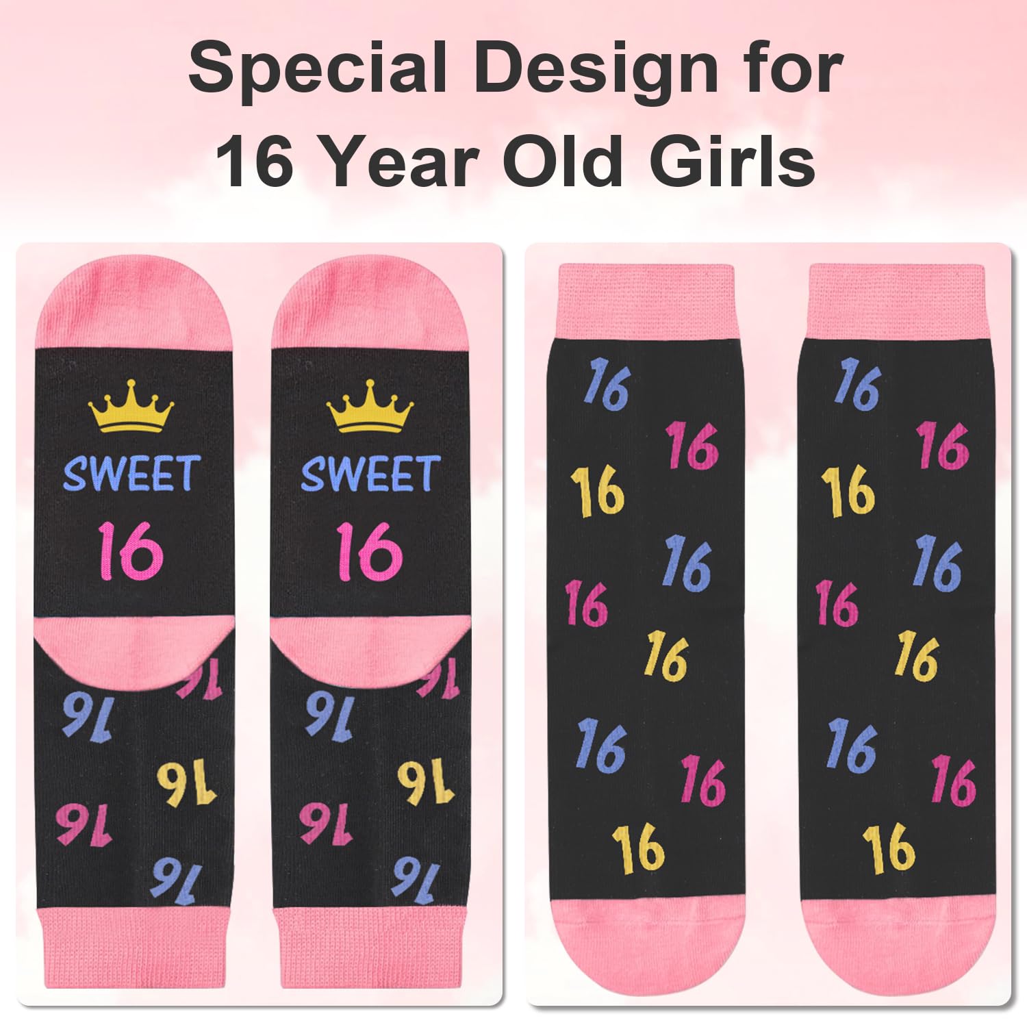 Gifts for 16 Year Old Girl: A pairs of socks special design for 16 birthday girl, package also coming with a cute 3D pop up birthday card and a 16th poster anniversary card. Both itmes are packed in a beautiful gift box to emphasizes the surprise and enhances the joy of unwrapping the box, making the popular gifts for 16 year old girls more memorable. It could be the perfect birthday gift for your daughter, granddaughter, or niece