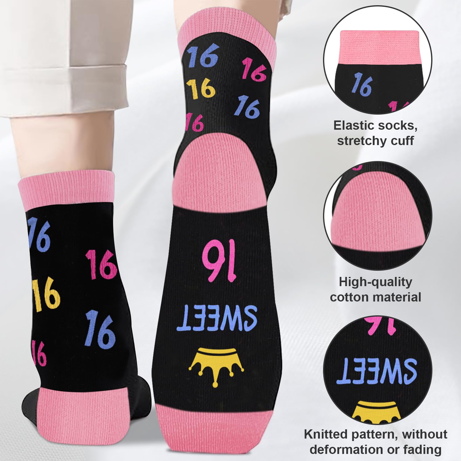 Socks for 16th Birthday Girls Design: Our socks are predominantly black, pink, blue, orange and white, prominently displaying the number 16 on the top, while the bottom is sewn with a hilarious hidden message: "SWEET 16." This youthful and energetic design, Suitable for 16th Birthday Gifts, Christmas Gifts, New Years Gifts or White Elephant Gifts