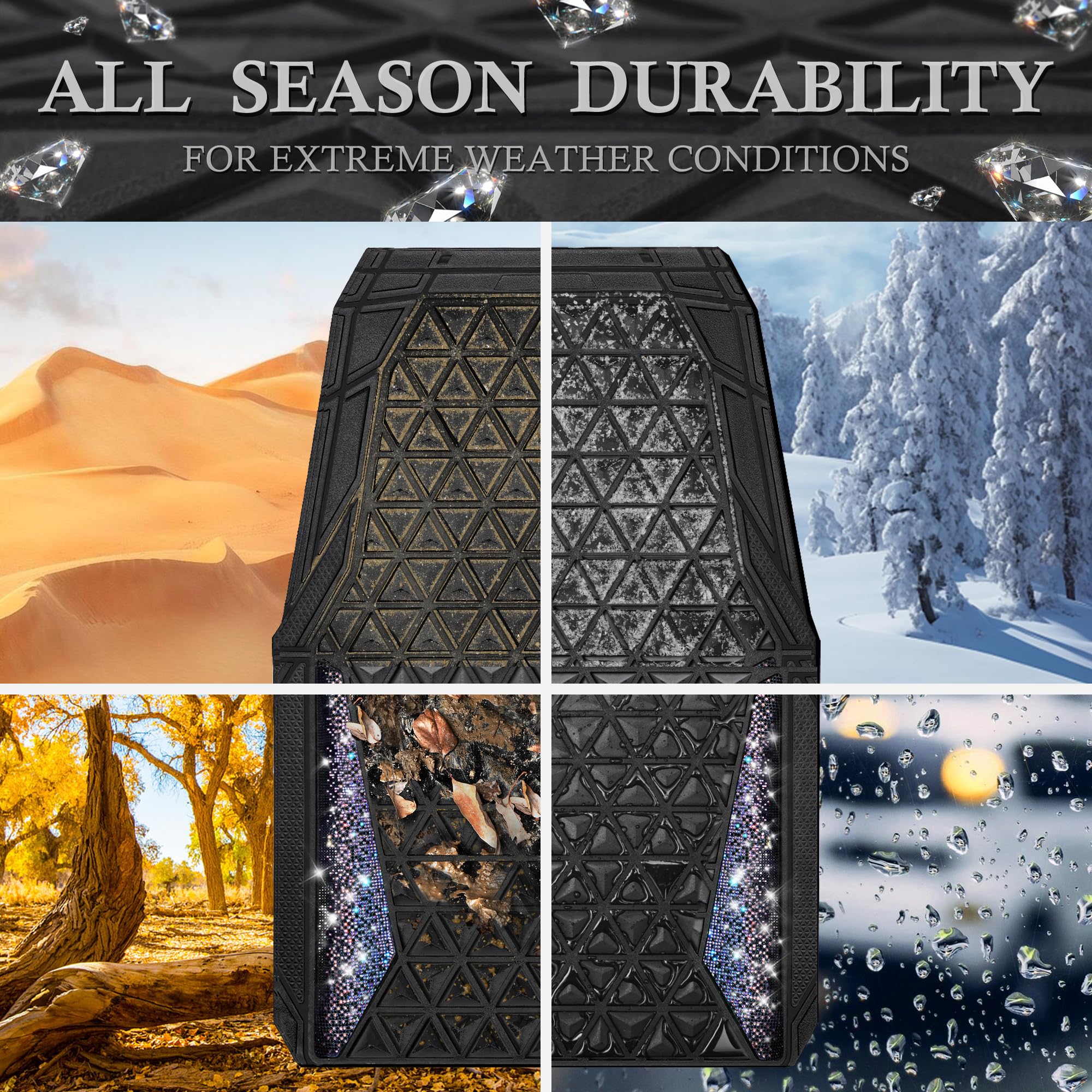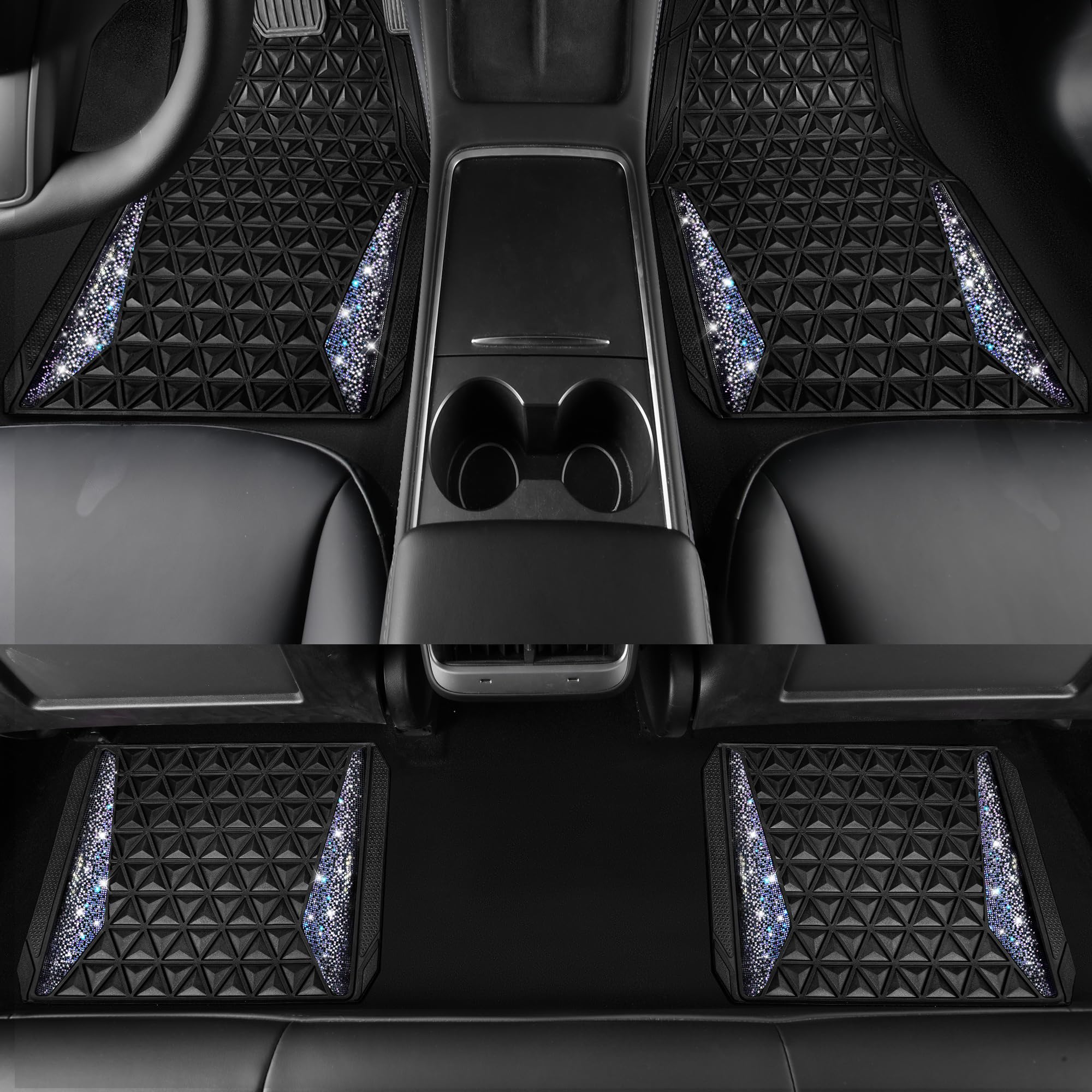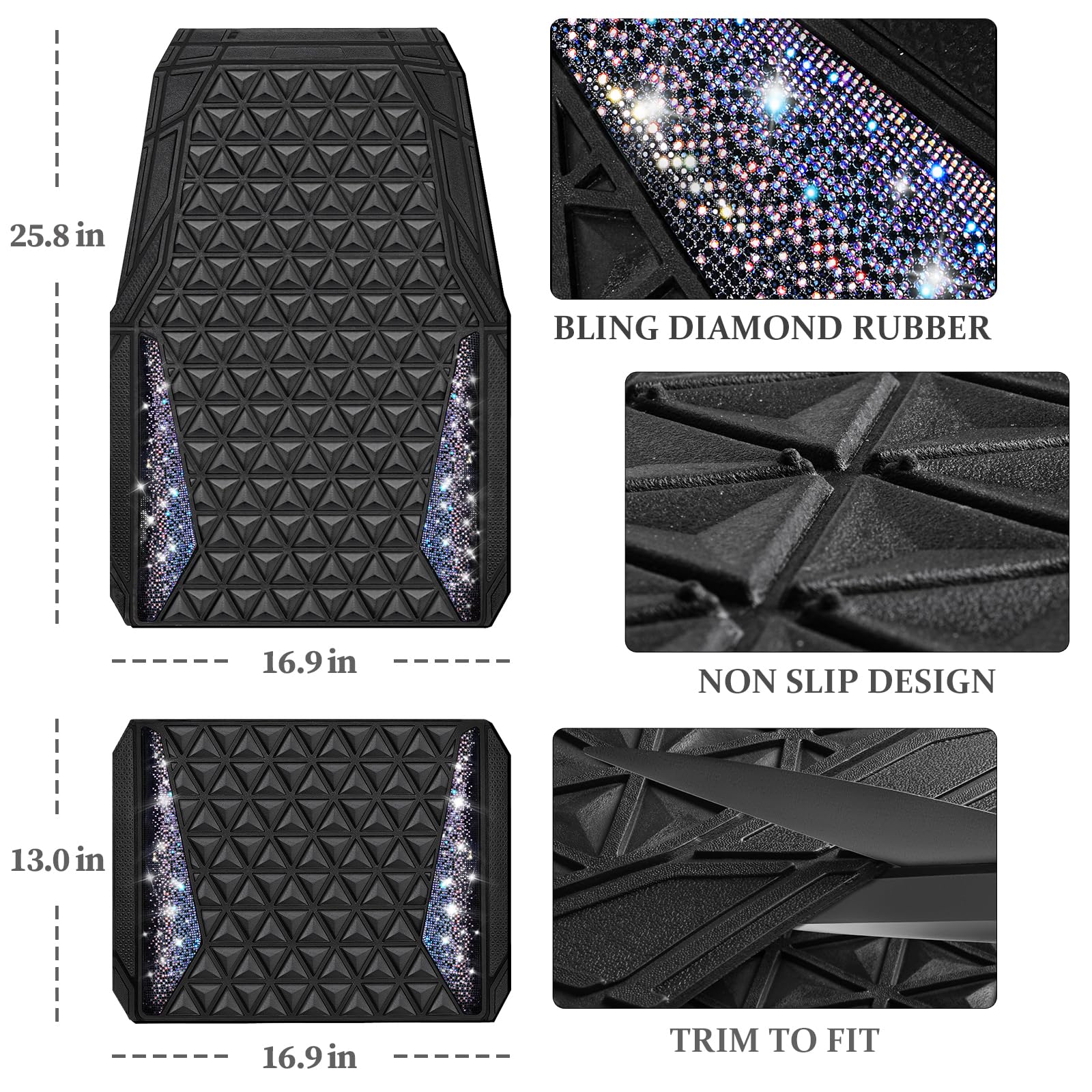 BLING DIAMOND RUBBER: Made of high quality rubber, side on the rubber car mats has shining rhinestone, 4 pcs full set. The CAR PASS diamond rubber car floor mats use for all season. Protect your truck's floors from dirt and debris. Easy to clean. Made of high quality sparkly diamond. Shininig diamonds don't fall out. Glitter in the sun and bring a nice vibe to the interior of your car