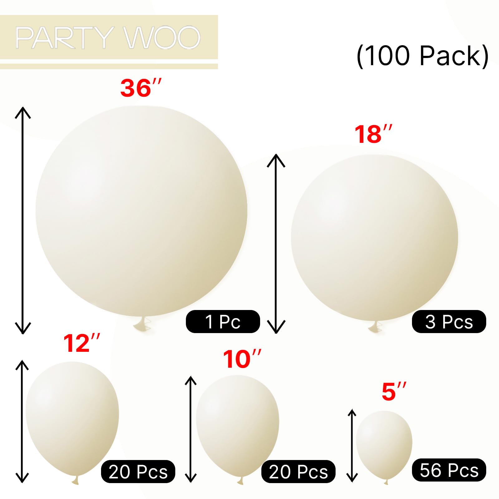 100 PCS YELLOW BALLOONS DIFFERENT SIZES: Package includes 36 inch balloon (1 pc), 18 inch balloons (3 pcs), 12 inch balloons (20 pcs), 10 inch balloons (20 pcs), 5 inch balloons (56 pcs)