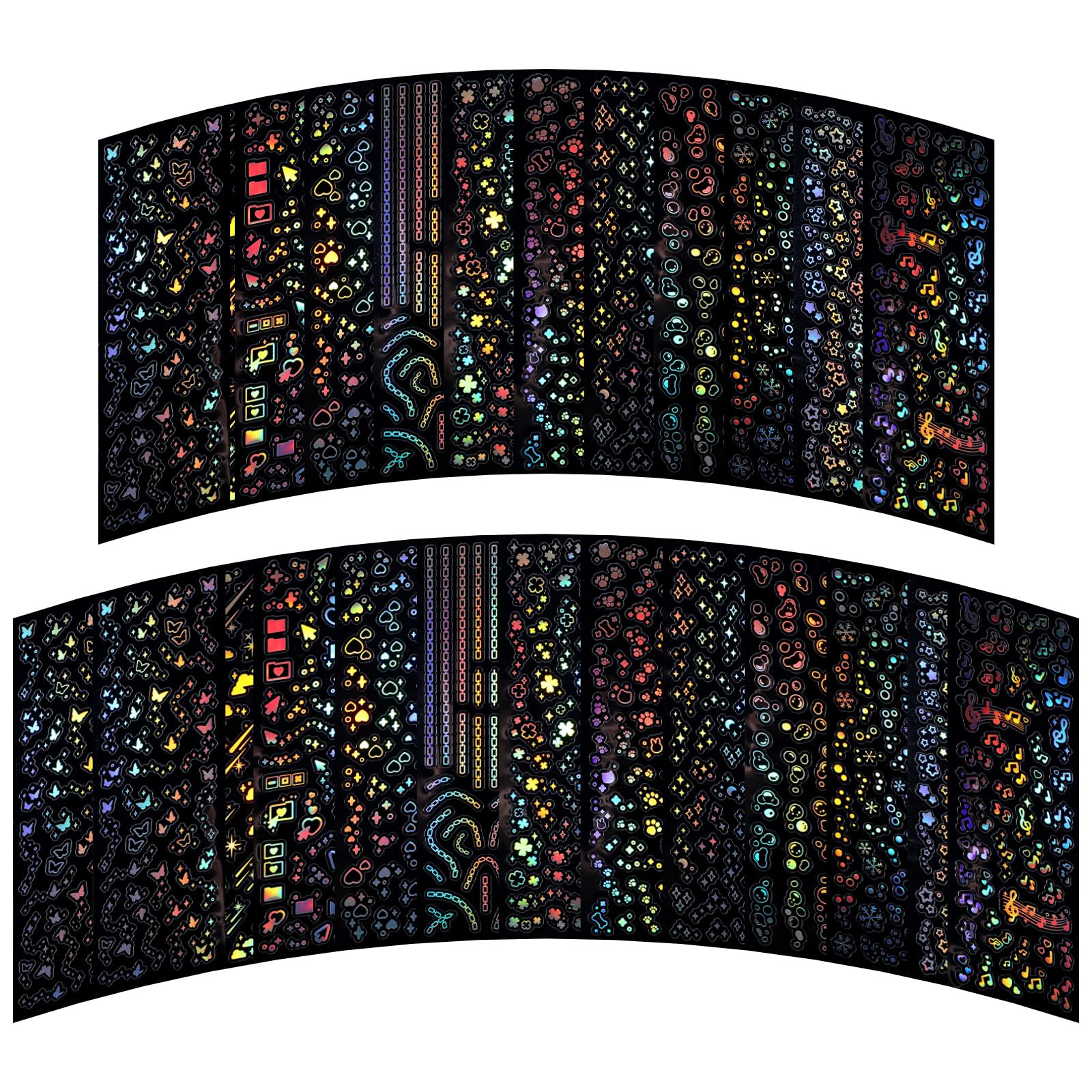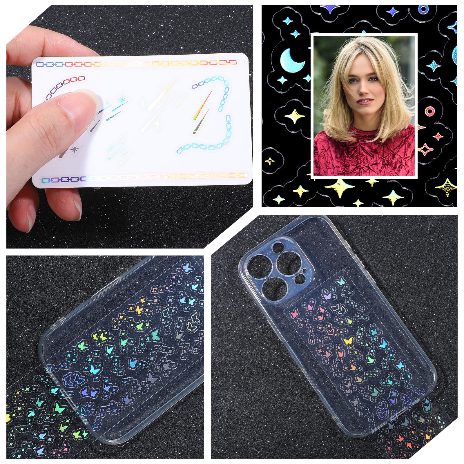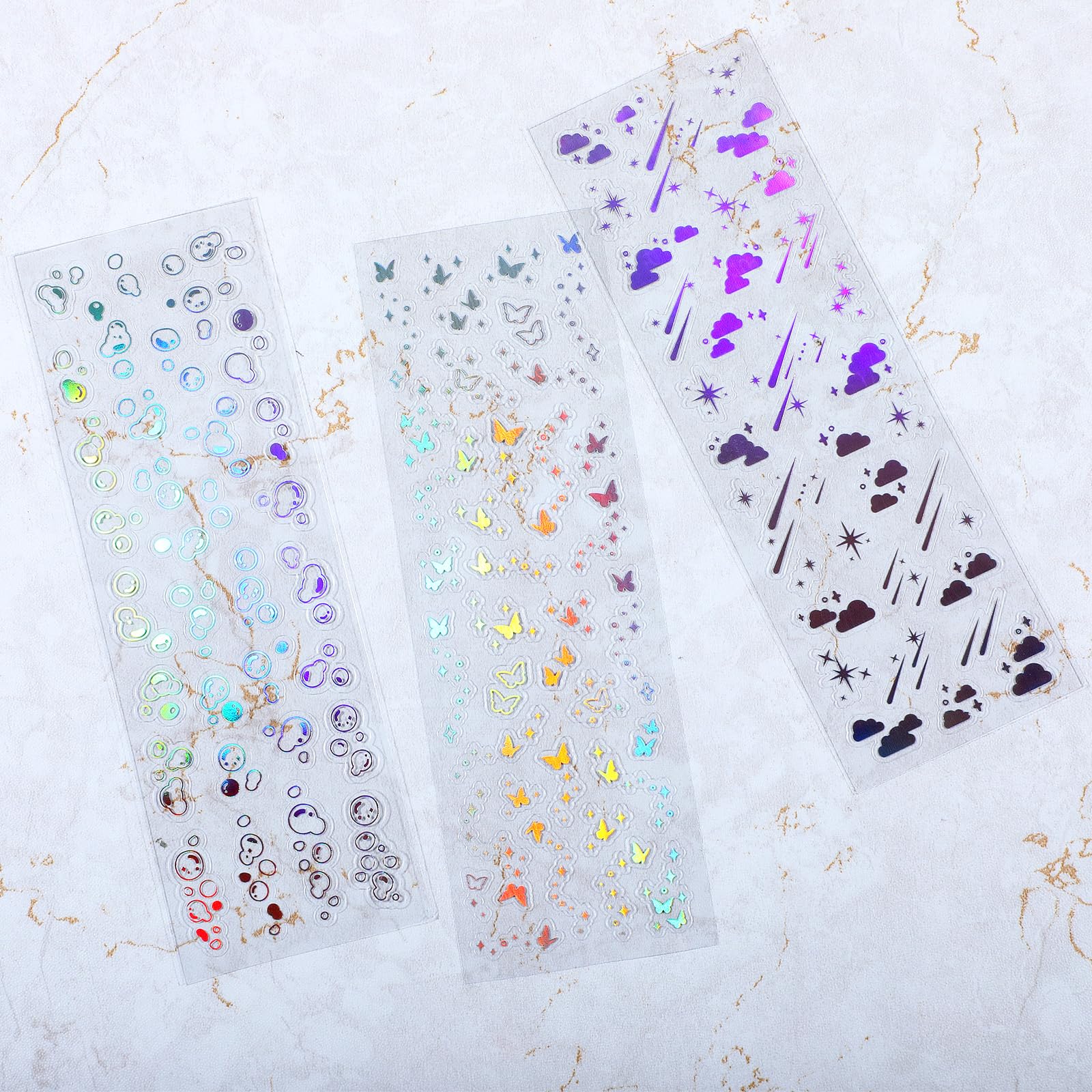 【Holographic Glitter Stickers】These shiny tiny stickers have a holographic effect and will reflect different colors under the light. Decoration stickers come in various patterns including stars, moons, butterflies, hearts, bubbles and more. These cute photocard stickers are perfect for adding a touch of charm to your creations and making your items stand out