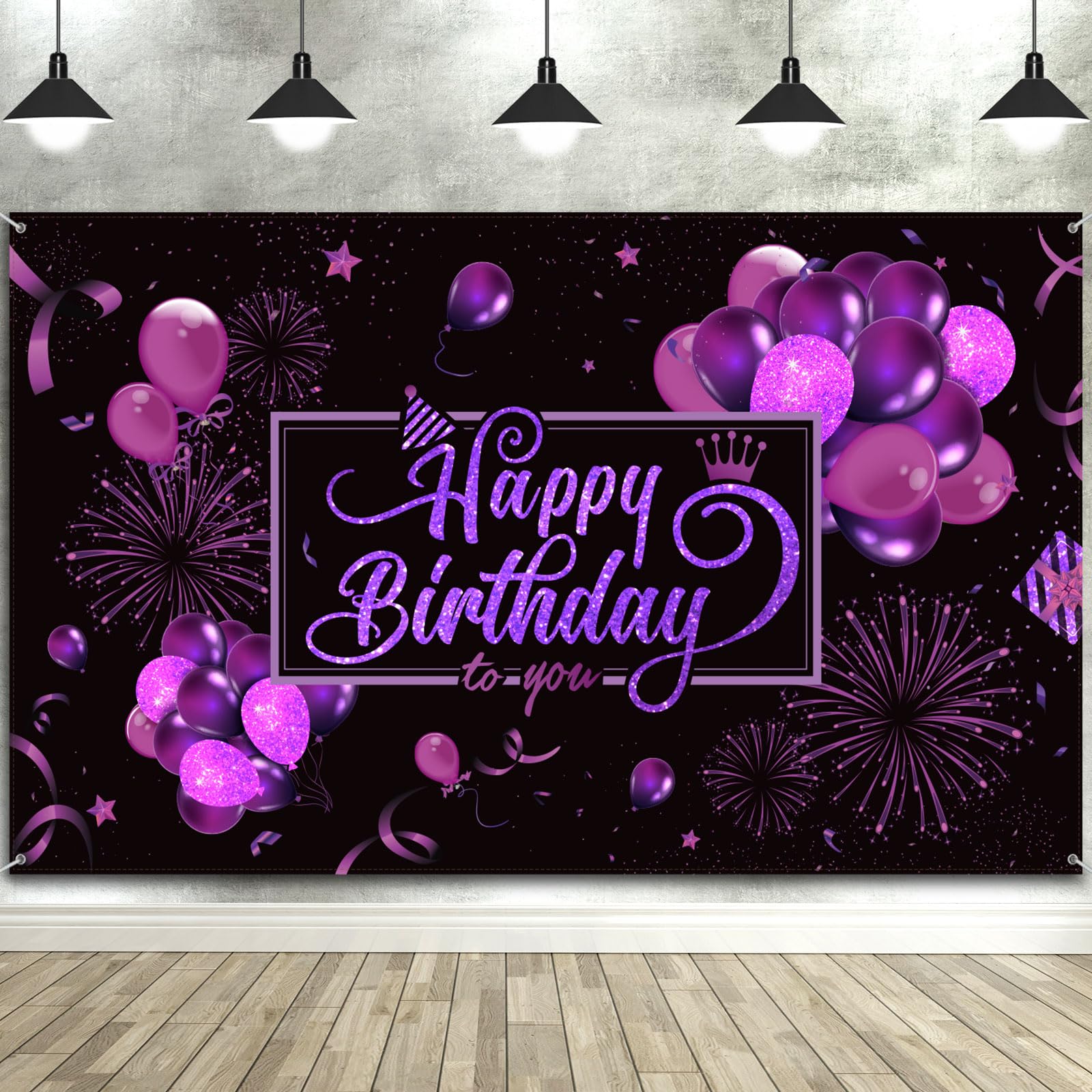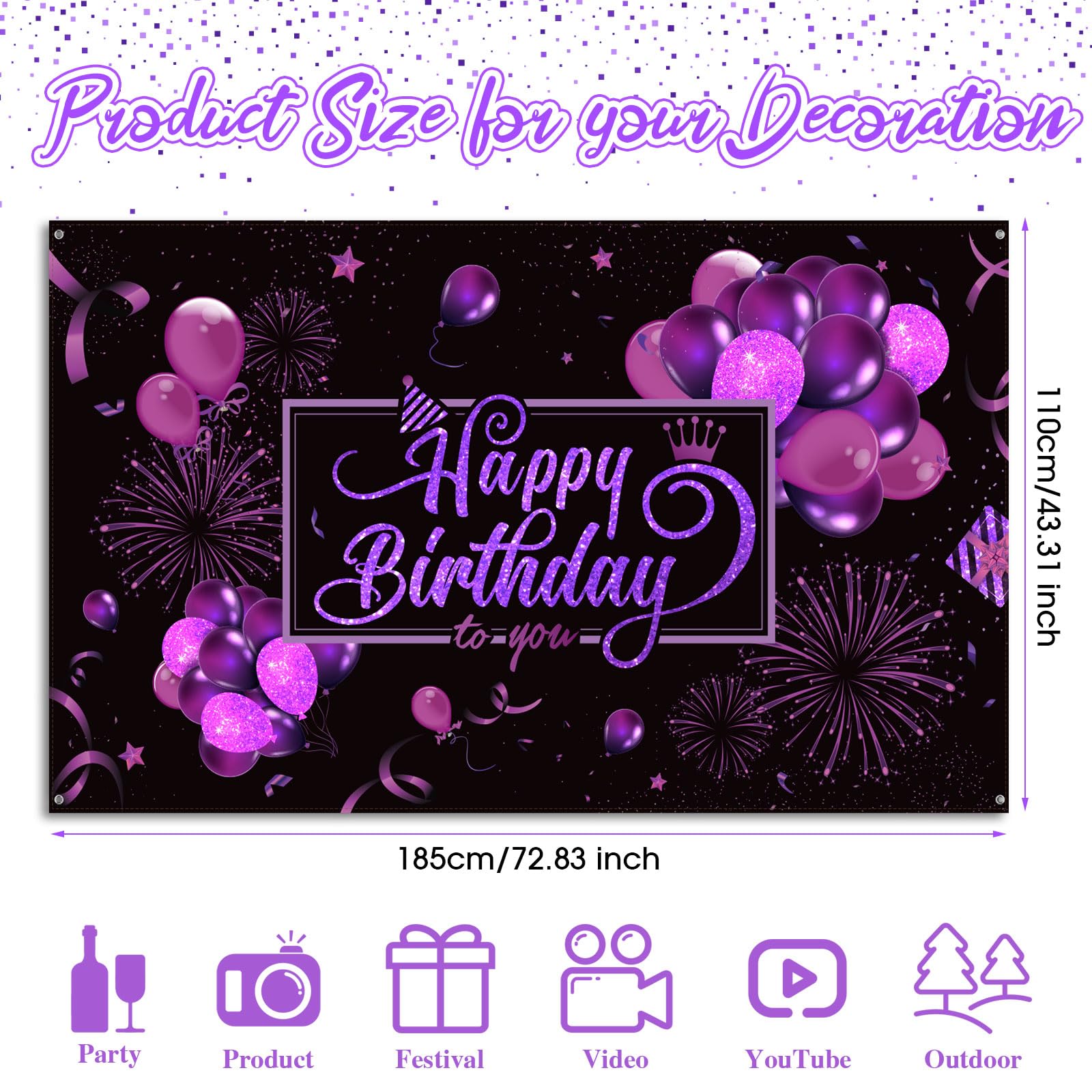 Happy birthday backdrop banner, large black purple fabric purple glittering shiny balloons stars fireworks party photography backdrop banner for men women birthday party decorations, 72.8 x 43.3 inch Wide applications: this elegant black and purple birthday backdrop banner enhances any birthday party, creating a vibrant atmosphere; It's ideal for various occasions, including themed parties, product photography, and wall decorations Specifications: Color: as the picture shown Size: 185 x 110 cm/ 72.8 x 43.3 inch Quantity: 1 piece Package includes: 1 x Happy birthday backdrop banner 1 X 20 Feet white string Warm note: Please wash them with your hands and dry them in the ventilated place. In addition, there may be some wrinkles in the banners, so please iron them gently. In case of risk of entanglement, be careful when using.