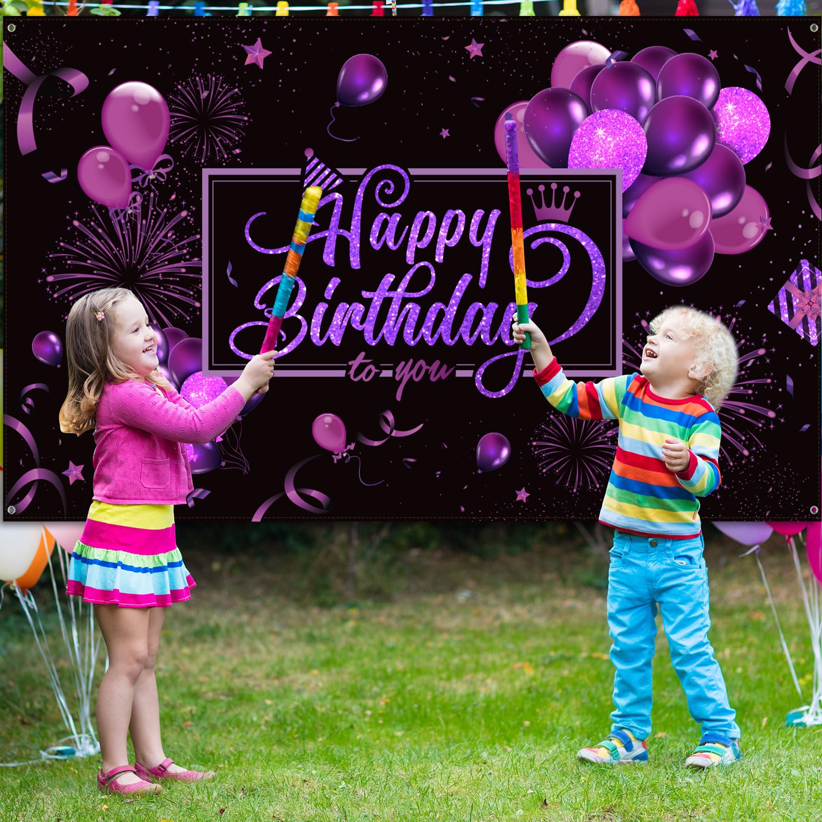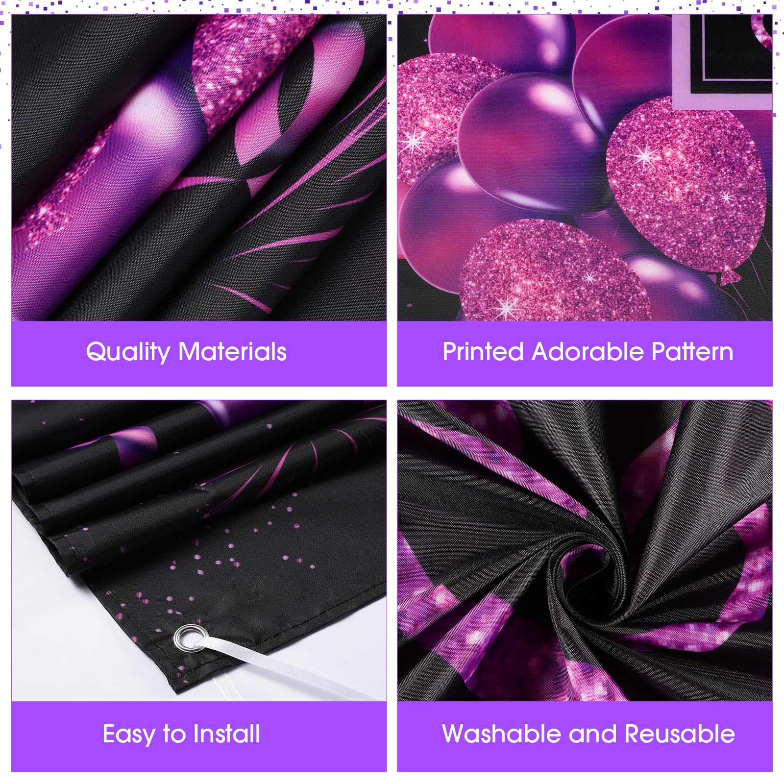 Exquisite design: the large happy birthday backdrop banner is featured with black and purple elements, printed with purple glittering balloons stars fireworks, high-resolution digital print with eye-catching details and lifelike colors, which help you light up your birthday party and leave a deep impression for guests