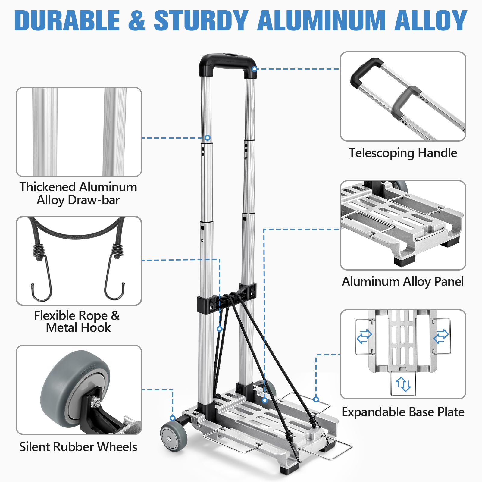 100% Aluminum Alloy Material:Plastic luggage cart is too fragile and metal luggage cart is too heavy. KEDSUM Mini luggage crat with wheels foldable is made of 100% aluminum alloy material, which makes the luggage cart more durable than other plastic base. Lighter than metal and stronger than plastic, high-quality aluminum alloy material perfectly balances portability and durability