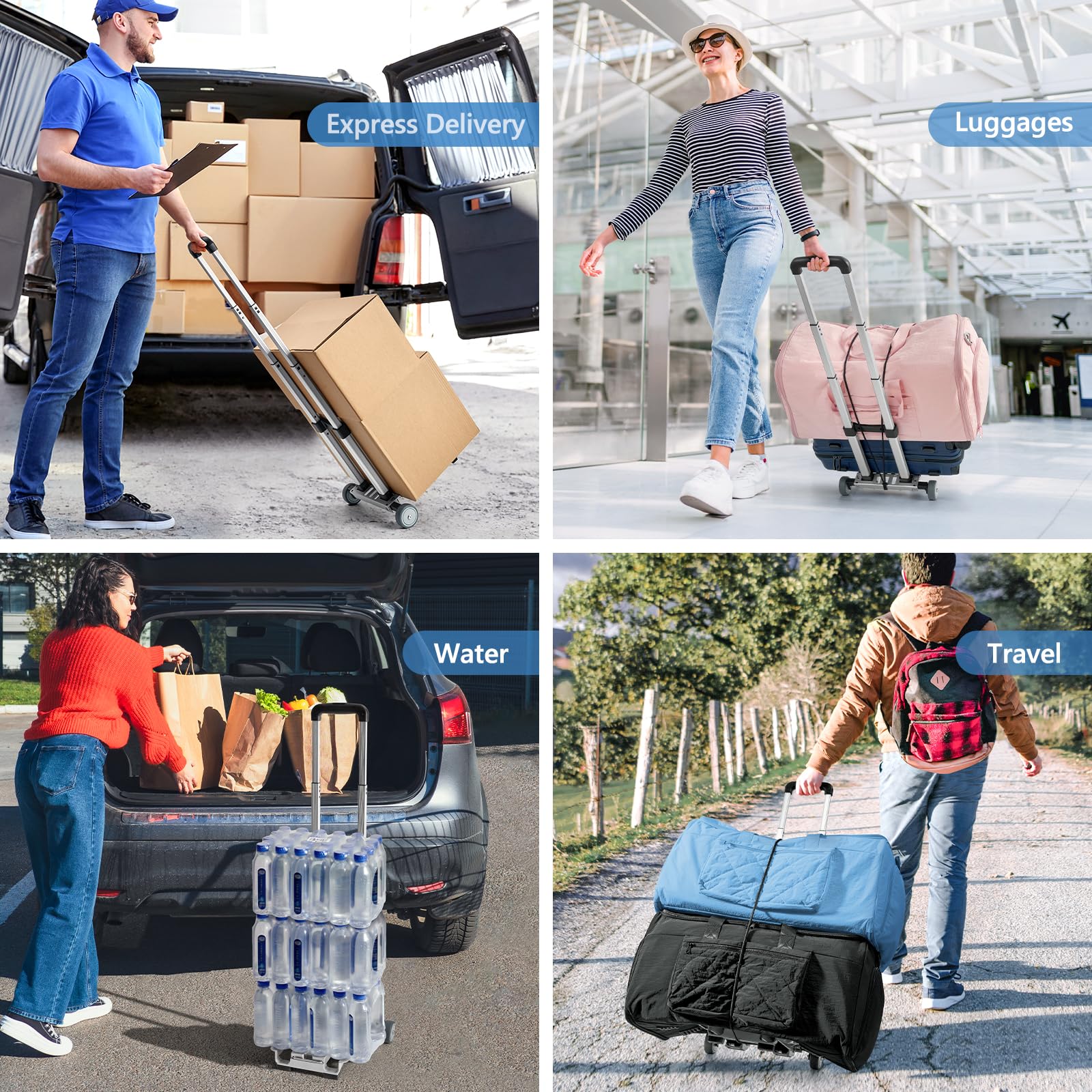 Compact Small Size and Lightweight: The weight of folding luggage cart is only 3.3 lbs and folded up easily. When folded,its size of trolley cart with wheels is only 14.8×8.5×3.15 inch. The smallest folding luggage cart is fits effortlessly in car trunks, backpack—perfect for urban living and travel