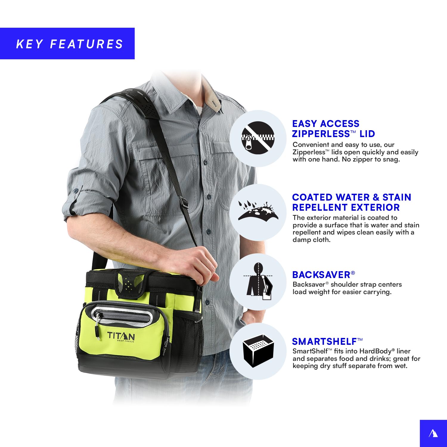 DESIGNED FOR CONVENIENCE AND USABILITY: Cooler features an adjustable Backsaver shoulder strap with an anti-slip shoulder pad for carrying comfort and rugged exterior material that is water- and stain-repellent and easy to wipe clean