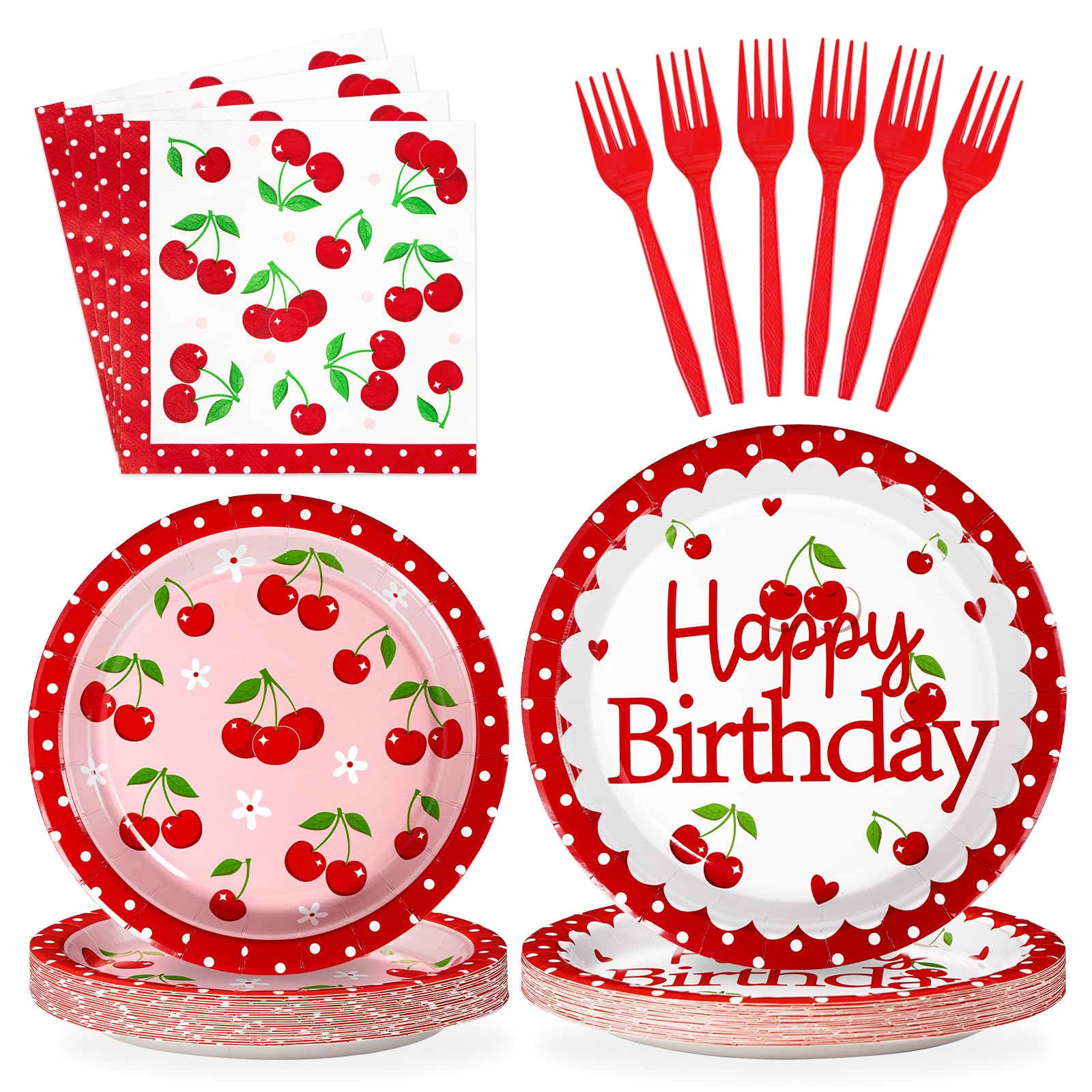 Cherry Birthday Decorations: Our cherry birthday disposable tableware includes 24 * 9'' cherry birthday party plates, 24 * 7'' cherry plates, 24 * 6.5'' paper napkins, and 24 plastic forks. This cherry party decorations kit is specially designed for birthday party. It will definitely be a hit for your special event