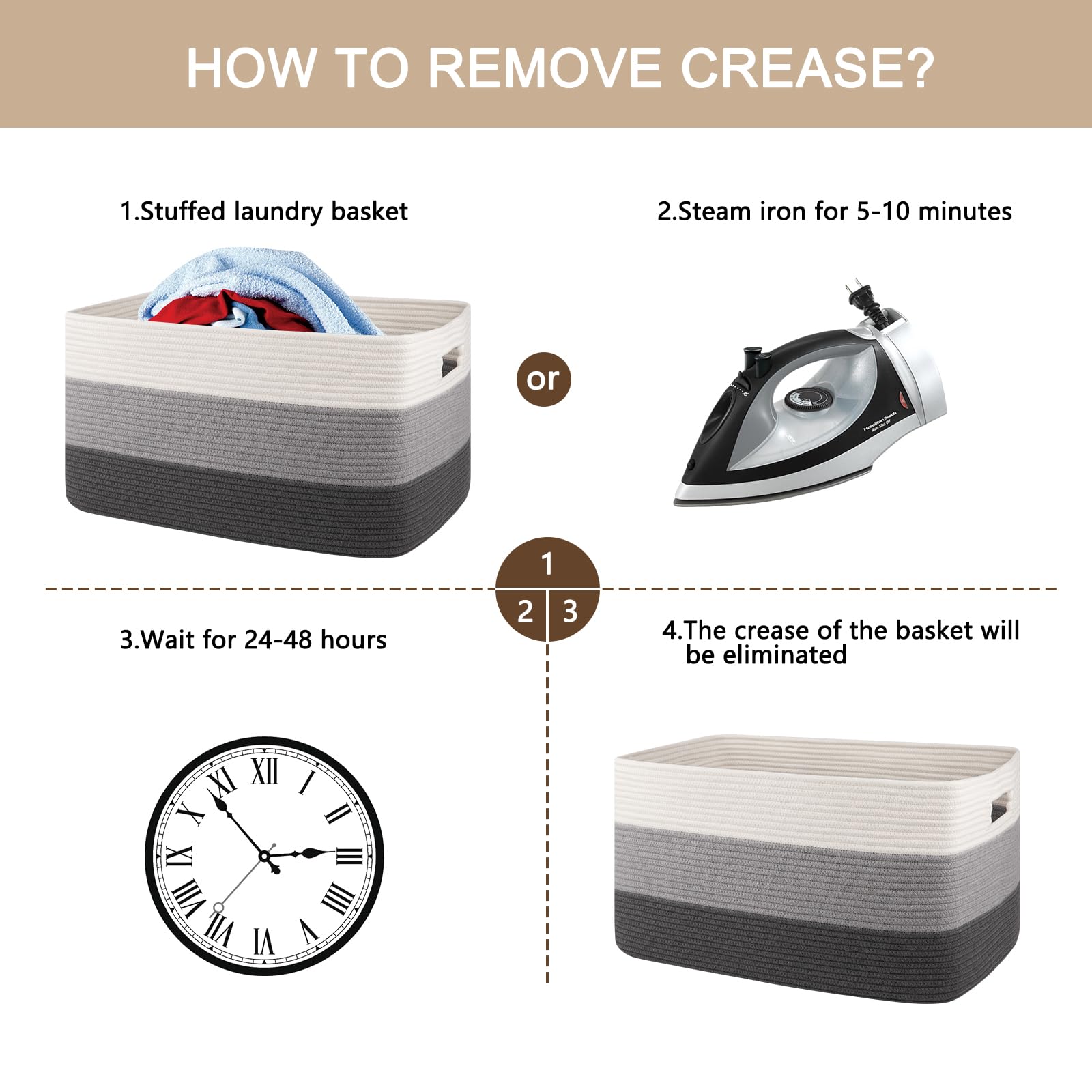 Washable Large Basket: This large basket can be washed by hand or machine with gentle detergent. If machine washed, please put them into a laundry bag. NOTE: These cotton rope baskets are folded when shipping, but it will turn back to its elegant shape quickly if you fill it with some towels or clothing, and iron is great idea to remove the creases