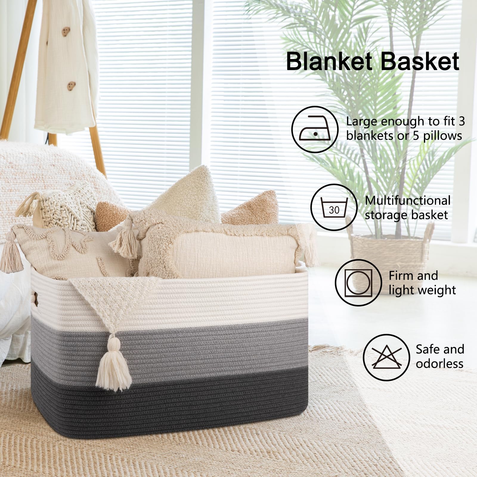 Decorative Blanket Storage for Living Room:This rectangular blanket basket is more stable and easier to restore its sahpe after you receive the package. The 22’’ x 17’’ x 12’’ large storage basket can also used to store blankets, pillows, cushions, toys, clothes and towels