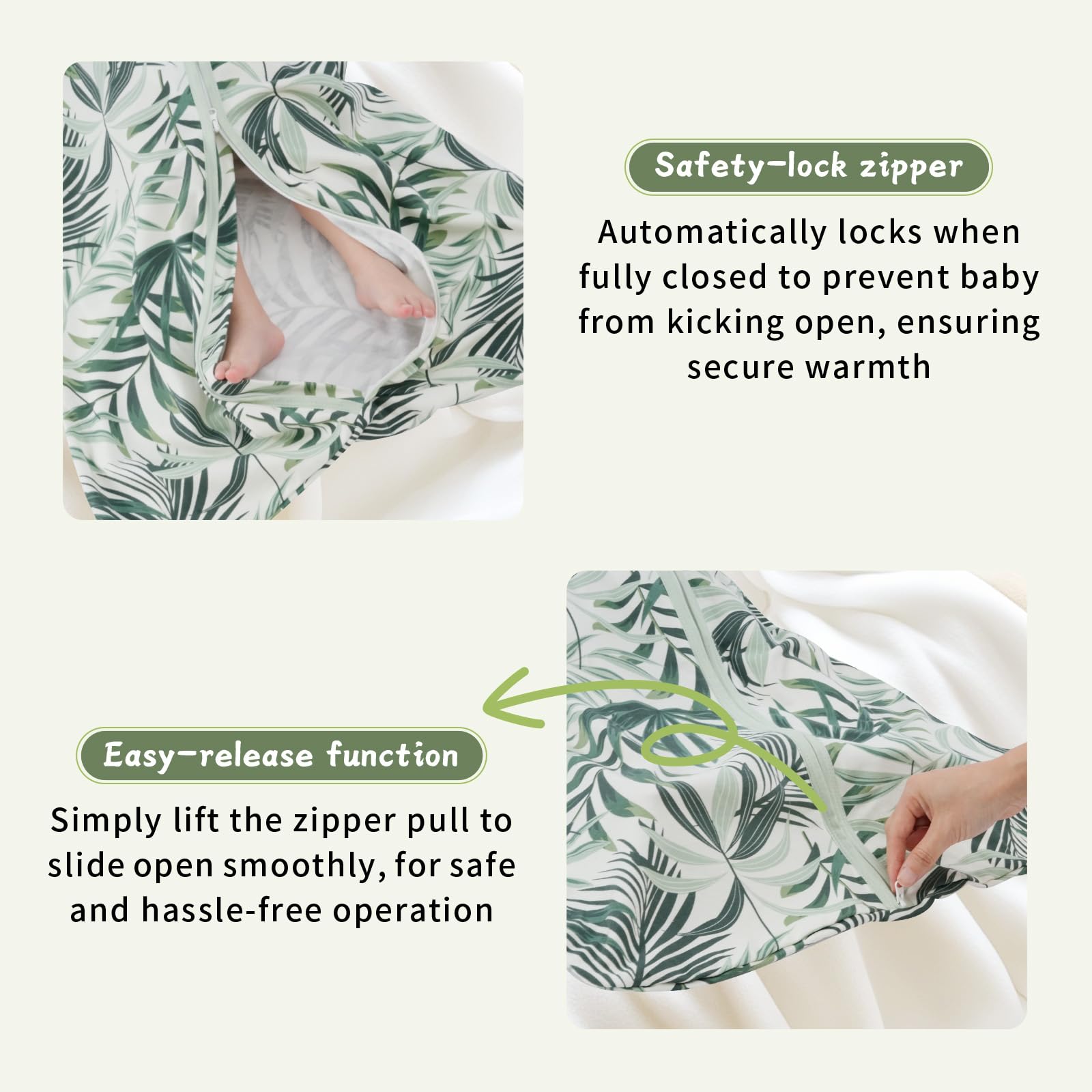 Safety-Lock Zip:The sleep sack's zipper automatically locks when fully closed to prevent your baby from kicking it open, ensuring all-night warmth retention. With its easy-release feature, simply lifting the zipper pull allows smooth one-handed opening for effortless nighttime care
