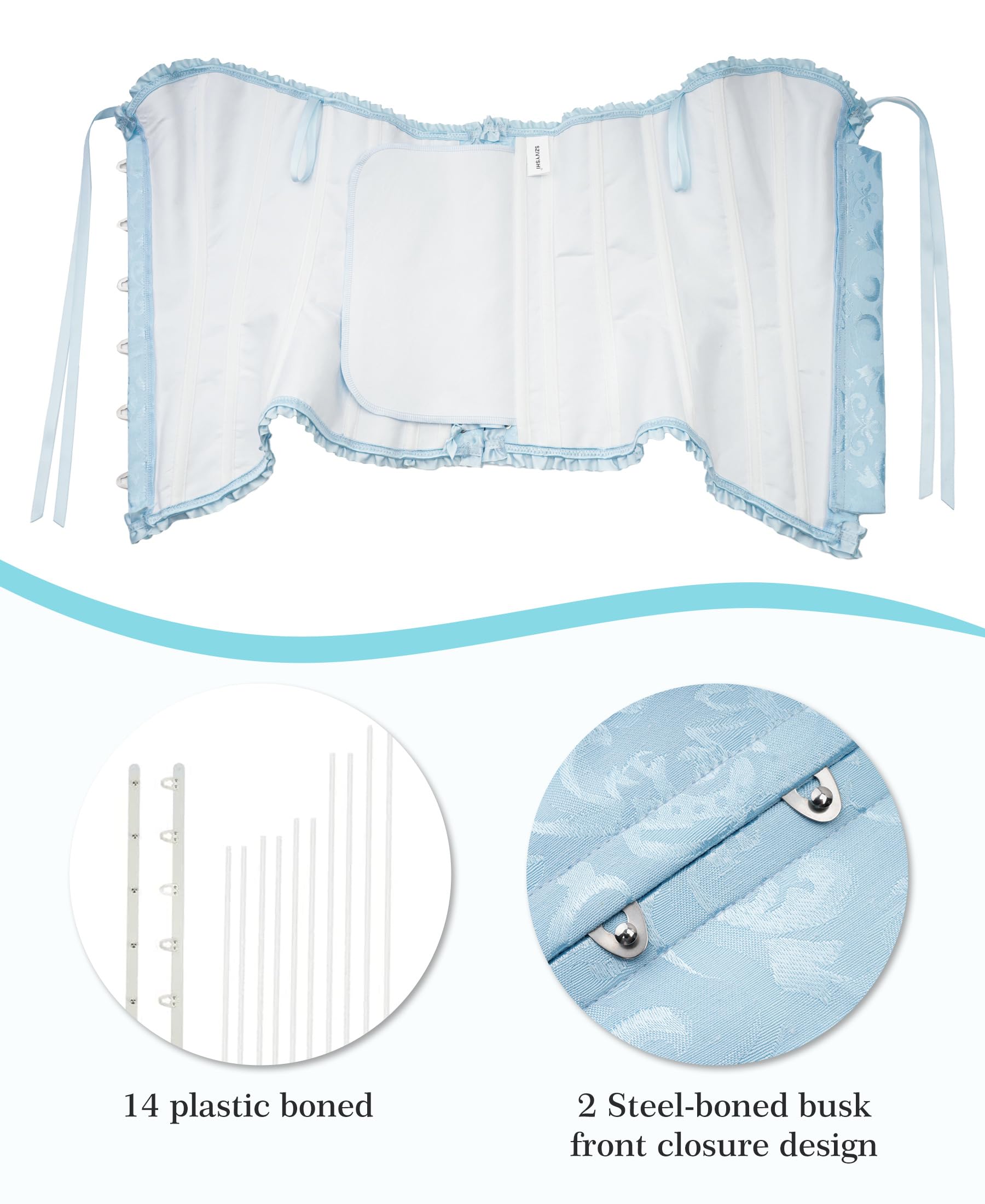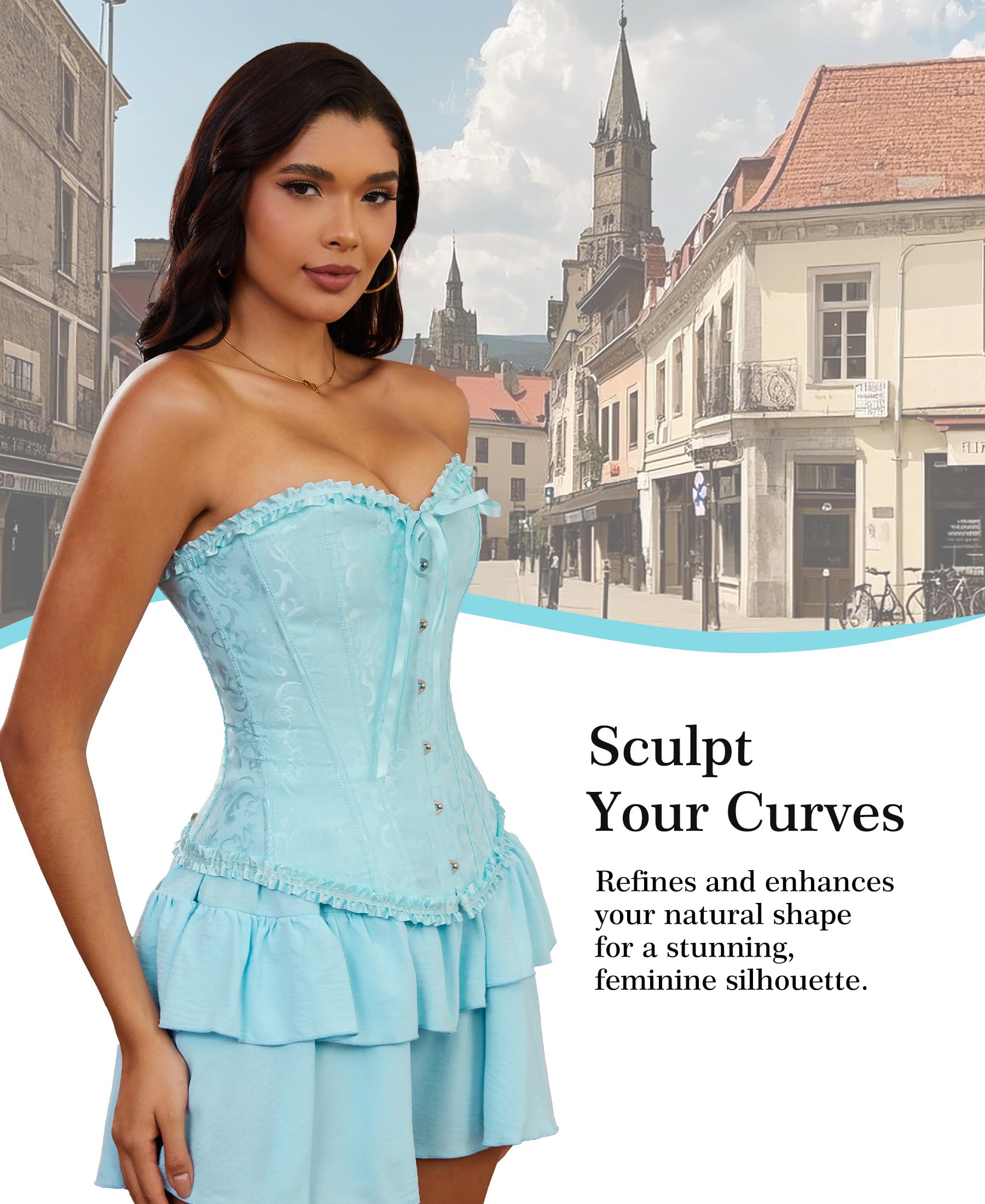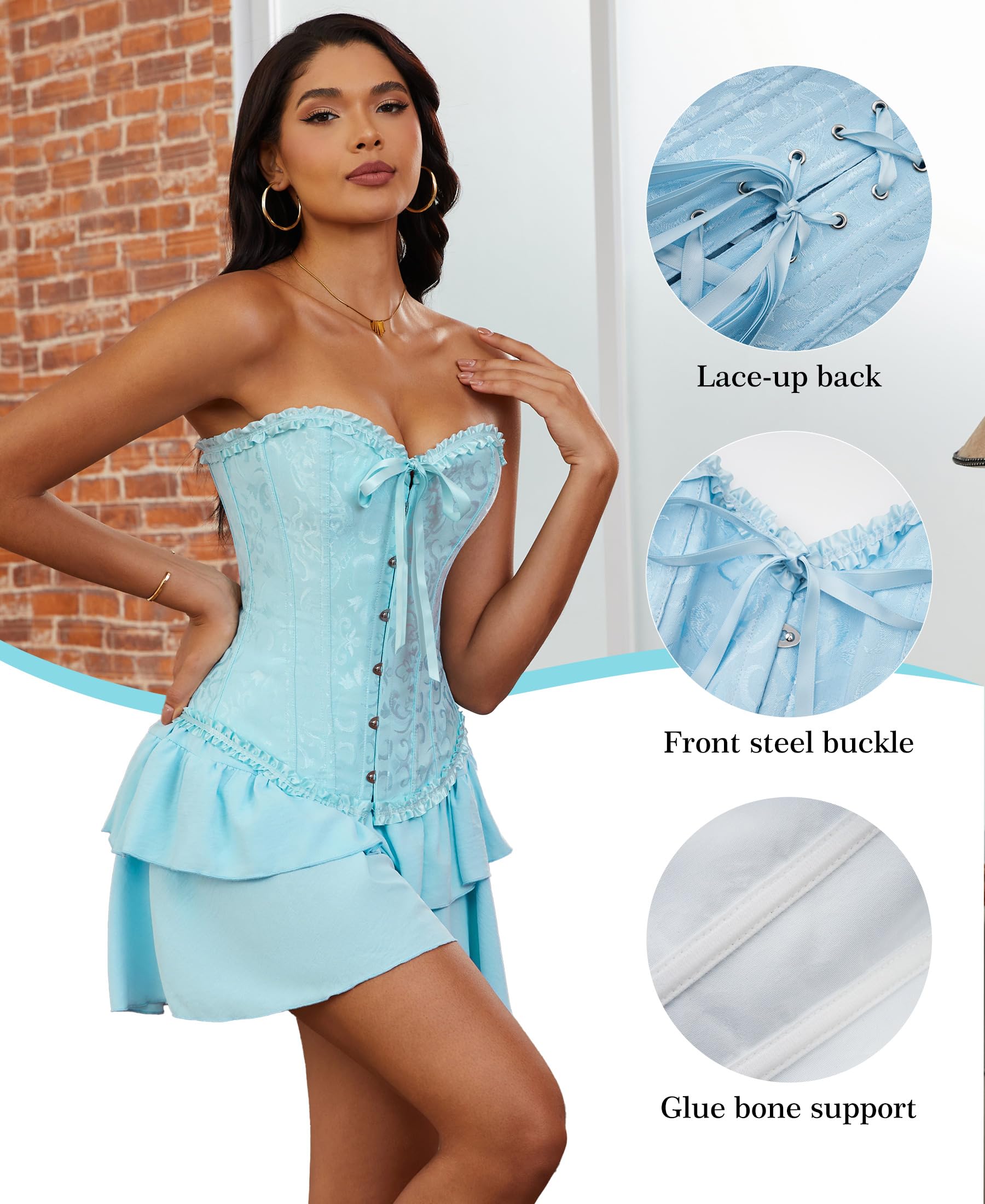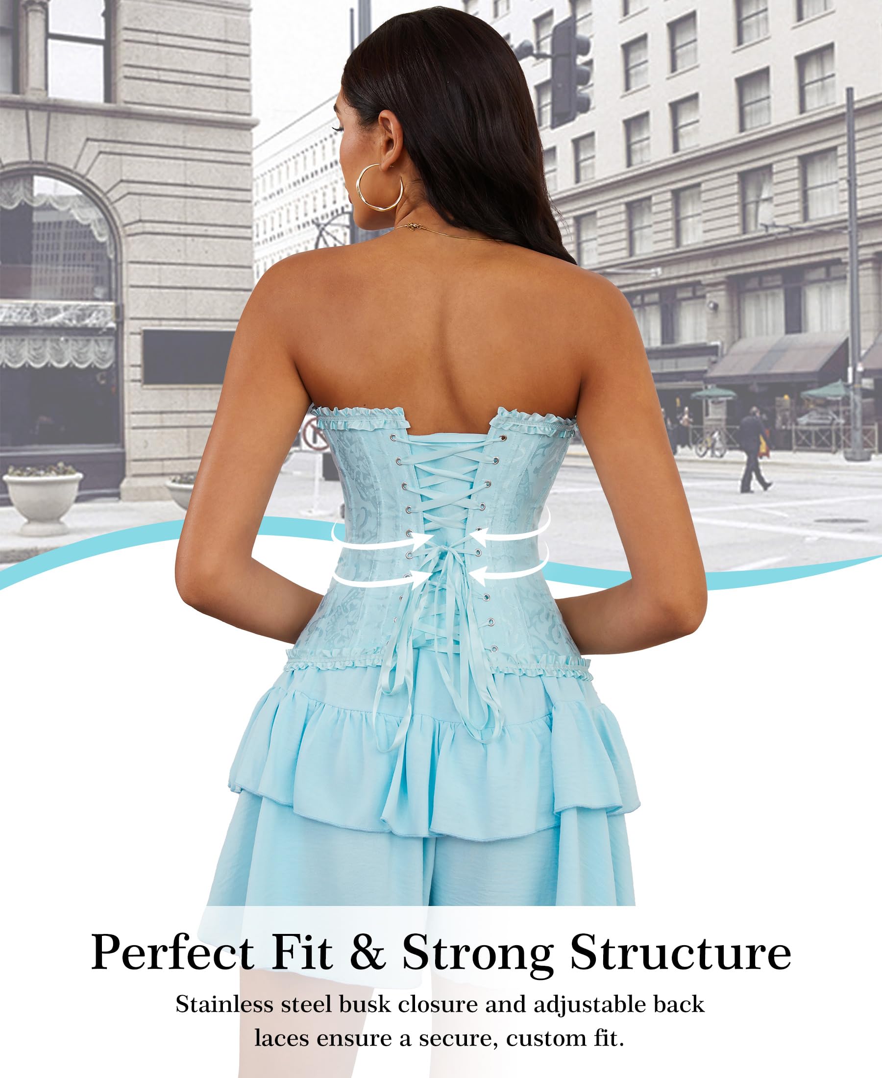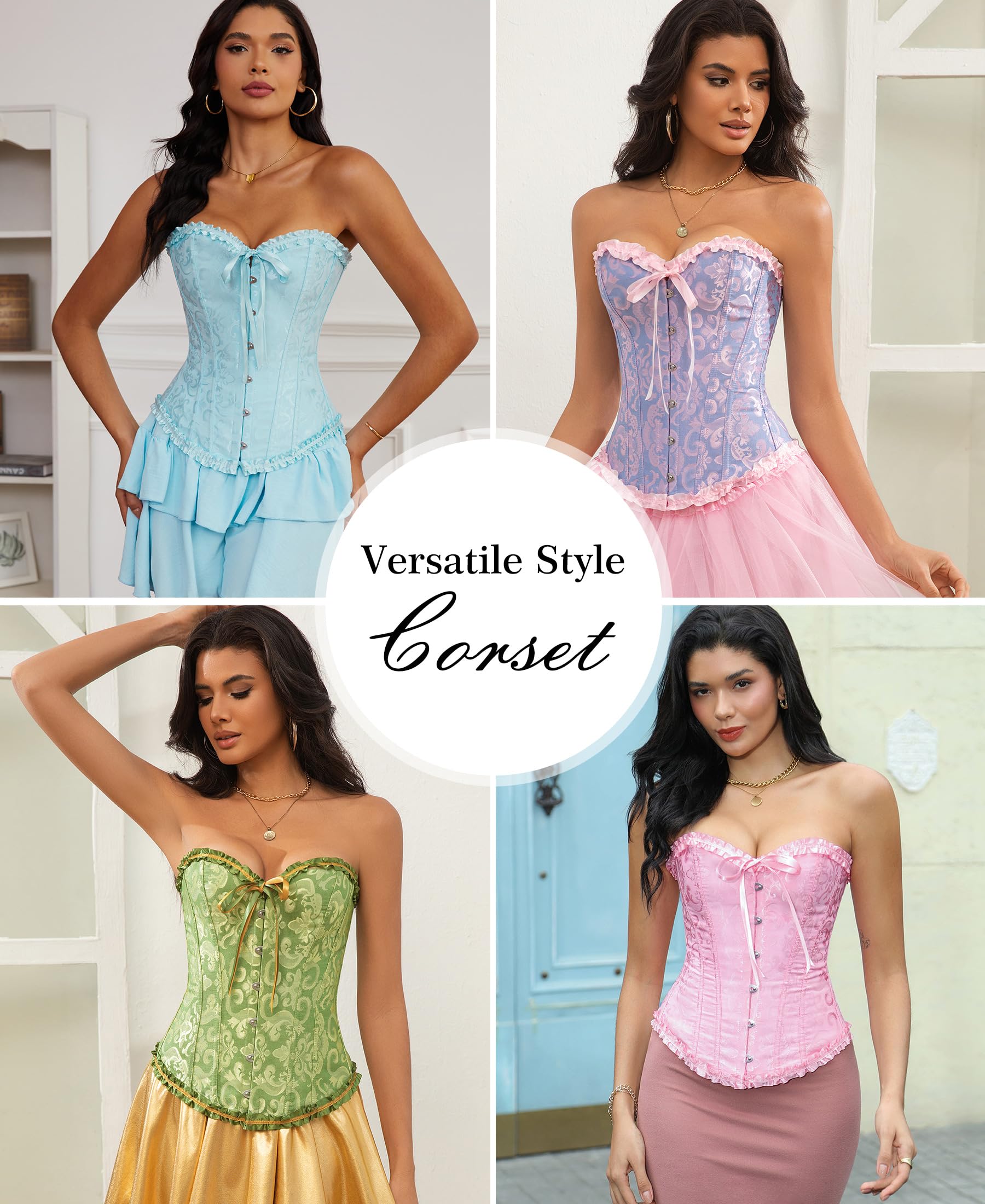 ALL DAY COMFORT: Our overbust corset top is a harmonious blend of comfort and elegance, made with materials that caress your form while ensuring freedom of movement. The waist corset unique 12 plastic bone structure is engineered to support an upright posture, reducing back strain. Designed for wearability from dawn until dusk, the waist cincher corset is the ideal everyday companion. Our lace corset top aligns with your body's needs and your heart's desires