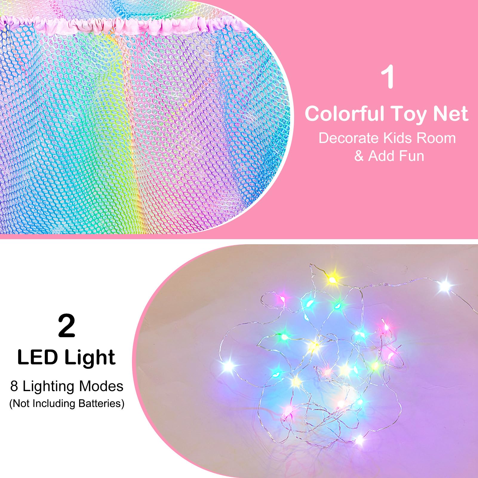 Room Decor: The toy storage organizer is made from premium polyester mesh, sturdy and durable; Unique rainbow color net is suitable for nursery, playroom bedrooms, girls kids room decor