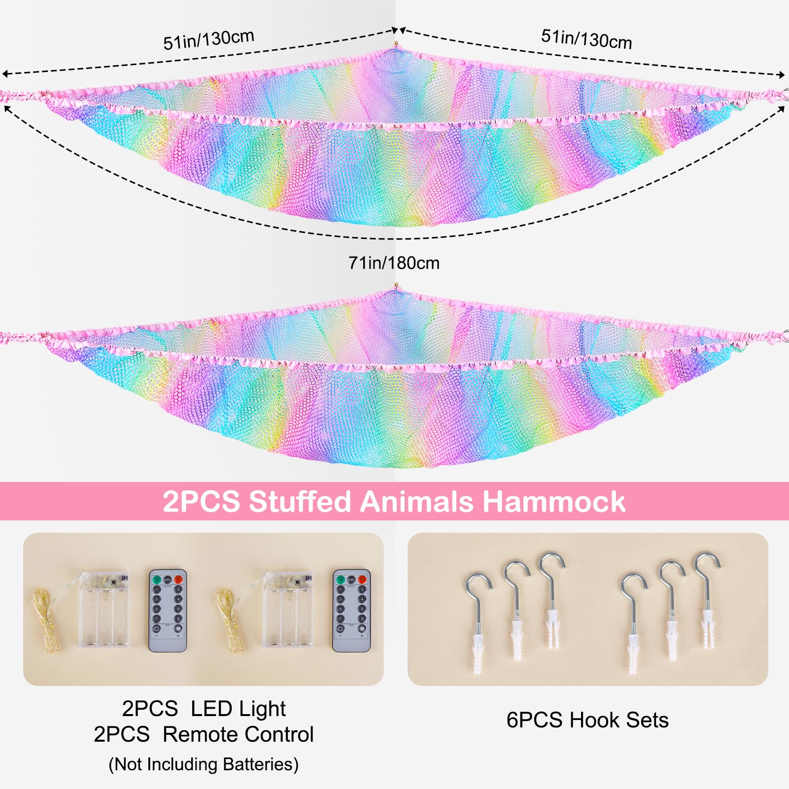 Package Included: 1pcs stuffed animal hammock, 1pcs 118 inches LED string light with battery box; Batteries not included; 3 pcs wall hooks for installation
