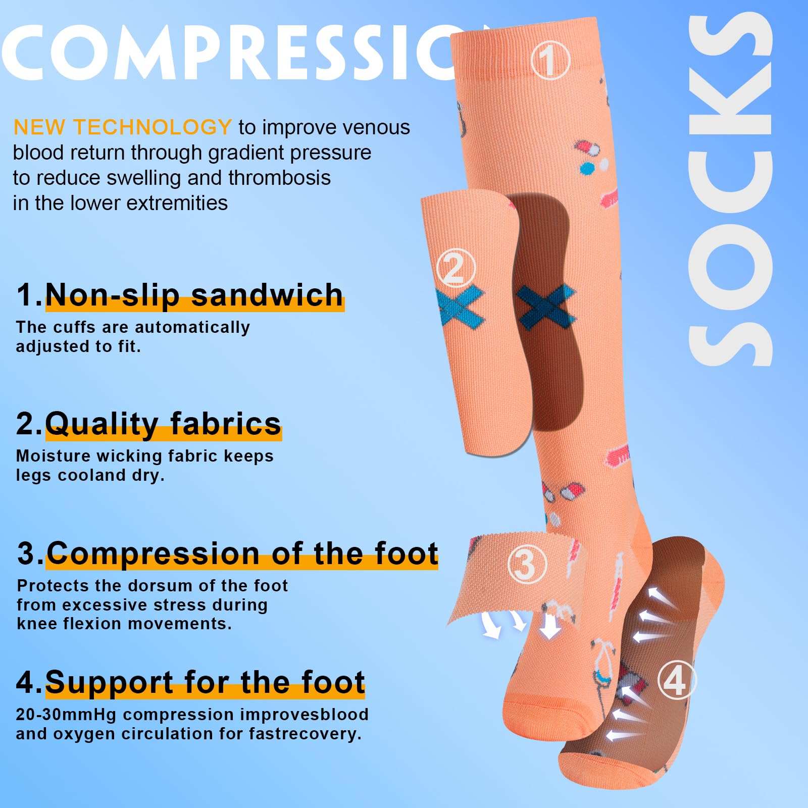 ✅COMPRESSION SOCKS FOR WOMEN & MEN - Copper fiber fabric is very light and Compression socks feels smooth to the skin,So We added Copper fiber to socks to Promote blood circulation in the legs. For Copper compression socks Women on the leg pressure, the doctor's best advice is 20-30 mmhg, through segmented compression support increased blood flow, Socks keep feet and legs fresh all day. It offers the most perfect settlement scheme for those who sit for long period during travel or at work.