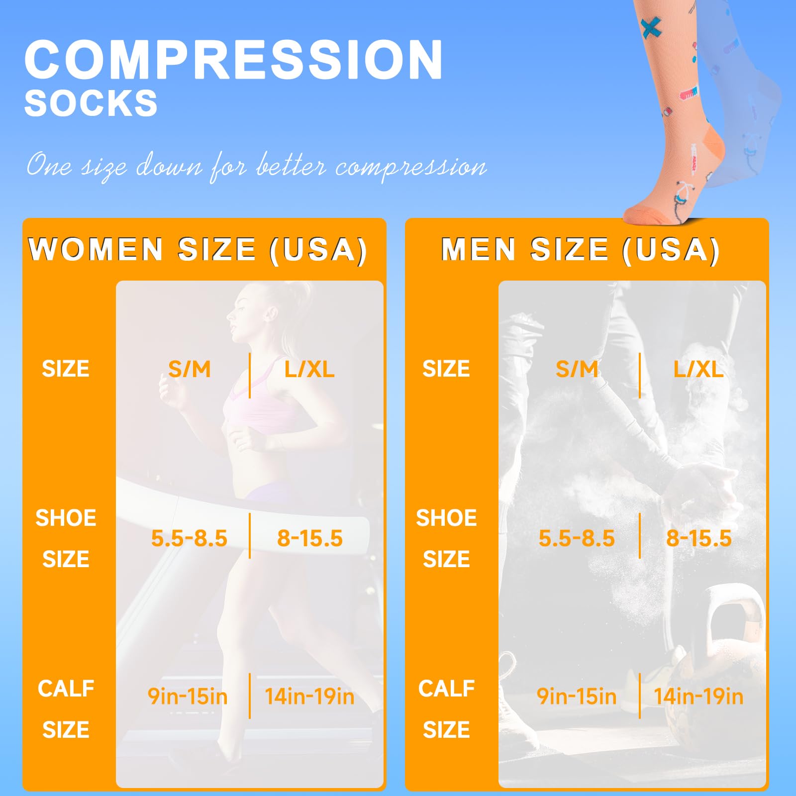 ✅UNIQUE MATERIAL&SIZE - Copper Socks Fiber is a Breathable fiber.It absorbs moisture quickly and releases it into the air from a very small water channel that cannot be seen by the naked eye, so it can suppress the feeling of sticky and sultry skin.The fabric of our products is soaked in copper to absorb moisture and perspiration, which can increase the temperature of your calf in the cold and keep it cool when the temperature rises.And two sizes can let most people choose with confidence.