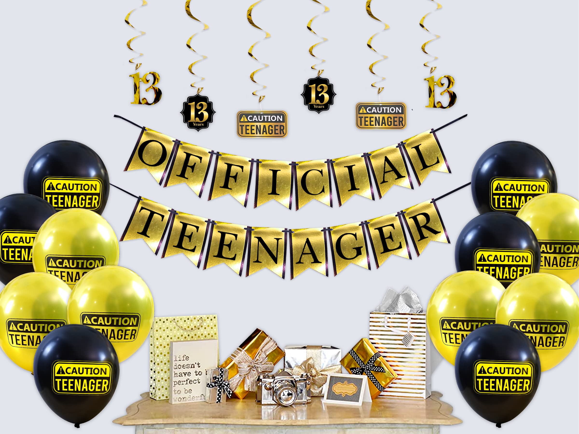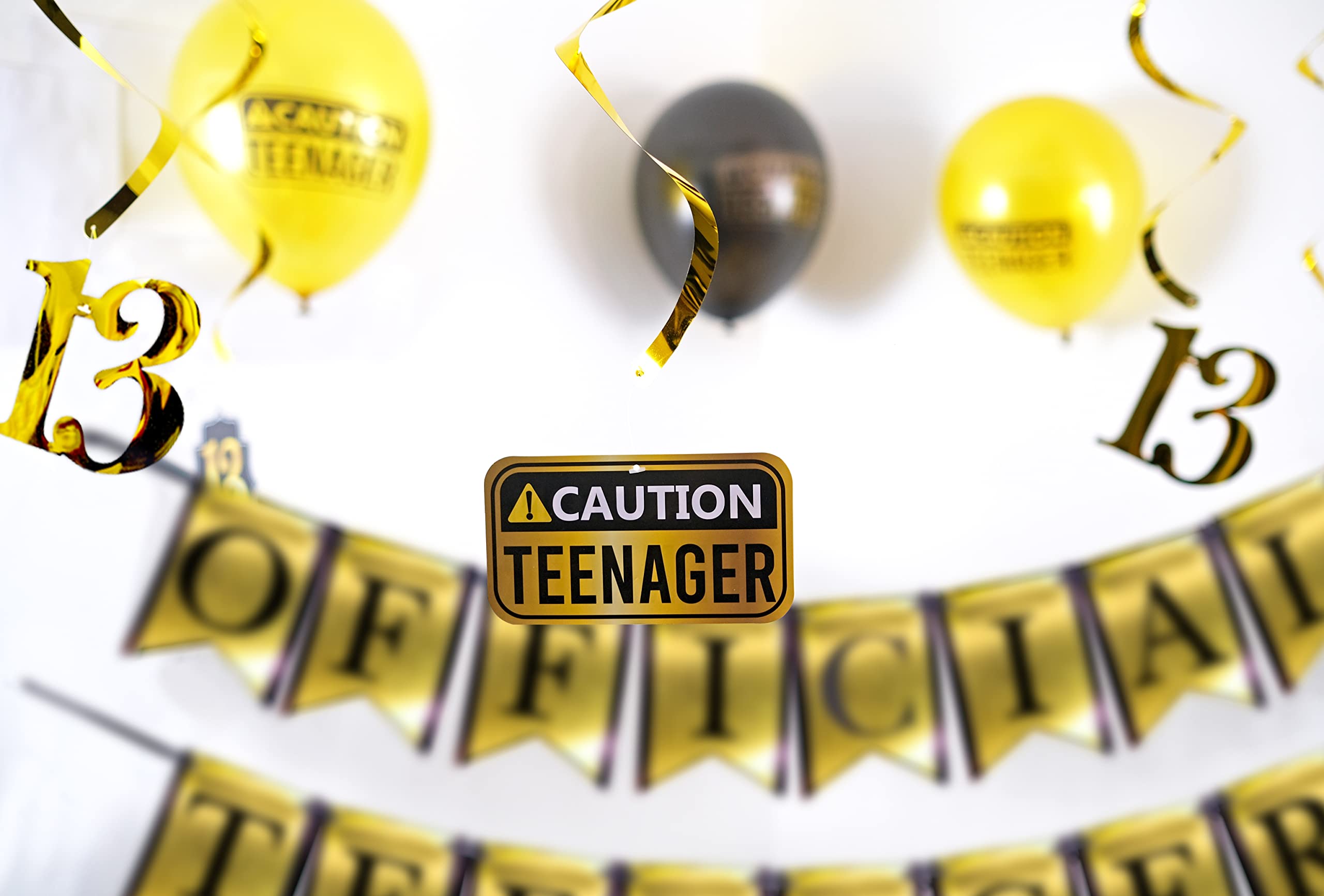 PACK: includes 1 Banner, 12 black and gold WARNING TEENAGER" balloons (12"/30cm) and 7 shiny metallic swirls.