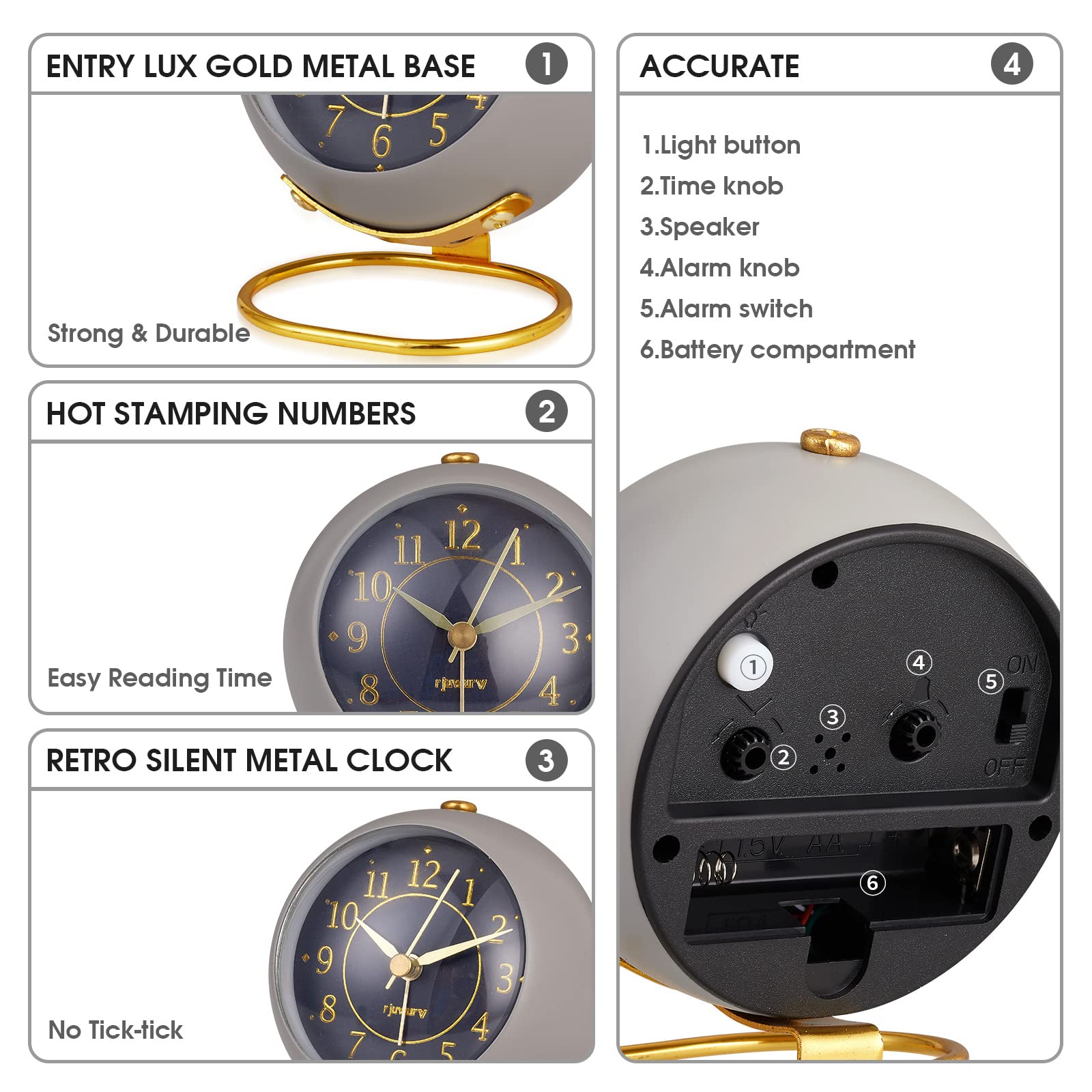 [QUALITY]Metal material, Quality Gold metal base is strong and durable, Hot stamping numbers and Gold hand for easy reading time, Entry lux and Retro design.