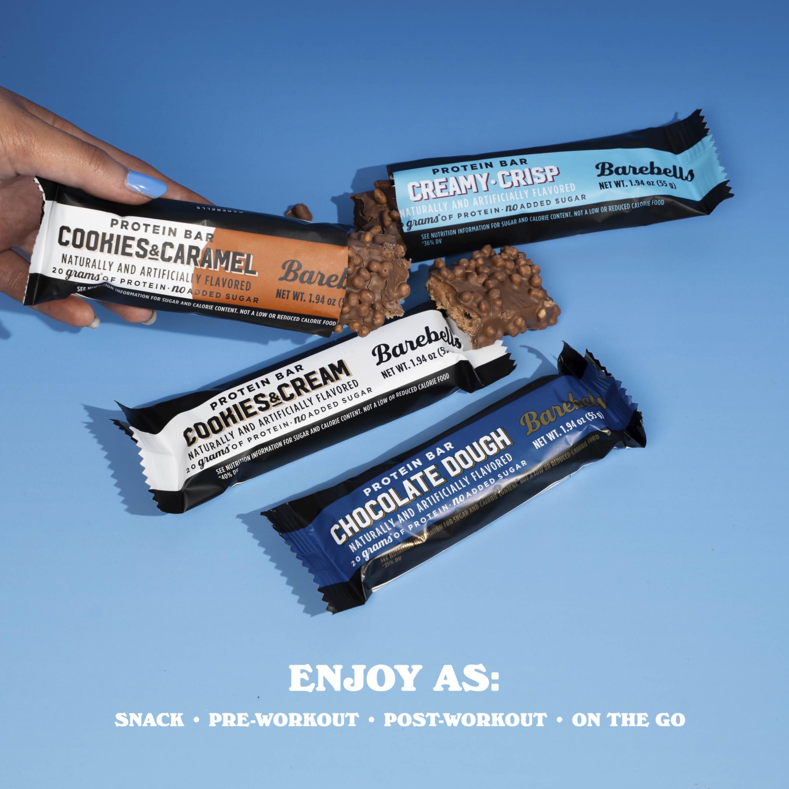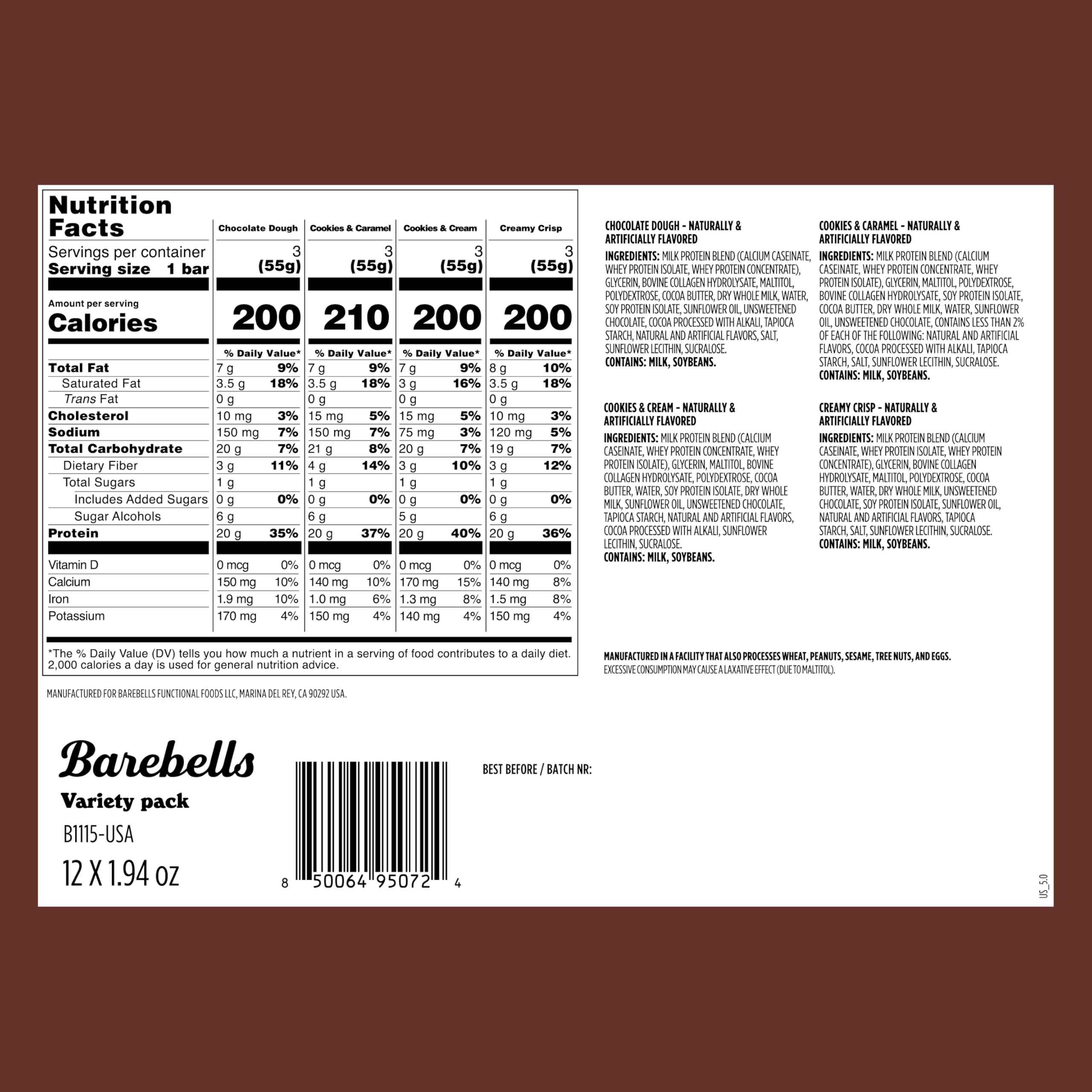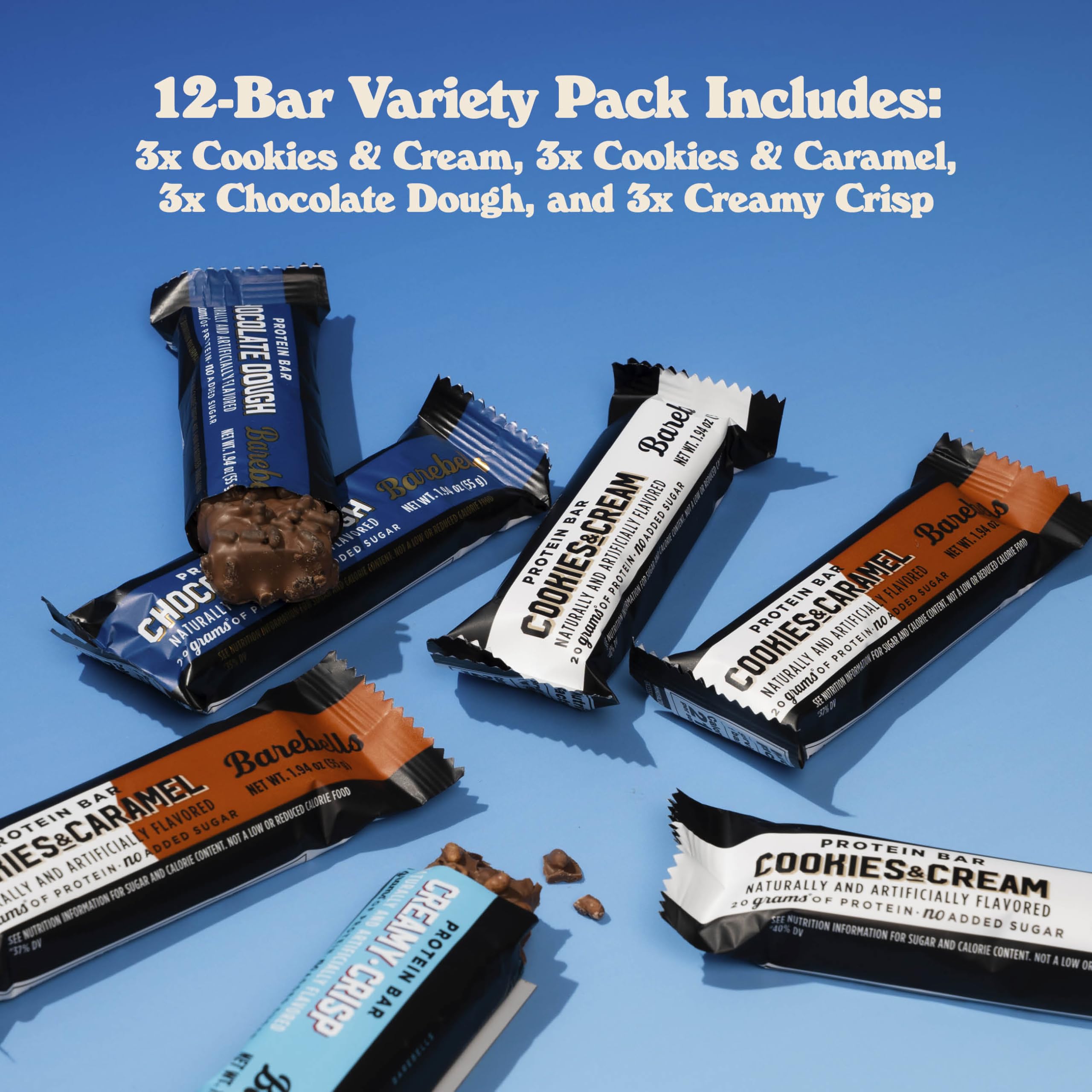 BAREBELLS VARIETY PACK 2.0 – Featuring 12 individual protein bars. A delicious new mix of Barebells favorites, each with 20 grams of protein and no added sugar. This nut-free variety pack includes (3) Cookies & Cream, (3) Cookies & Caramel, (3) Chocolate Dough, and (3) Creamy Crisp – none of which contain nuts. Perfect for those looking to avoid nuts without compromising on taste or texture.