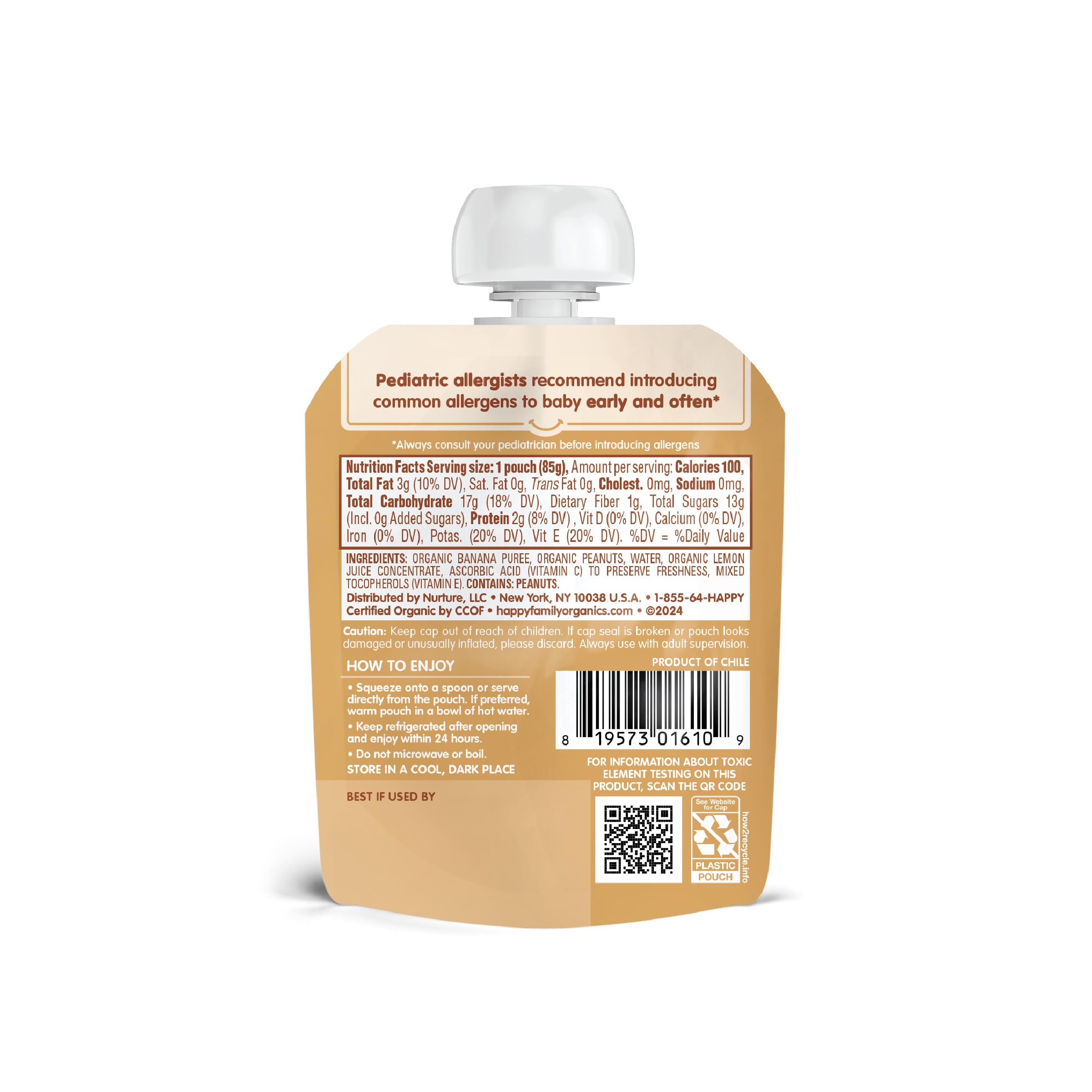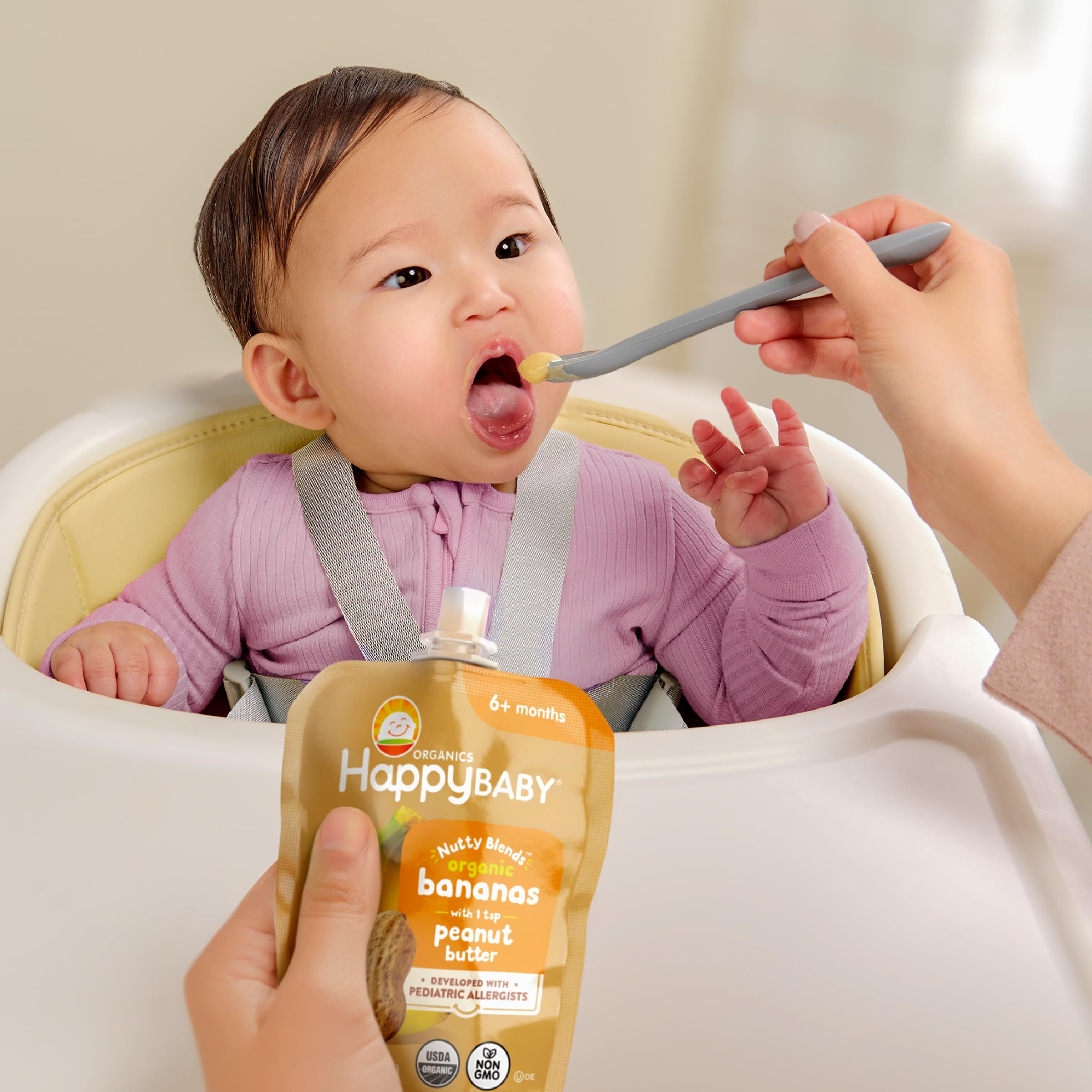 Happy Baby Nutty Blends pouches, developed with pediatric allergists, are designed to help you introduce tree nuts to your baby’s diet gradually and easily. These smooth purees, which combine familiar fruits with 1g of tree nut protein, make it easy for your baby to enjoy new flavors. This delicious blend combines organic banana with 1 teaspoon of peanut butter in a smooth, baby-appropriate texture. Always consult your pediatrician before introducing allergens to your baby. Nutty Blends pouches are produced in a facility separate from Happy Baby Organics nut-free pouches. All Happy Baby products are certified USDA organic, made with ingredients that are non-GMO and grown without the use of toxic persistent pesticides.