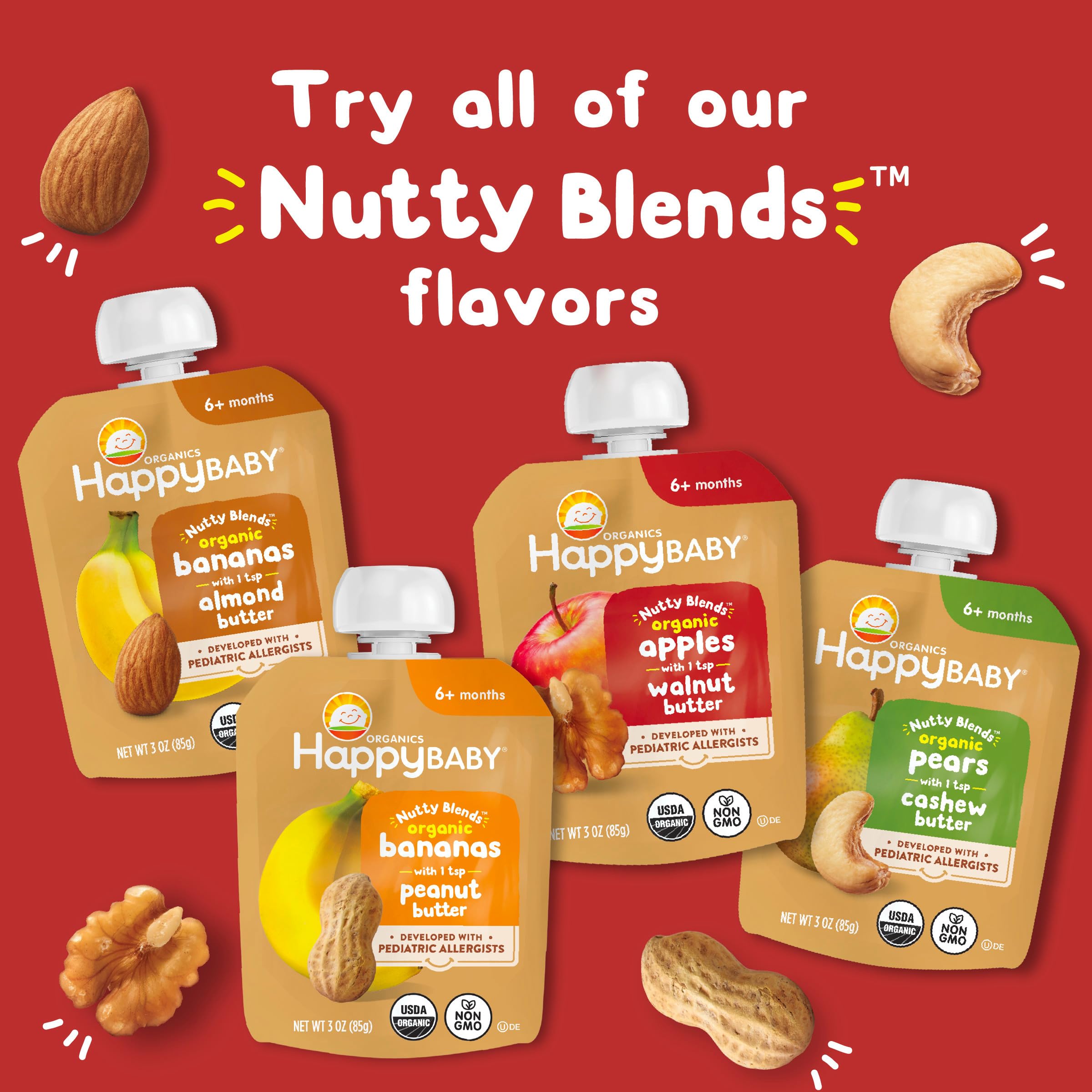 Developed with Pediatric Allergists: Happy Baby Nutty Blends are the developed with pediatric allergists, to help introduce and include nuts in baby’s diet. The Dietary Guidelines recommend introducing allergens early & often