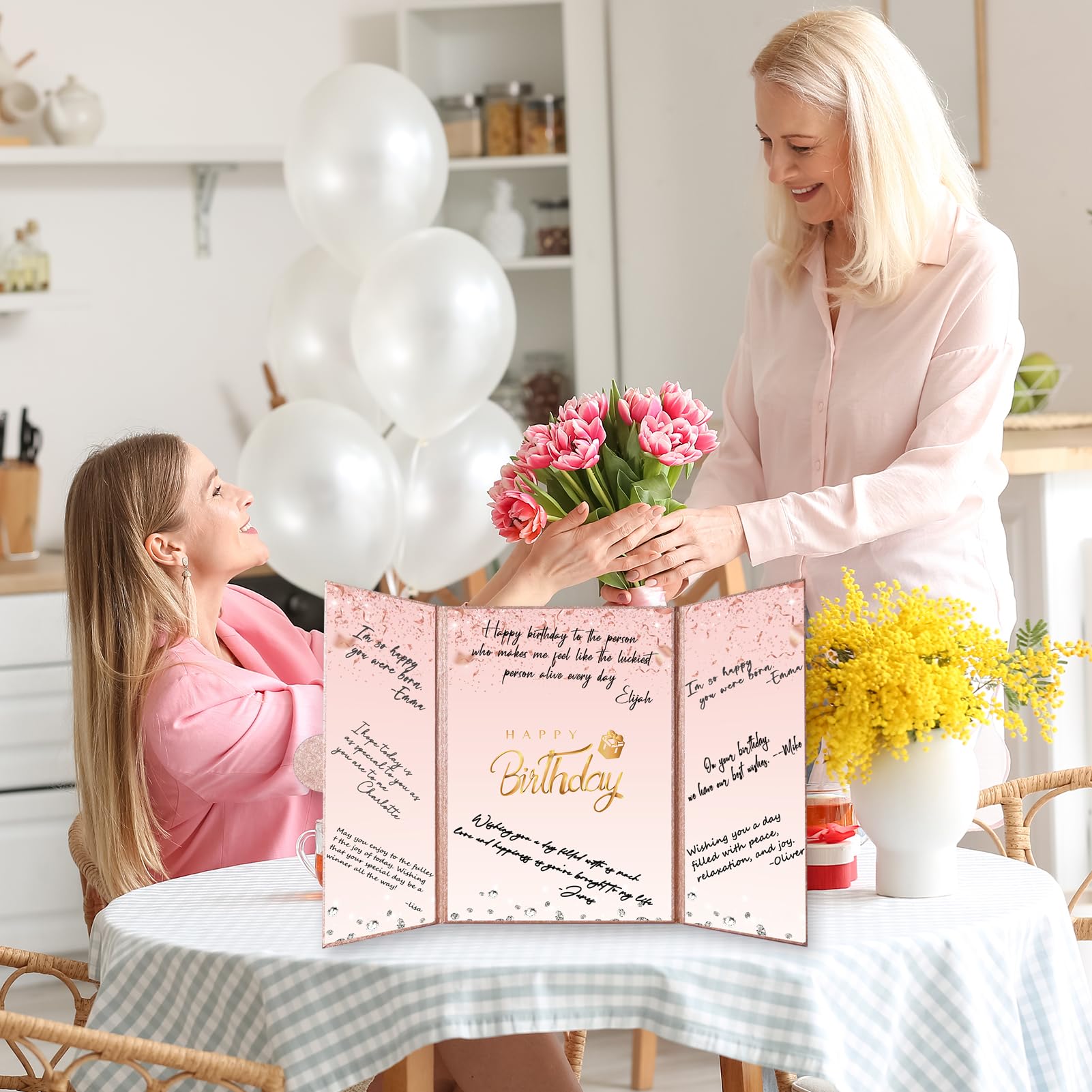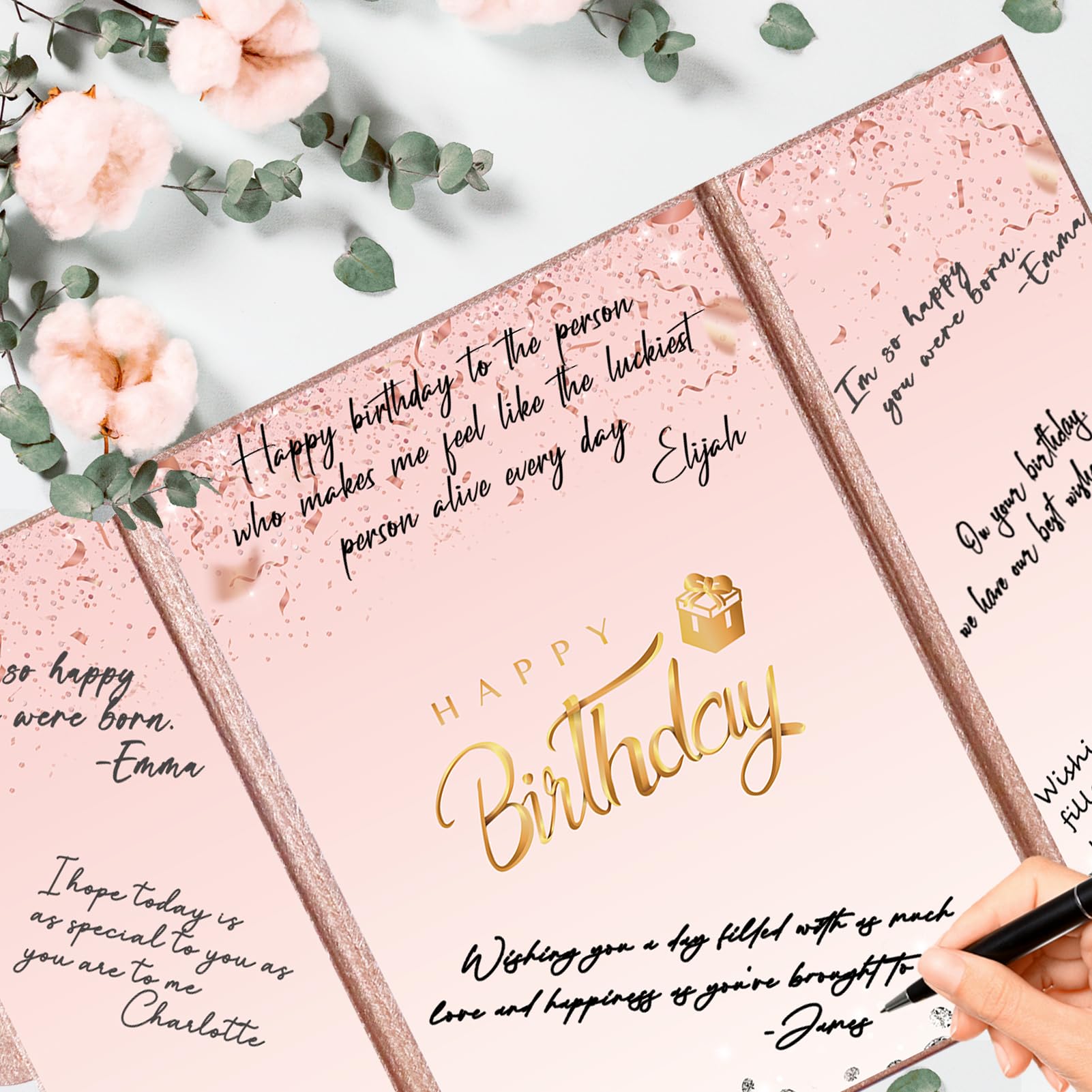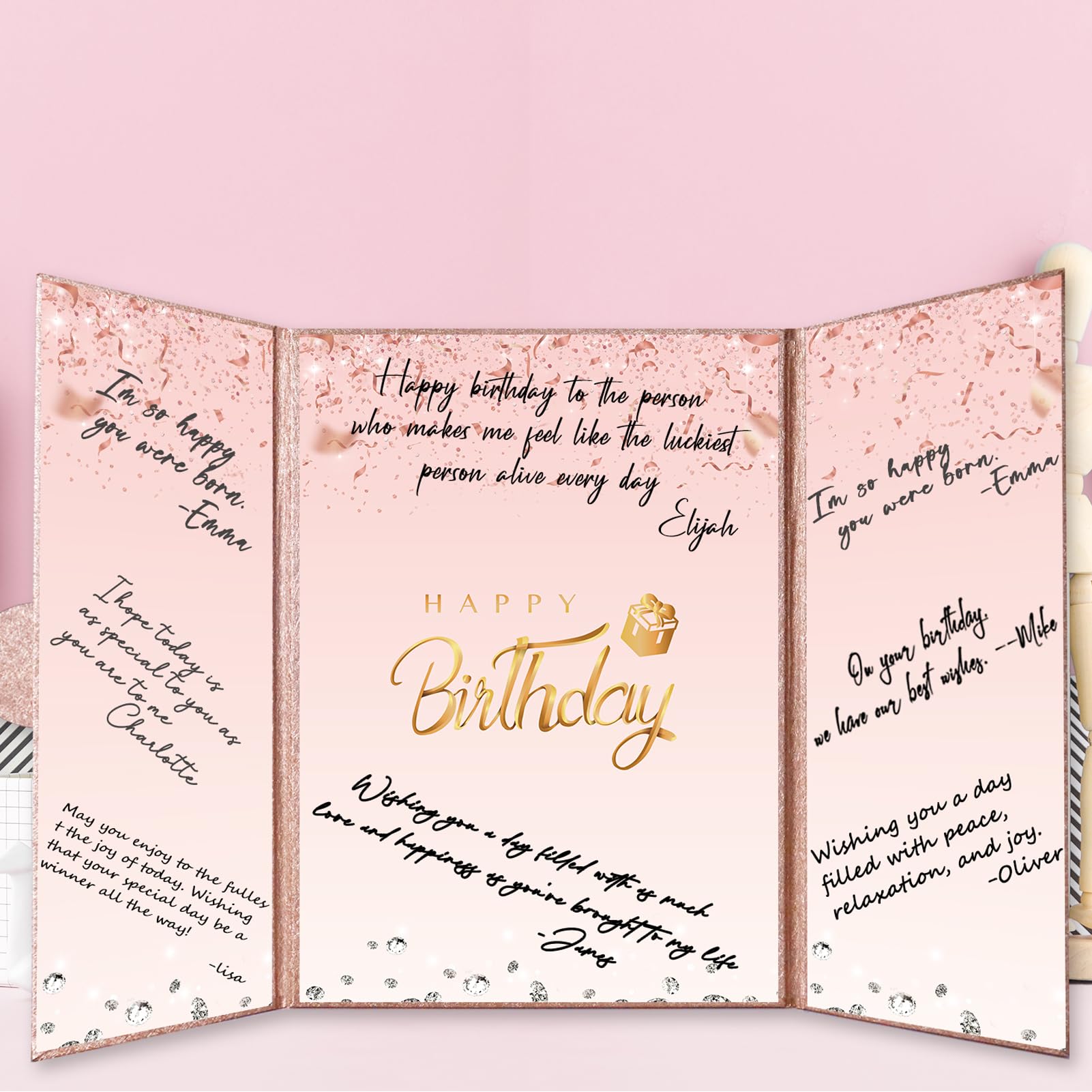 【Exquisite Design】- The rose gold certificate has a gilded badge on the cover, and the inside of the signature certificate is divided into three parts, the middle page is printed with the message 'Happy Birthday'. This rose gold birthday signature board can be opened directly and stand on the table. Tips: Without pen.