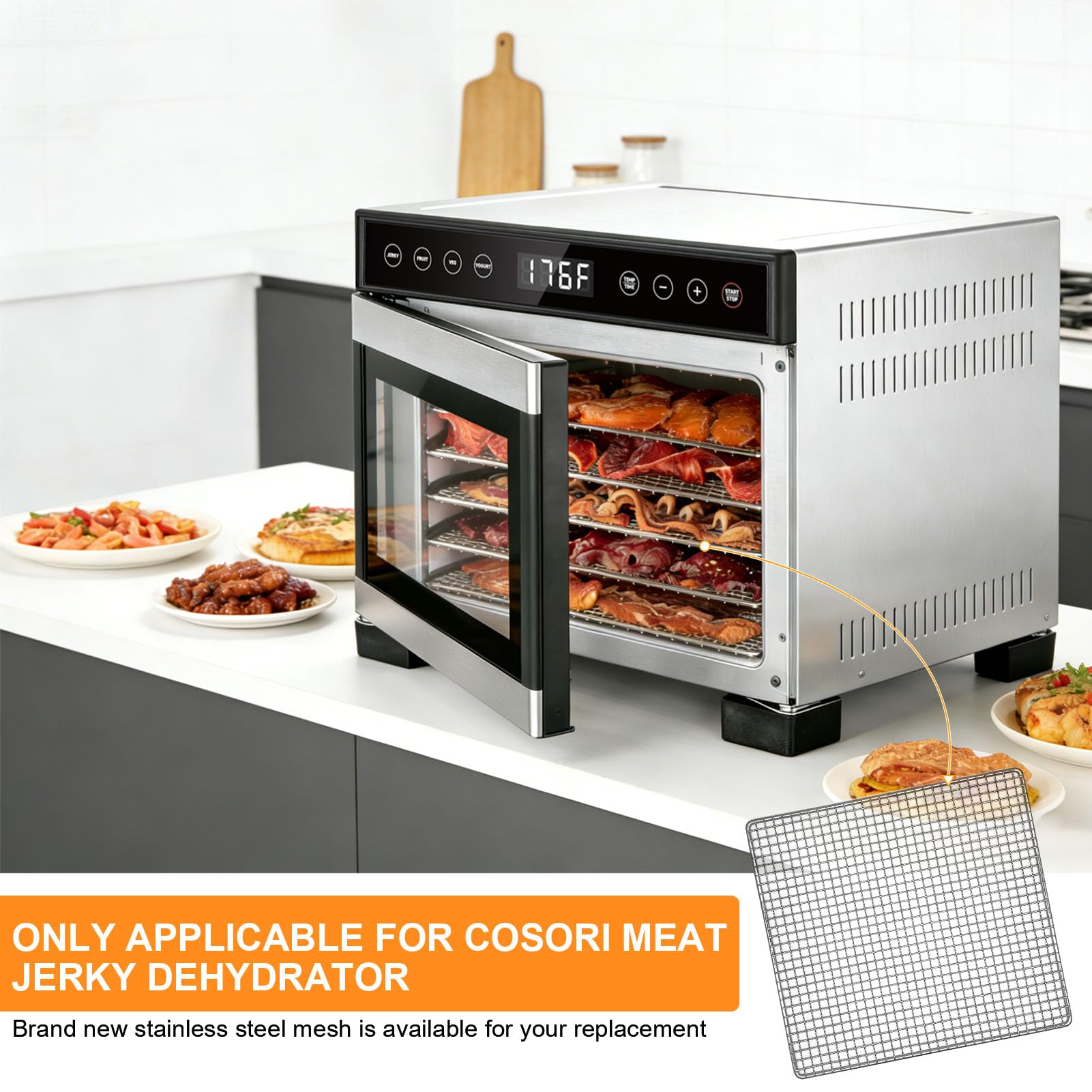 Size and Compatibility: The dehydrator tray measures 9.6" L x 9" W x 0.8" H. It is designed for COSORI food dehydrator 5 stainless steel trays dryer machine, also compatible with other food dehydrators of the same size