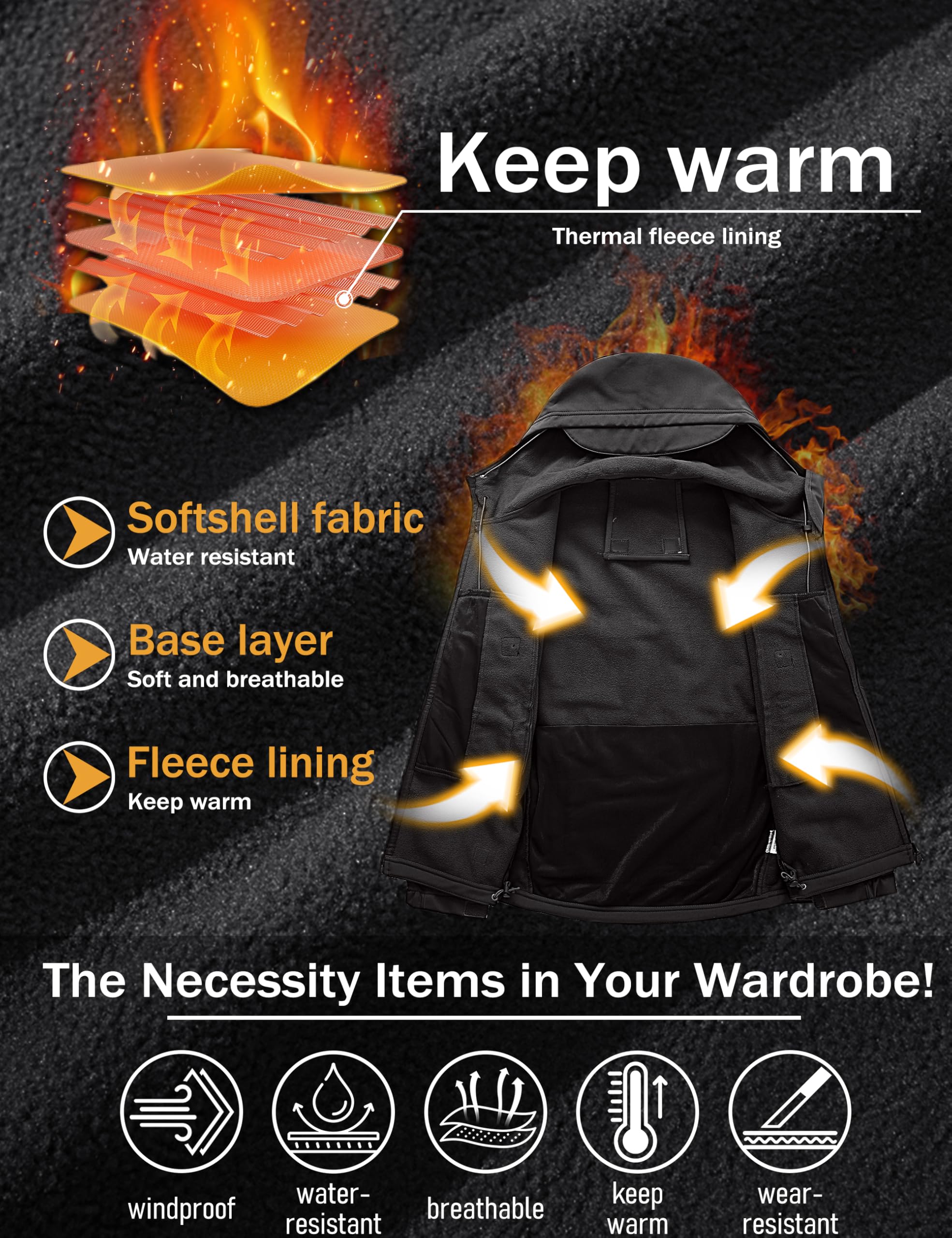 The softshell fabric with warm inner micro fleece. The outer layer features waterproof and windproof, while the inner layer keeps you warm all day.
