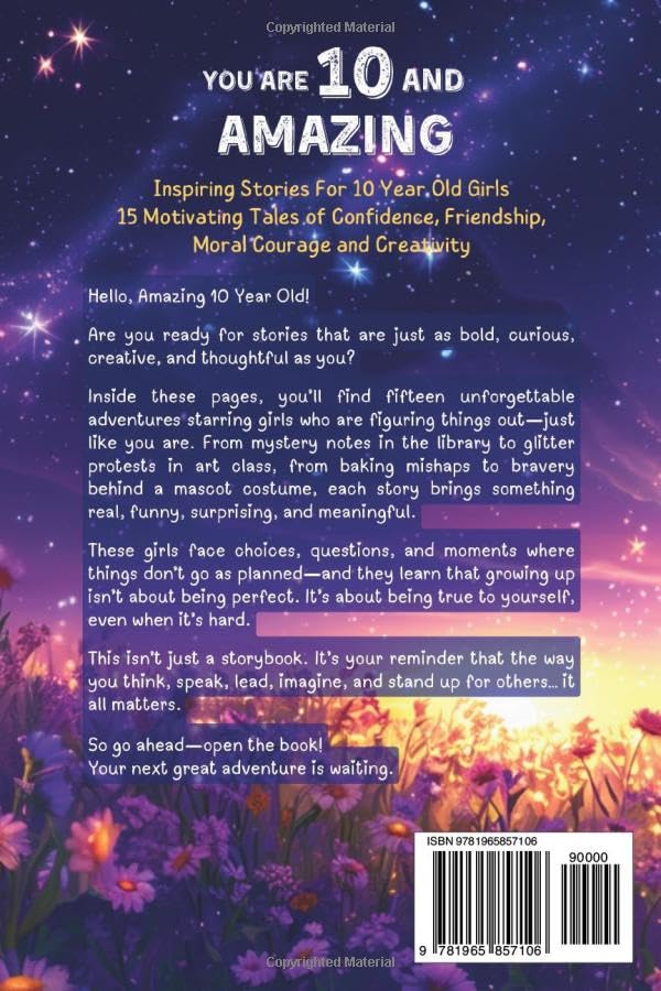 Give your 10-year-old the priceless gift of courage, creativity, and confidence—right when she needs it most. At age ten, something magical happens. Your child is no longer little—but not quite a teen. She’s in that powerful in-between, where friendships deepen, challenges get trickier, and choices start to matter more. It’s a time of big feelings, bold ideas, and quiet questions she may not always know how to ask. Maybe she’s been left out of a birthday party and isn’t sure how to feel about it. Maybe she’s caught between being herself and wanting to fit in. Maybe she’s bursting with ideas but unsure if her voice matters. And maybe—just maybe—she’s starting to realize how brave she truly is. You can’t always be there to guide every moment. But you can give her something that will. This collection of 15 unforgettable stories is here to cheer her on, lift her up, and remind her just how powerful her kindness, creativity, and voice can be. Inside, she’ll find: Fifteen thoughtful, relatable stories starring girls just like her—curious, funny, thoughtful, and strong in all kinds of ways Real-life moments turned into fun, page-turning adventures—from glitter protests and friendship maps to mascot mysteries, baking disasters, and surf camp wipeouts Gentle but powerful life lessons woven into each tale, helping her explore honesty, inclusion, bravery, resilience, self-expression, leadership, and more Characters who learn that it’s okay to speak up, to mess up, to stand out, or to change their minds—and that true confidence comes from within A perfect balance of heart, humor, and inspiration, written in a voice that truly “gets” what it means to be 10 Whether it’s bedtime or a quiet afternoon read, these stories will spark conversation, ignite imagination, and leave her feeling proud of who she is—and excited about who she’s becoming. Each story ends with a message beginning with “Now that you are 10…”—an age-specific reminder that she’s growing wiser, stronger, and more herself every day. These are more than just stories. They’re a mirror, a map, and a gentle nudge forward for every girl who’s learning to trust her own path. If you’re ready to give your 10-year-old the kind of encouragement that sticks with her—long after the story ends—scroll up and click “Add to Cart.” Let her next great adventure begin.