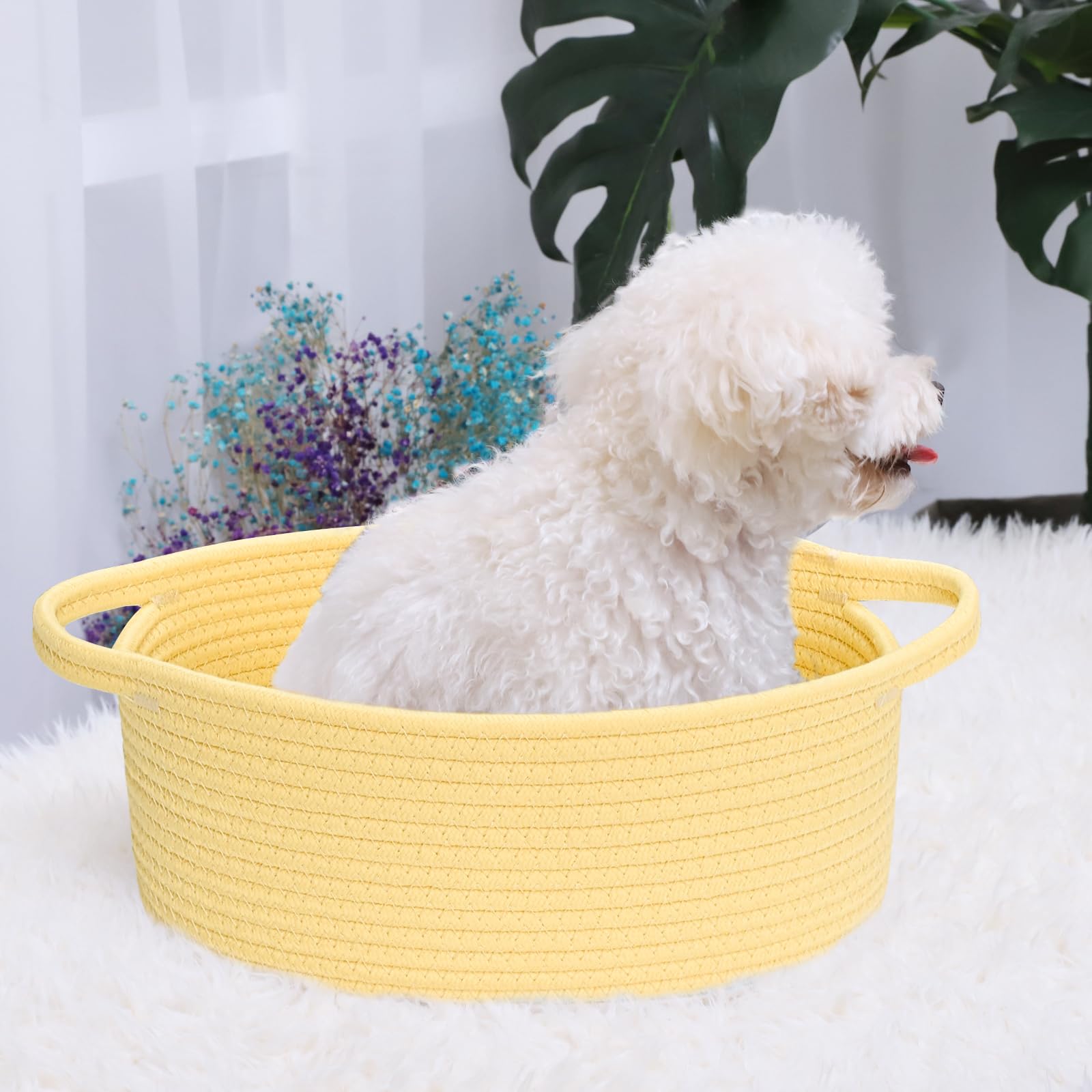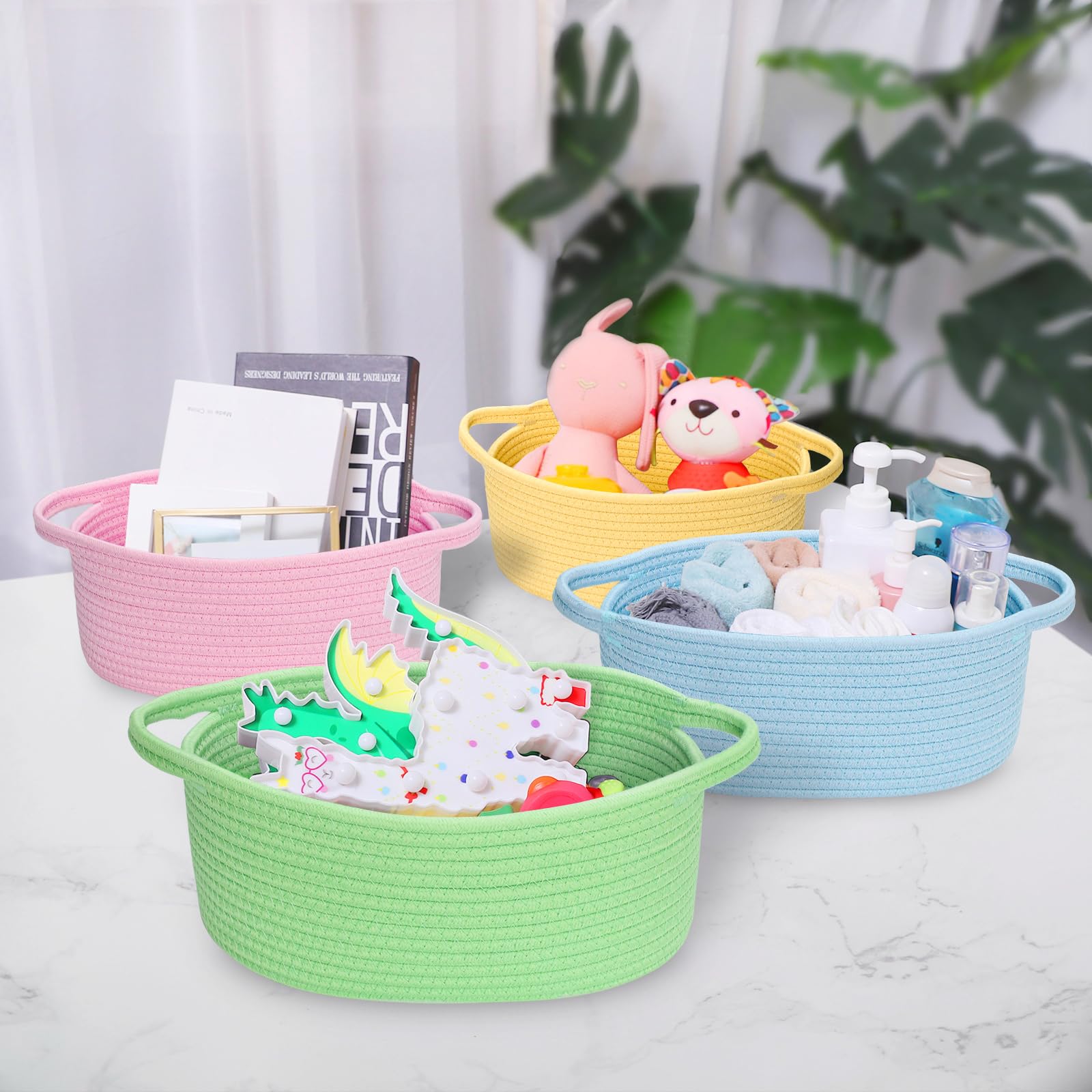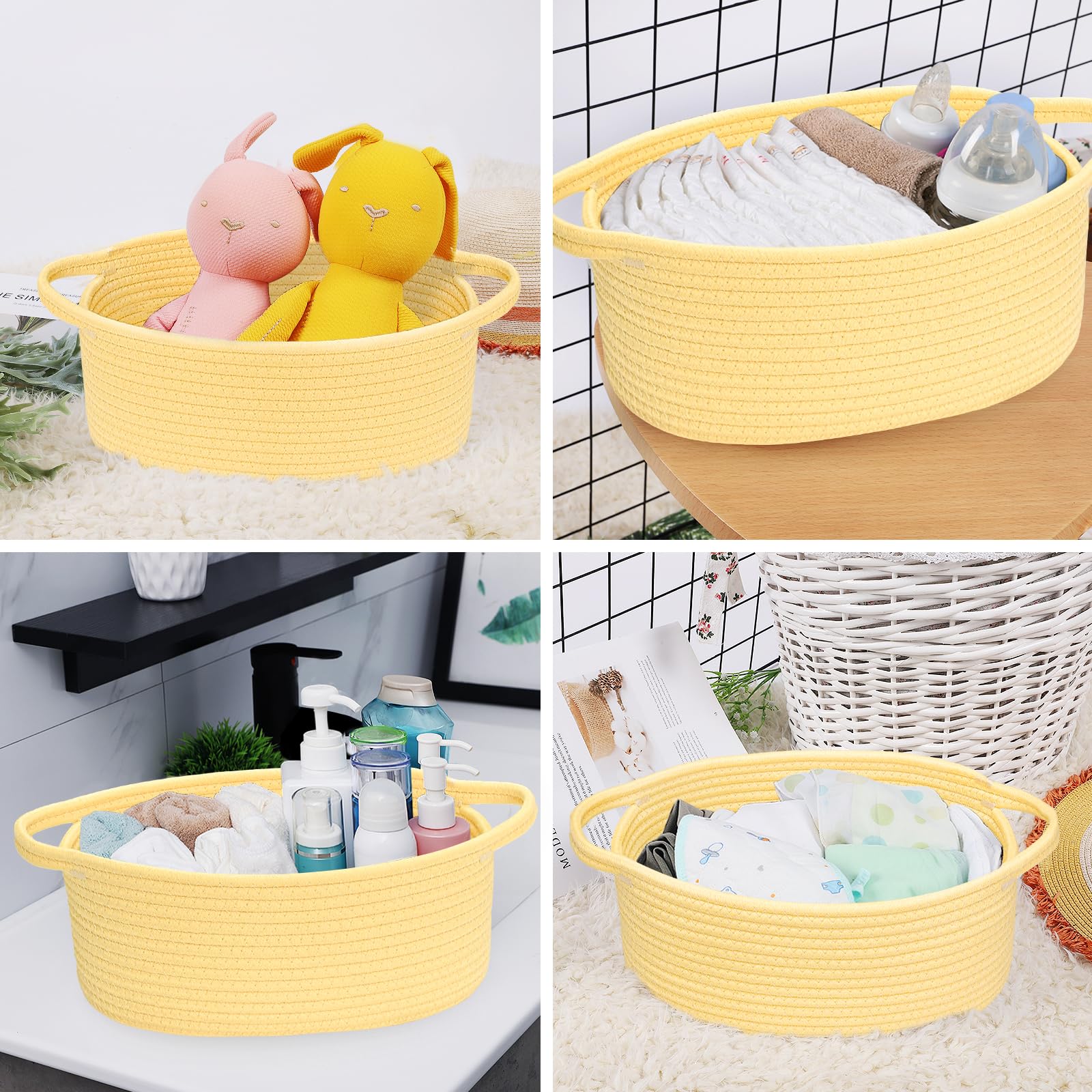 Small baskets for organizing, keep spa essential, fruits, remote control, towel, diaper, blanket, toy, nursery necessaries, make-ups organized in order. Even can be used as dog cat basket