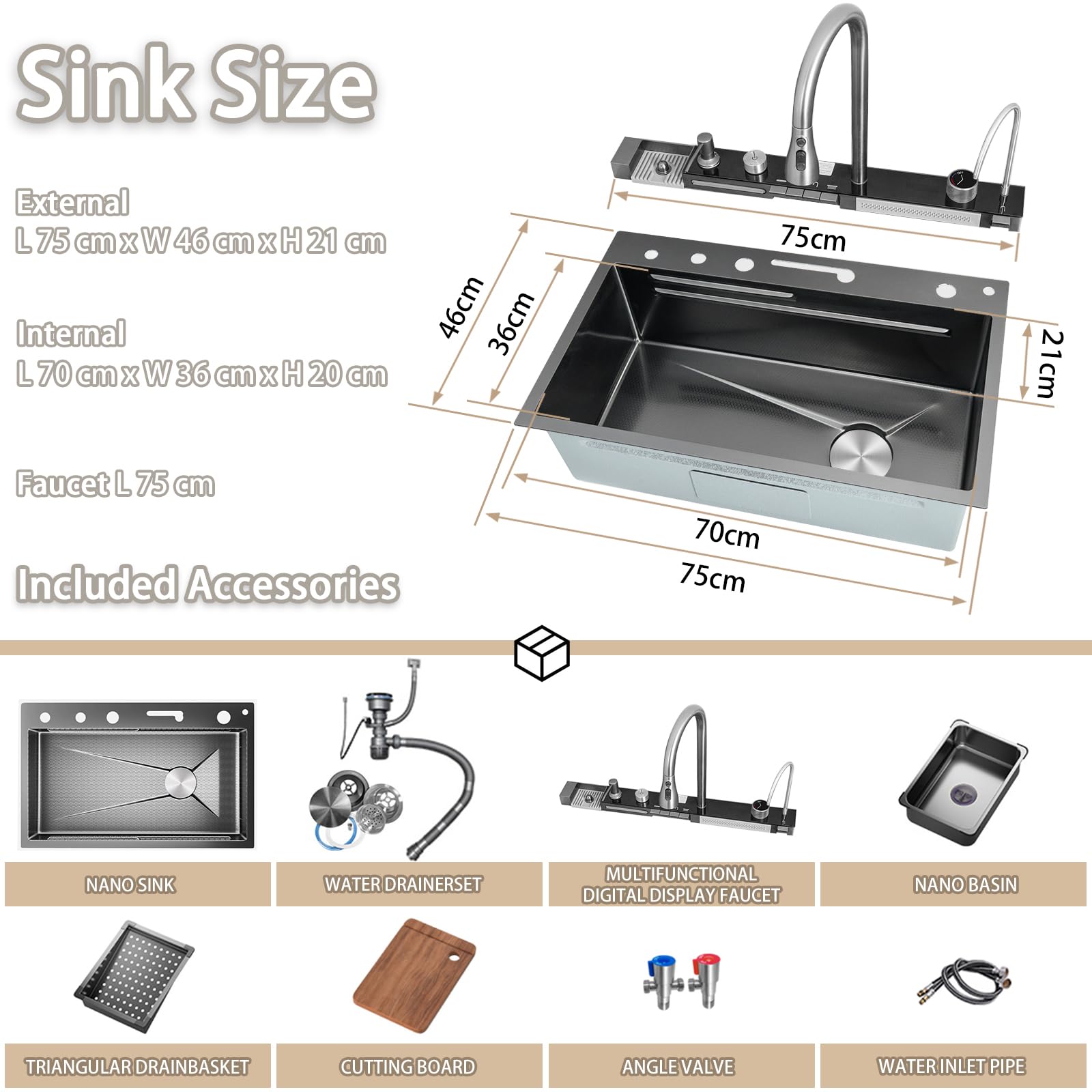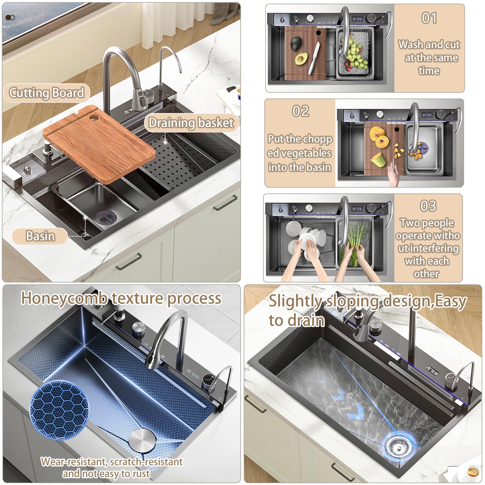 【Complete kitchen solution】Discover the power of our innovative kitchen sink with nano sink, multifunctional one-piece faucet, nano basin-in-basin, cutting board, triangular drain basket, hot and cold corner valve and inlet pipe.