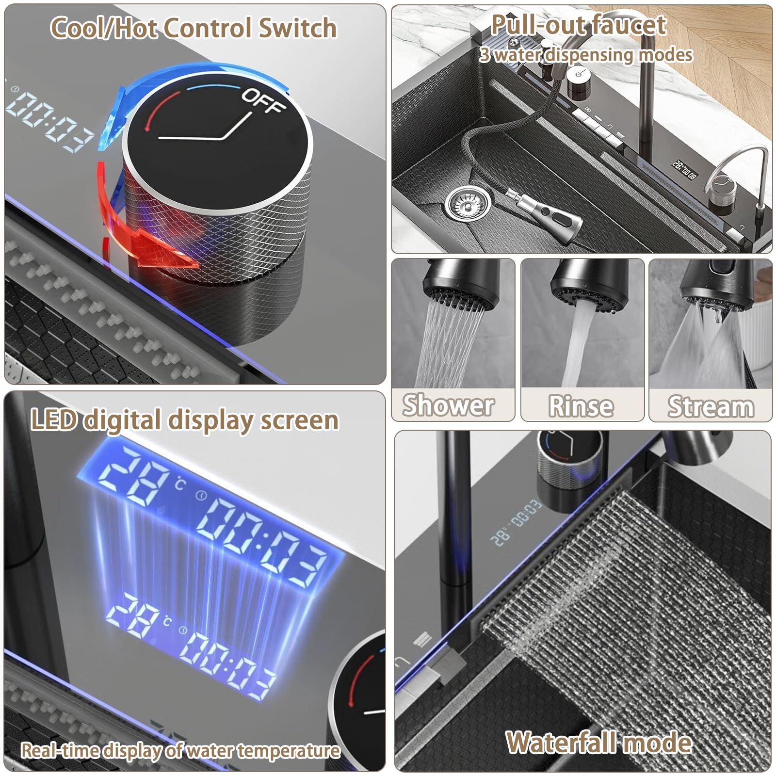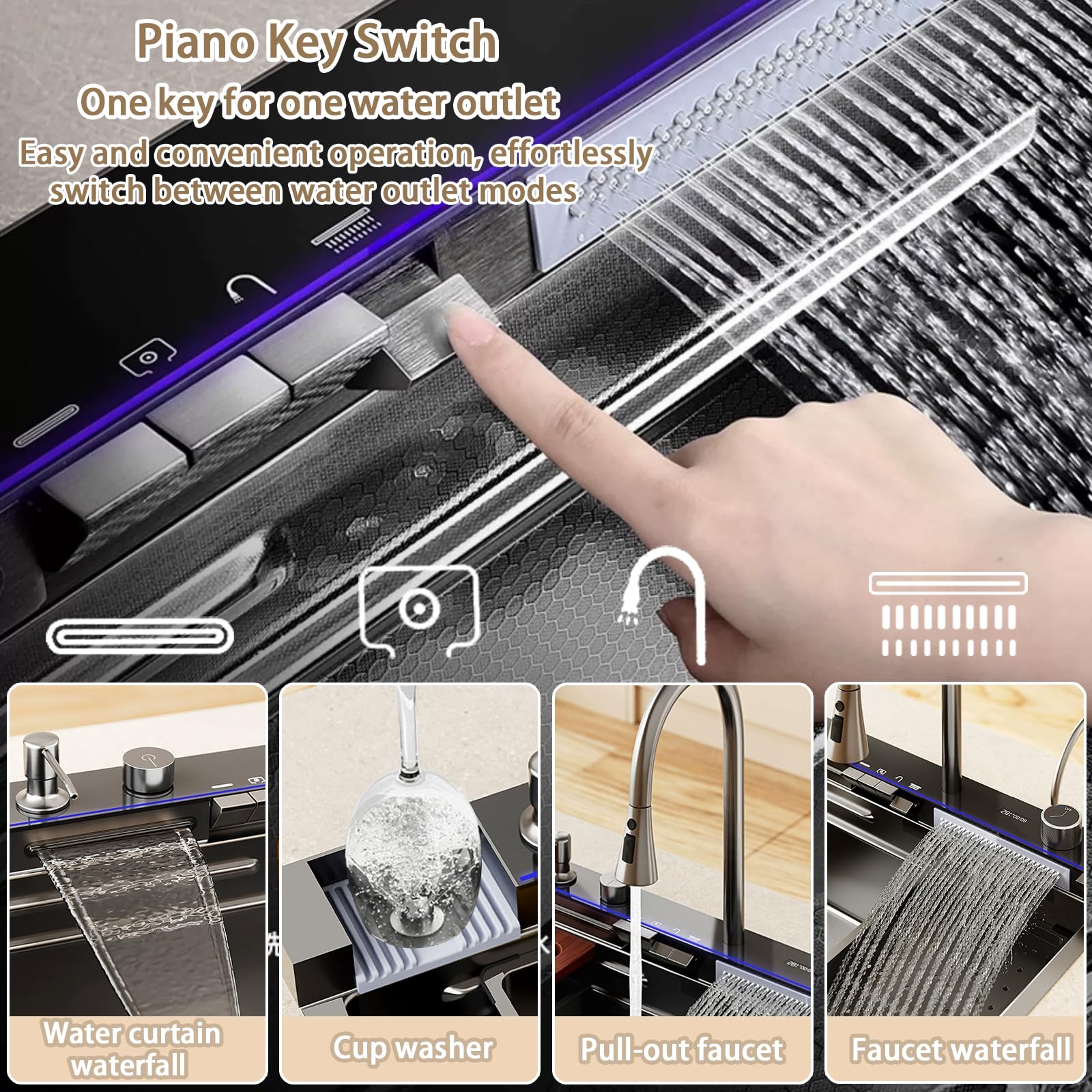 【State-of-the-art integrated technology】Experience the faucet of the future with cup washer, curtain waterfall, soap dispenser, table control, pull-out faucet and digital waterfall. Perfect combination of functionality and aesthetics.